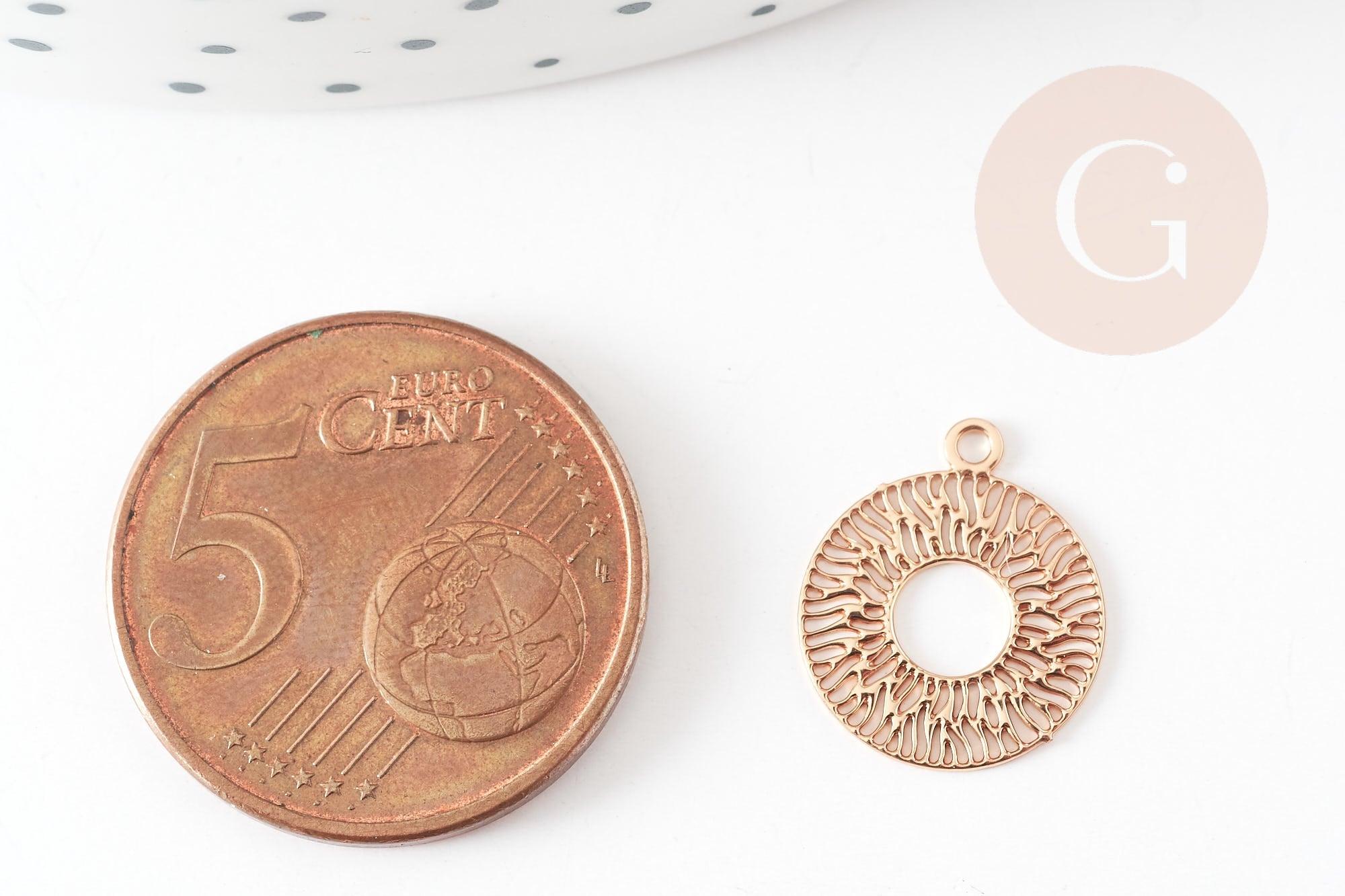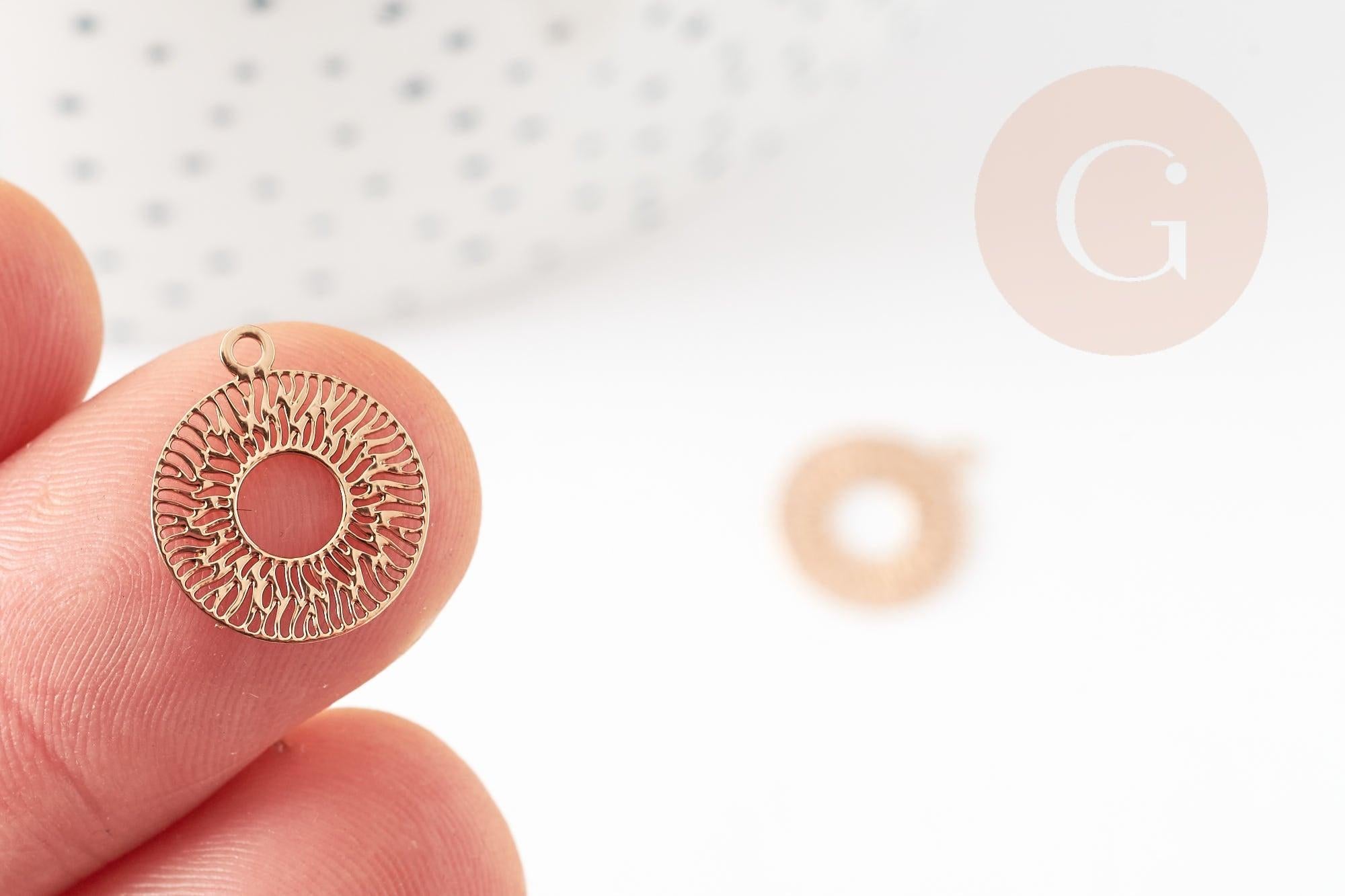 Colgante redondo de filigrana estampado con patrón geométrico calado en latón chapado en oro claro, 14 mm, colgante ligero, diseño de joyería dorada, x2 (G9294)