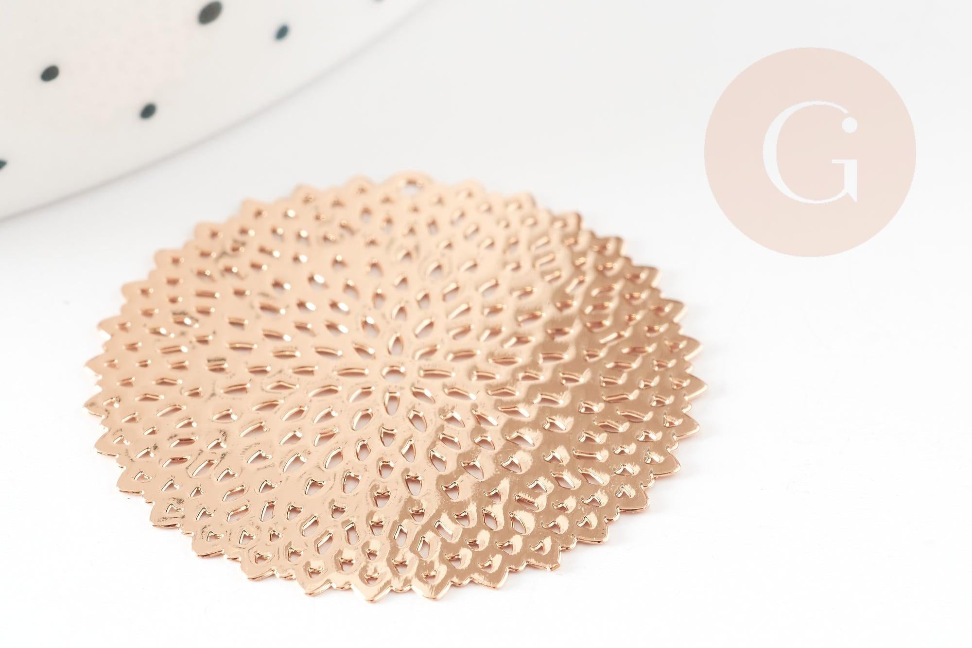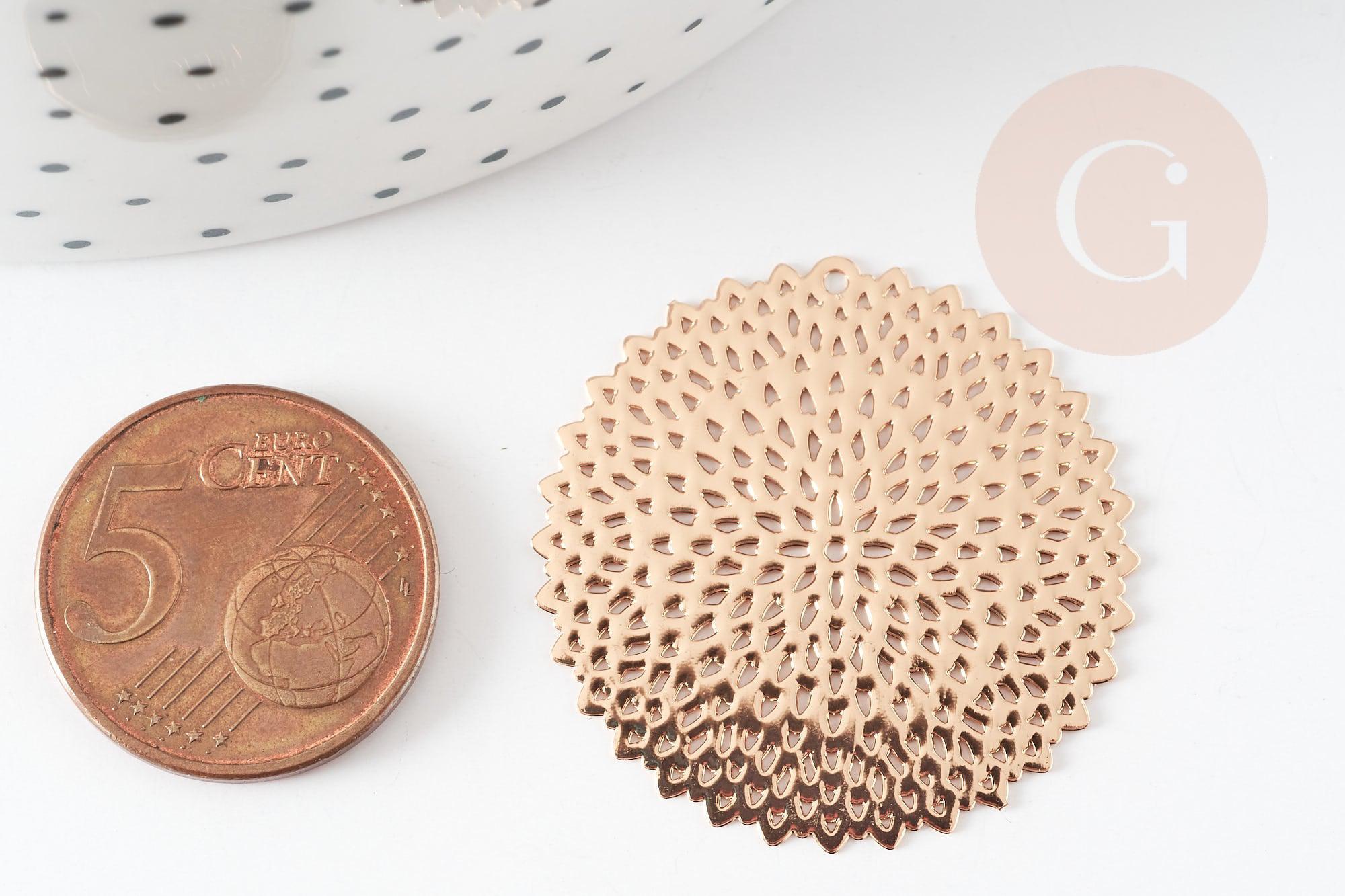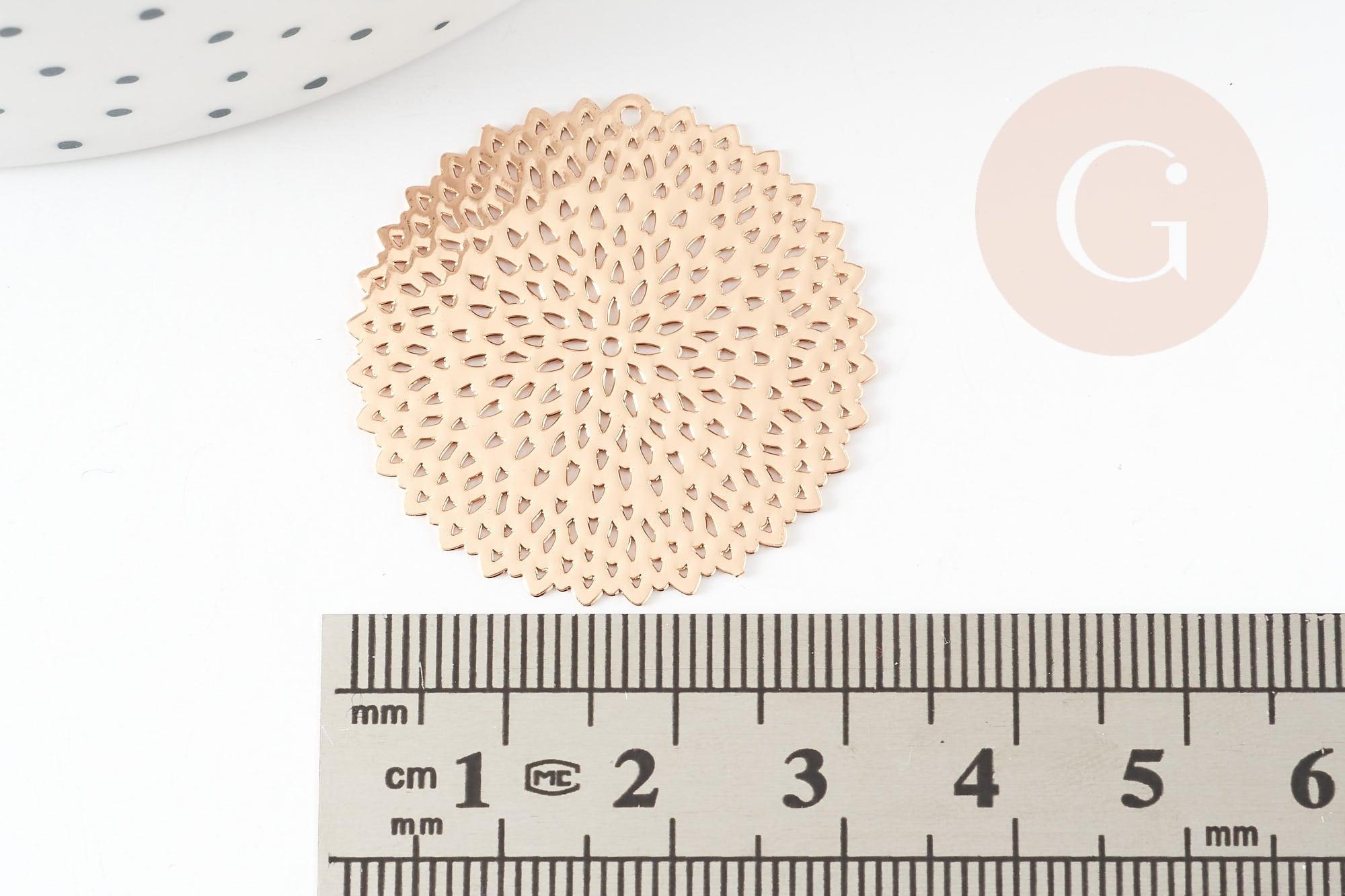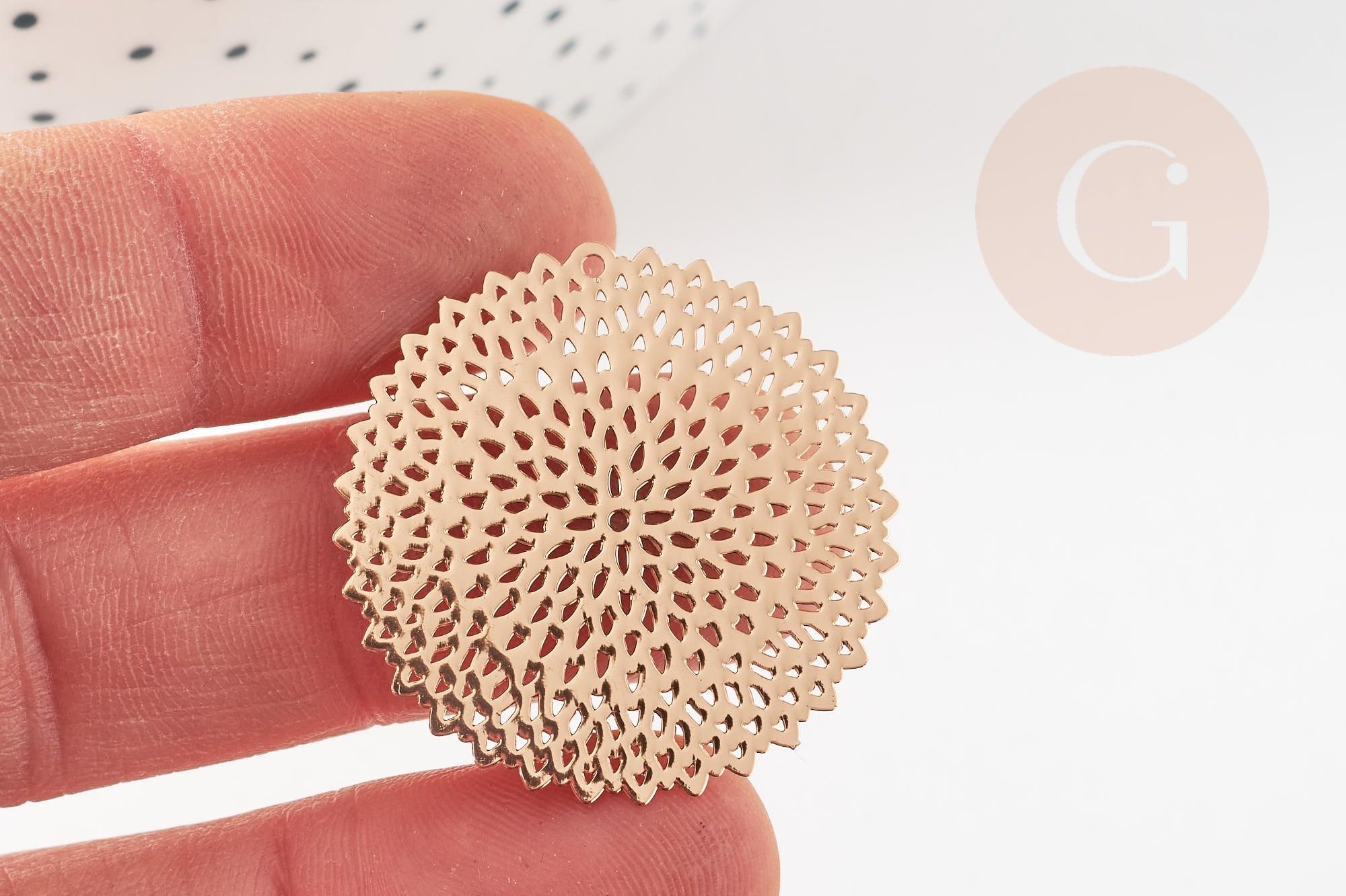 Descubra nuestro colgante redondo con estampado de filigrana en forma de roseta en latón bañado en oro de 32 mm. Este colgante combina elegancia y ligereza para crear una pieza de joyería única.