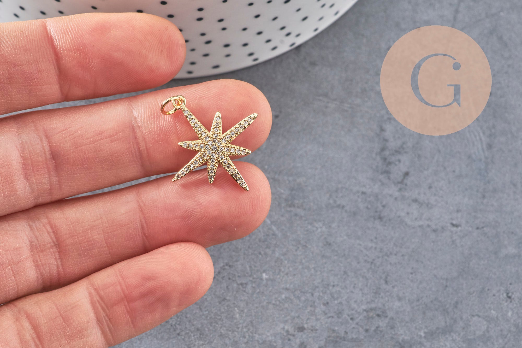 Colgante de estrella del norte de latón dorado decorado con circonita blanca en el centro.