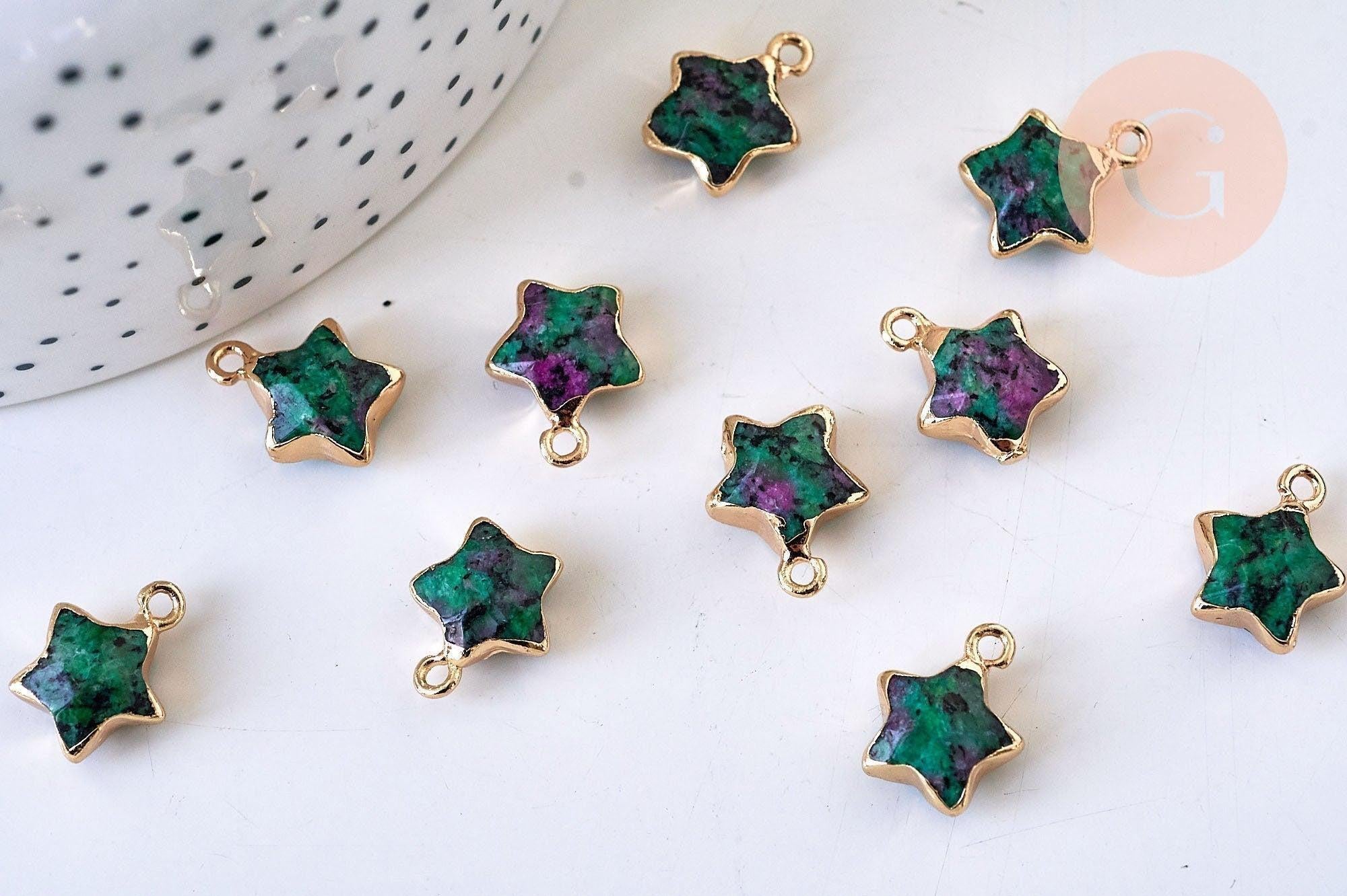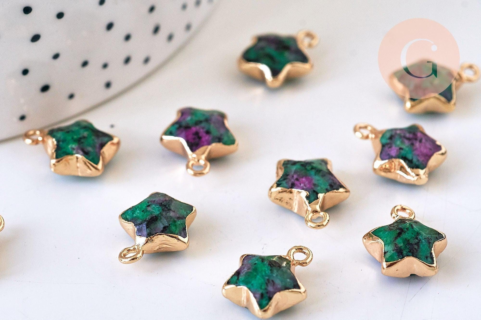 Déjate seducir por este pequeño colgante estrella de rubí sobre zoisita natural con su soporte dorado.