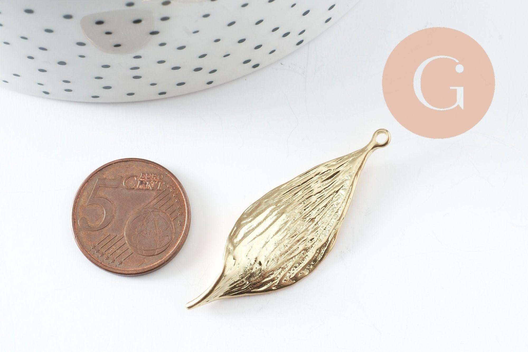 Colgante hoja de latón crudo 46,5 mm, hoja dorada para creación de joyas, x2 (G7622)