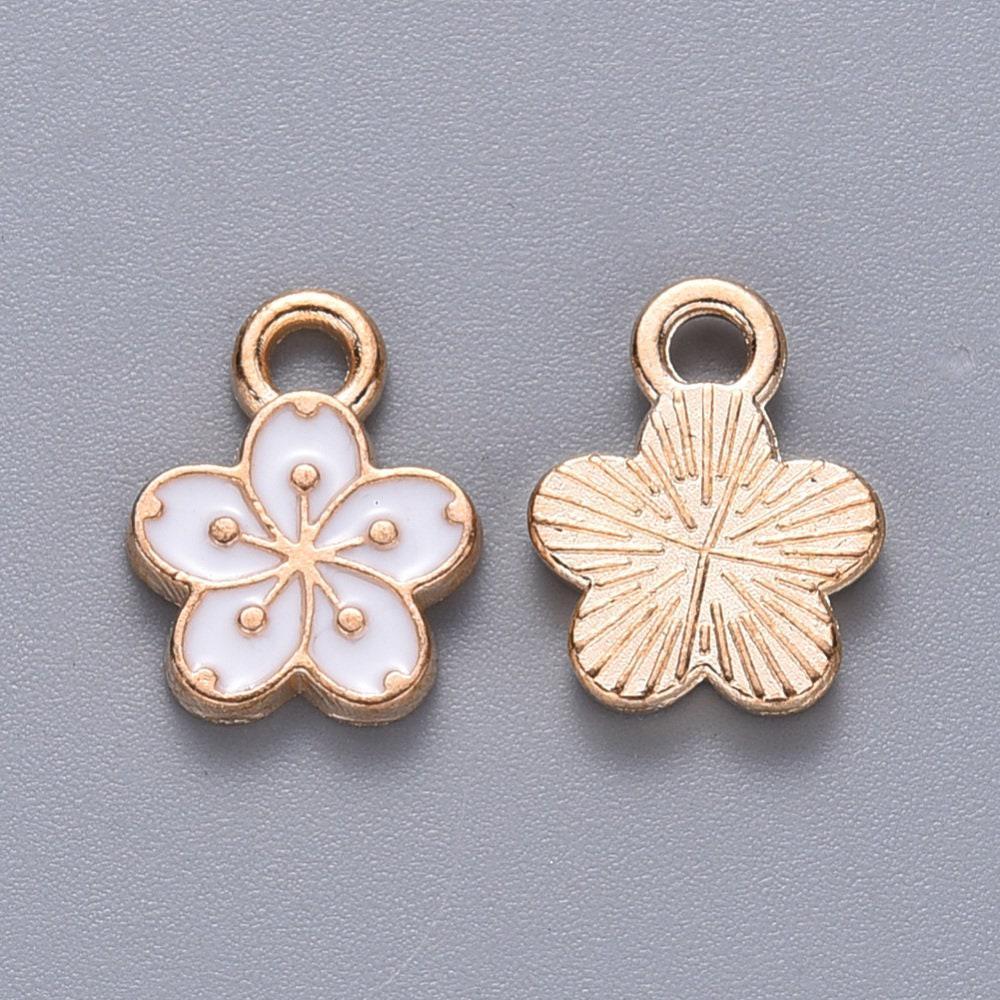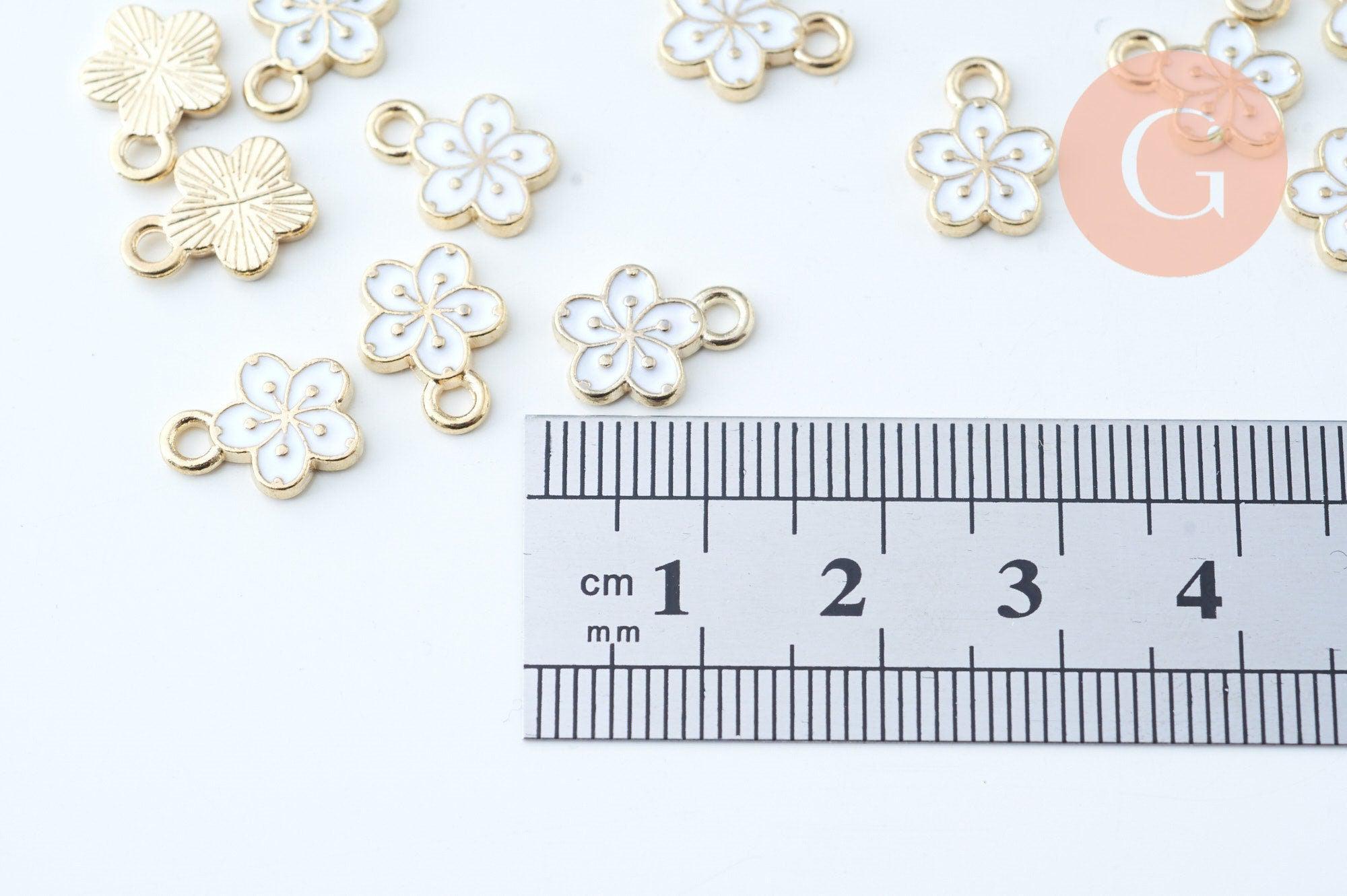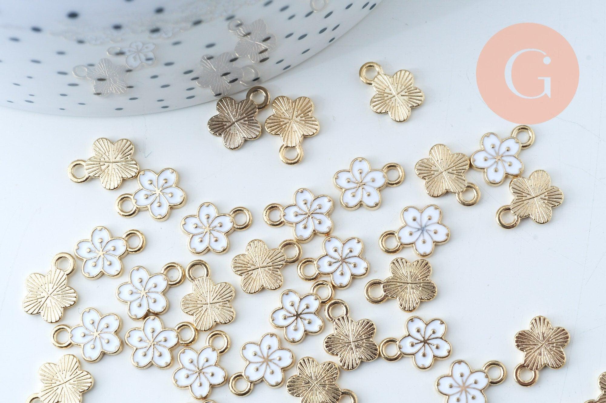 Colgante flor zamac dorado con esmalte blanco 12mm, colgante dorado para creación de joyas, x5 (G6088)