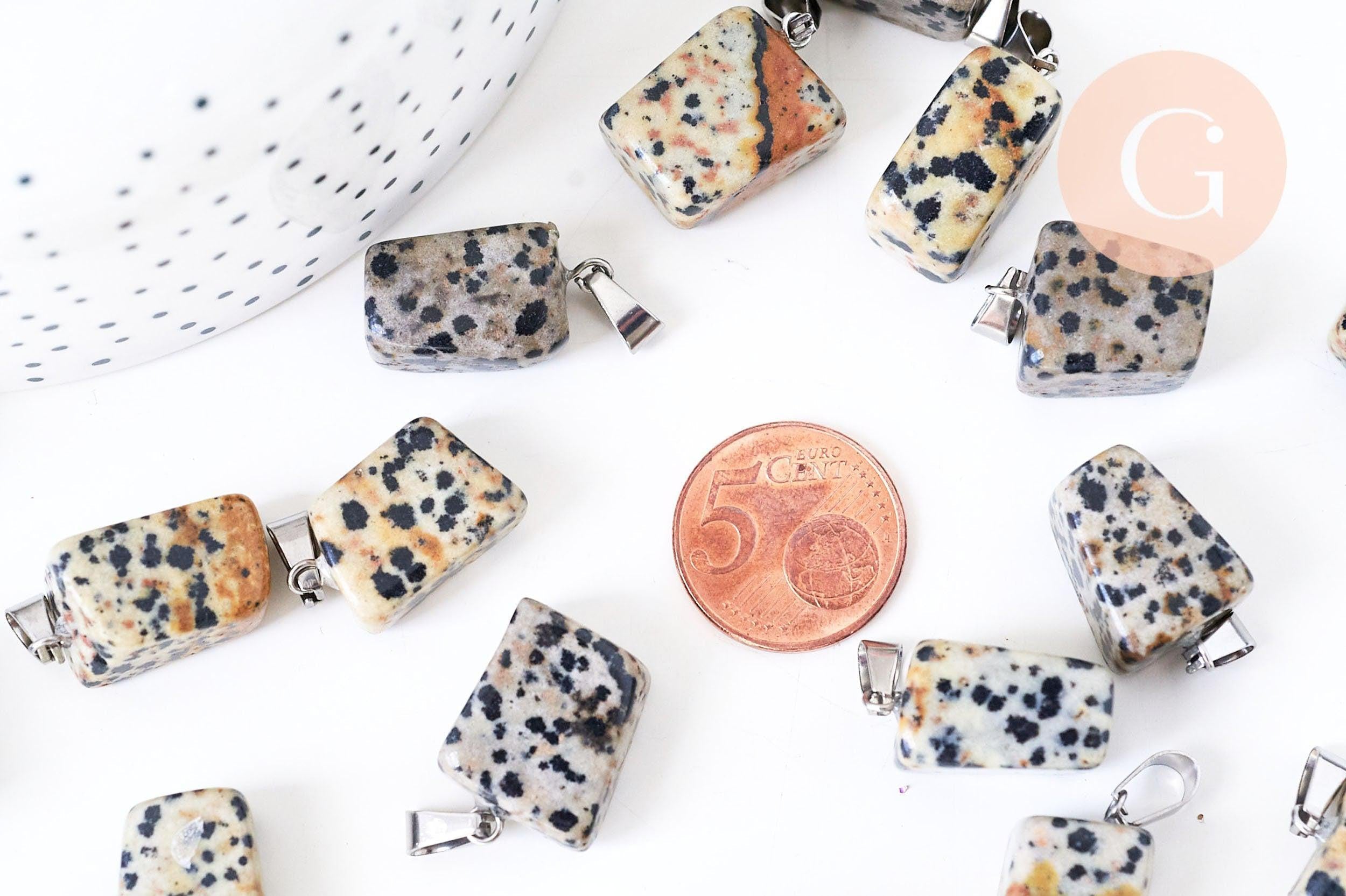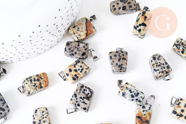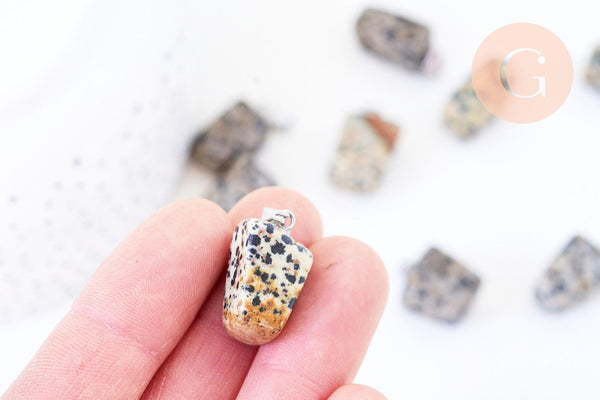 Podrás crear magníficos collares utilizando este colgante de mineral natural de jaspe dálmata sobre un soporte de color platino.