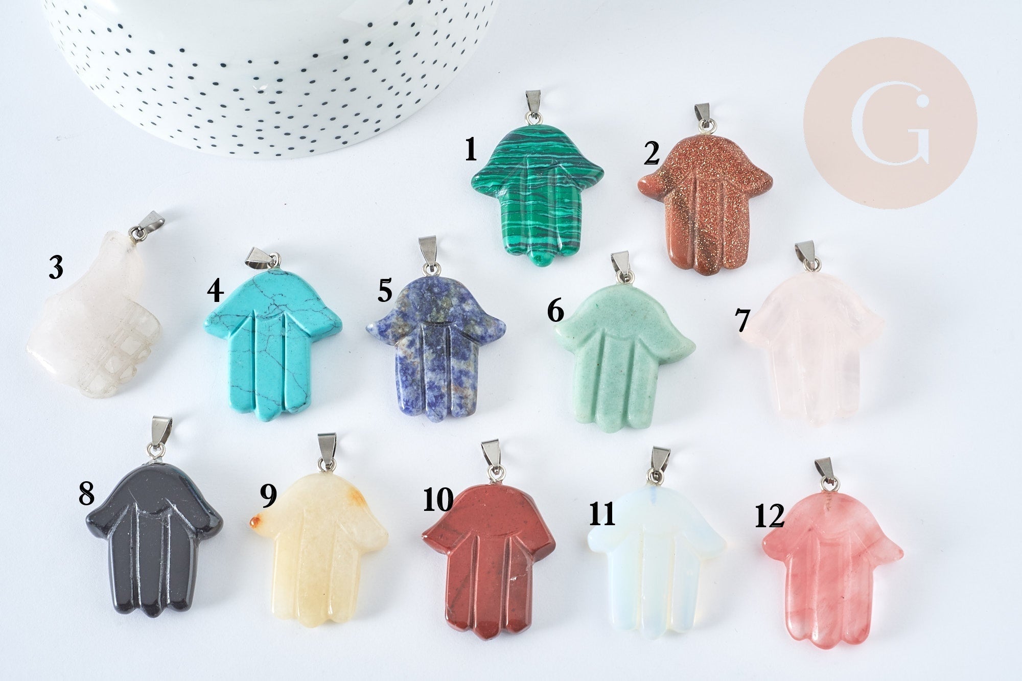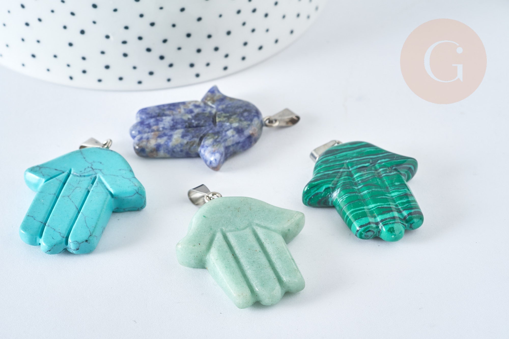¡Déjate encantar por el encanto de este colgante mano de Fatma de piedra natural ! Su elegante diseño te inspirará a crear tu bisutería DIY .