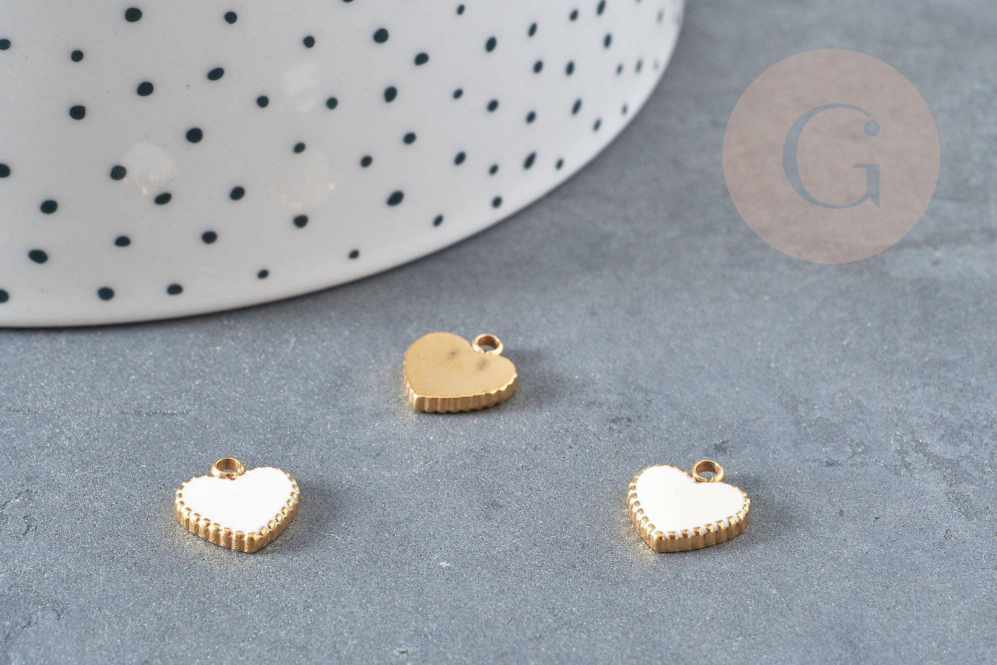 Pendentif médaille coeur acier 304 inoxydable doré émail blanc 11mm, x1 (G4884)