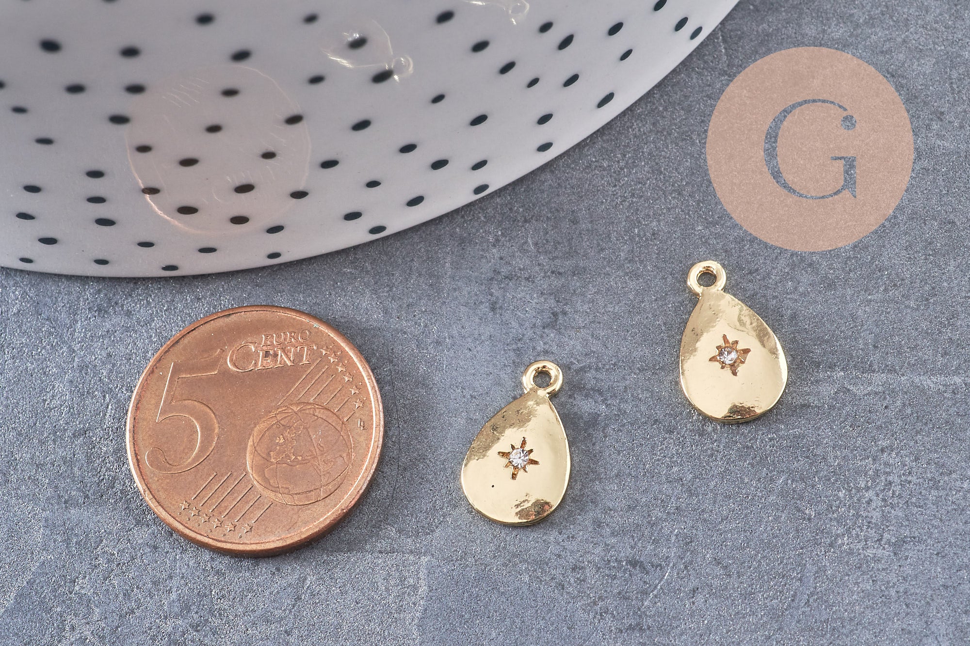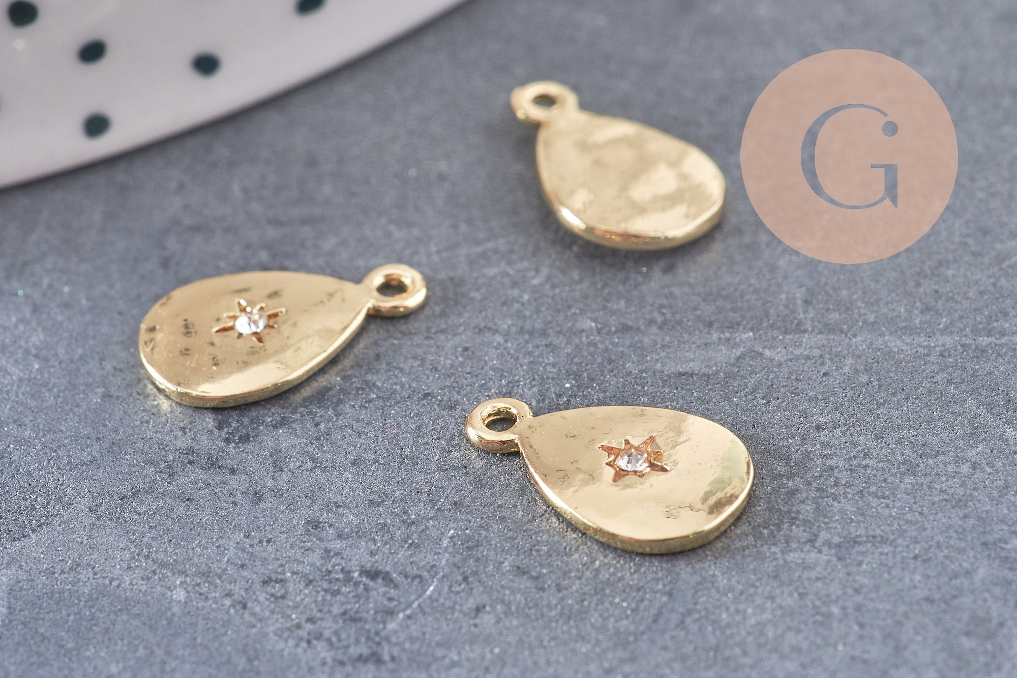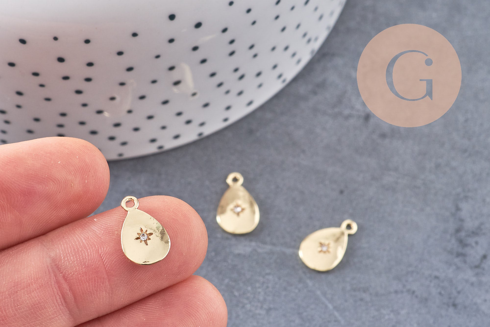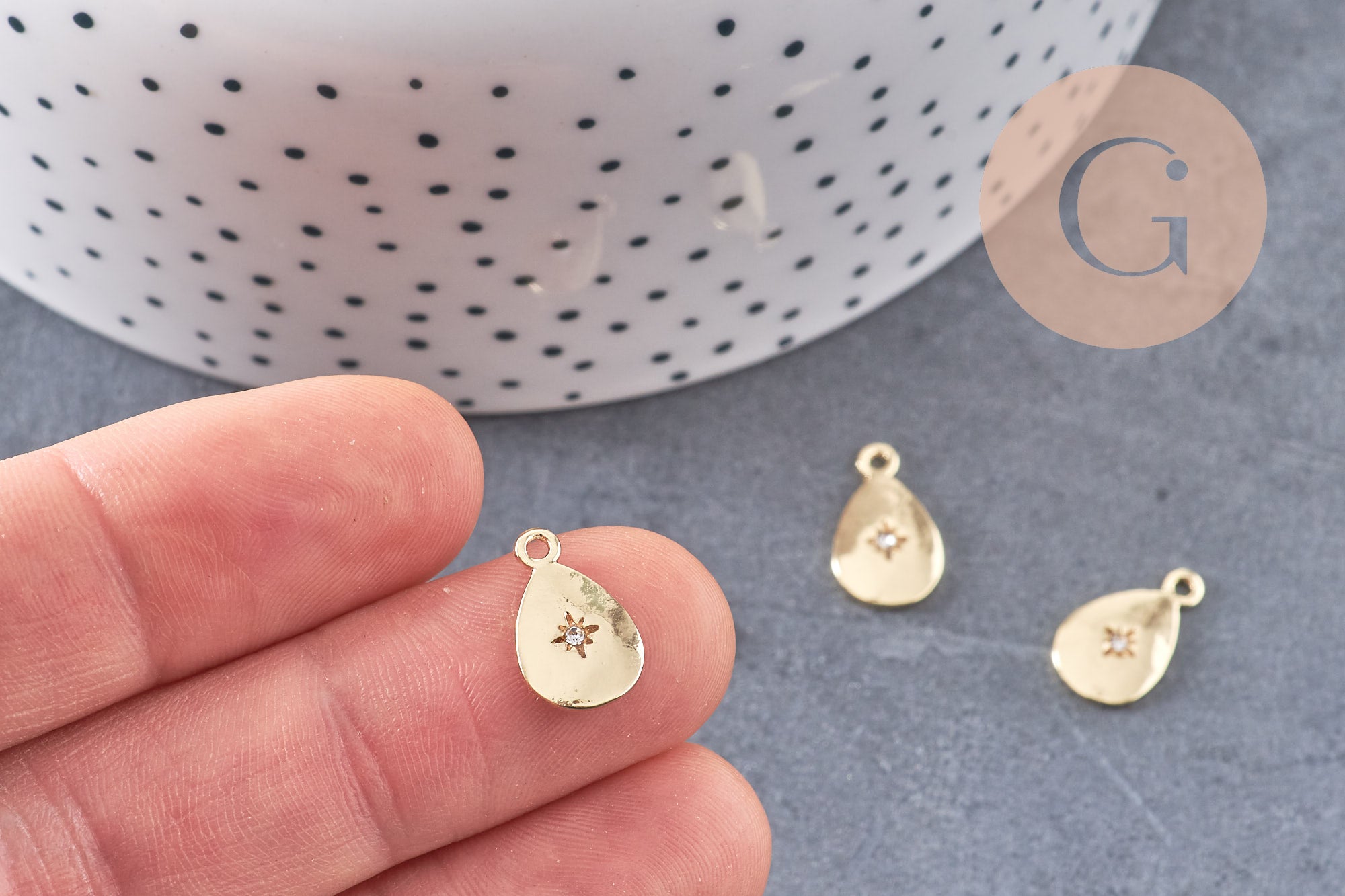 Un bonito medallón chapado en oro en forma de gota, decorado con una estrella y una circonita blanca en el centro. Un discreto colgante, ideal para crear borlas en pendientes o para crear una delicada pulsera o collar.