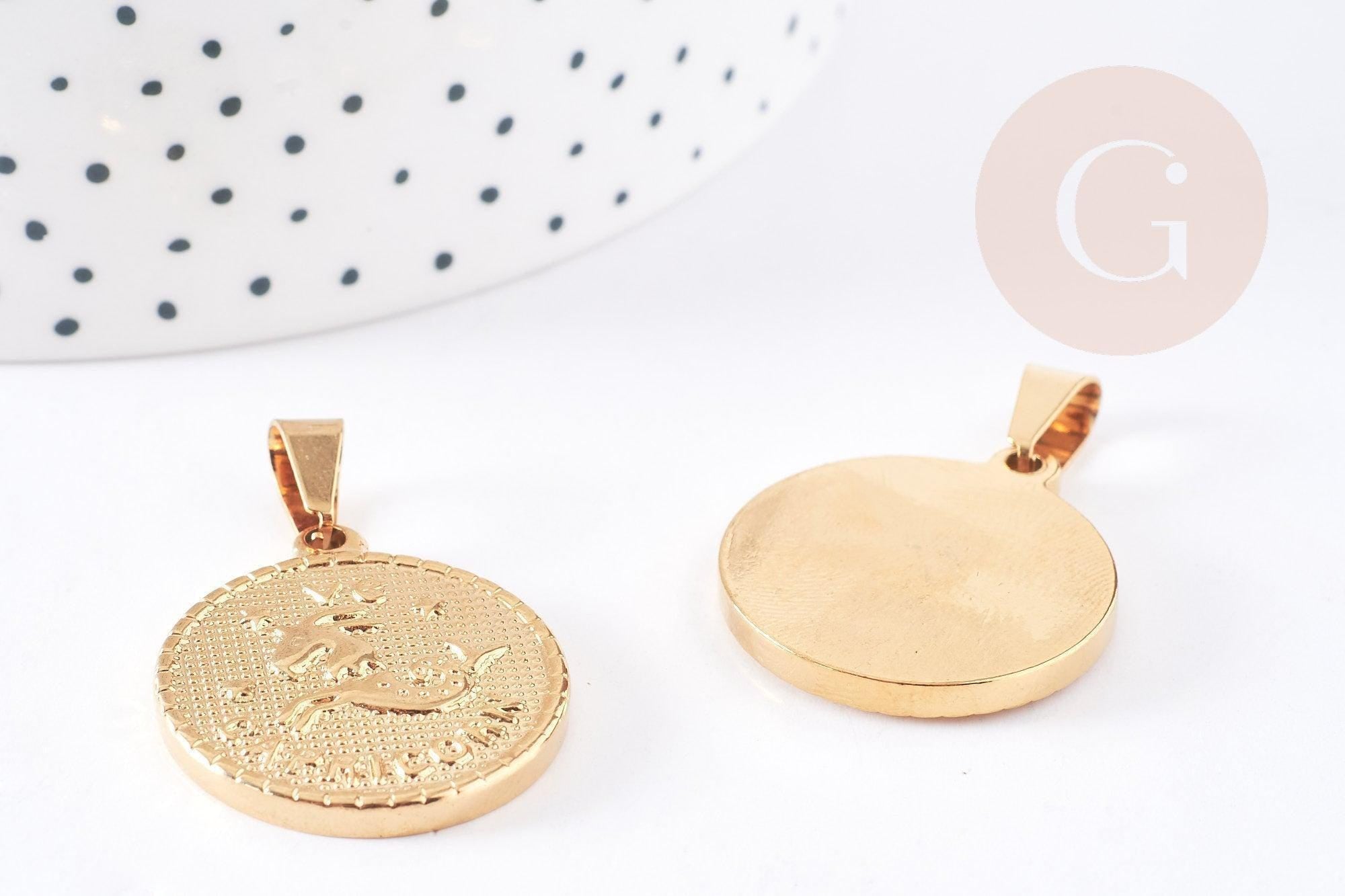 Colgante medalla Capricornio redondo de acero dorado, signo astrológico, colgante dorado, sin níquel, latón dorado, creación de joyas, medalla de oro, 2,9 cm