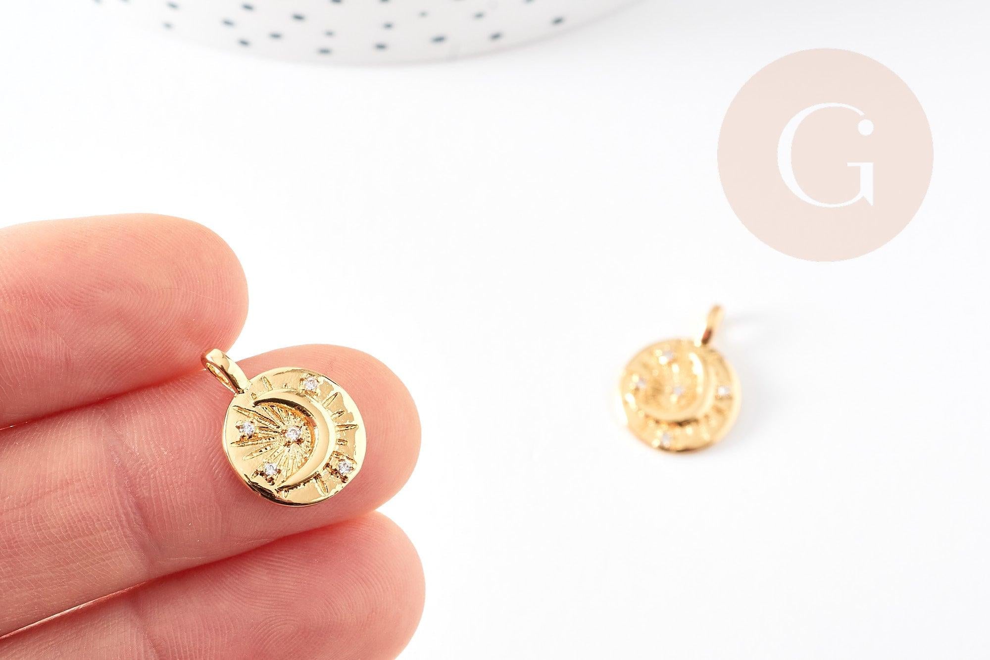 Pendentif médaille ronde lune laiton doré zircons, un pendentif doré avec cristaux pour création bijoux,18mm, x1 G4856