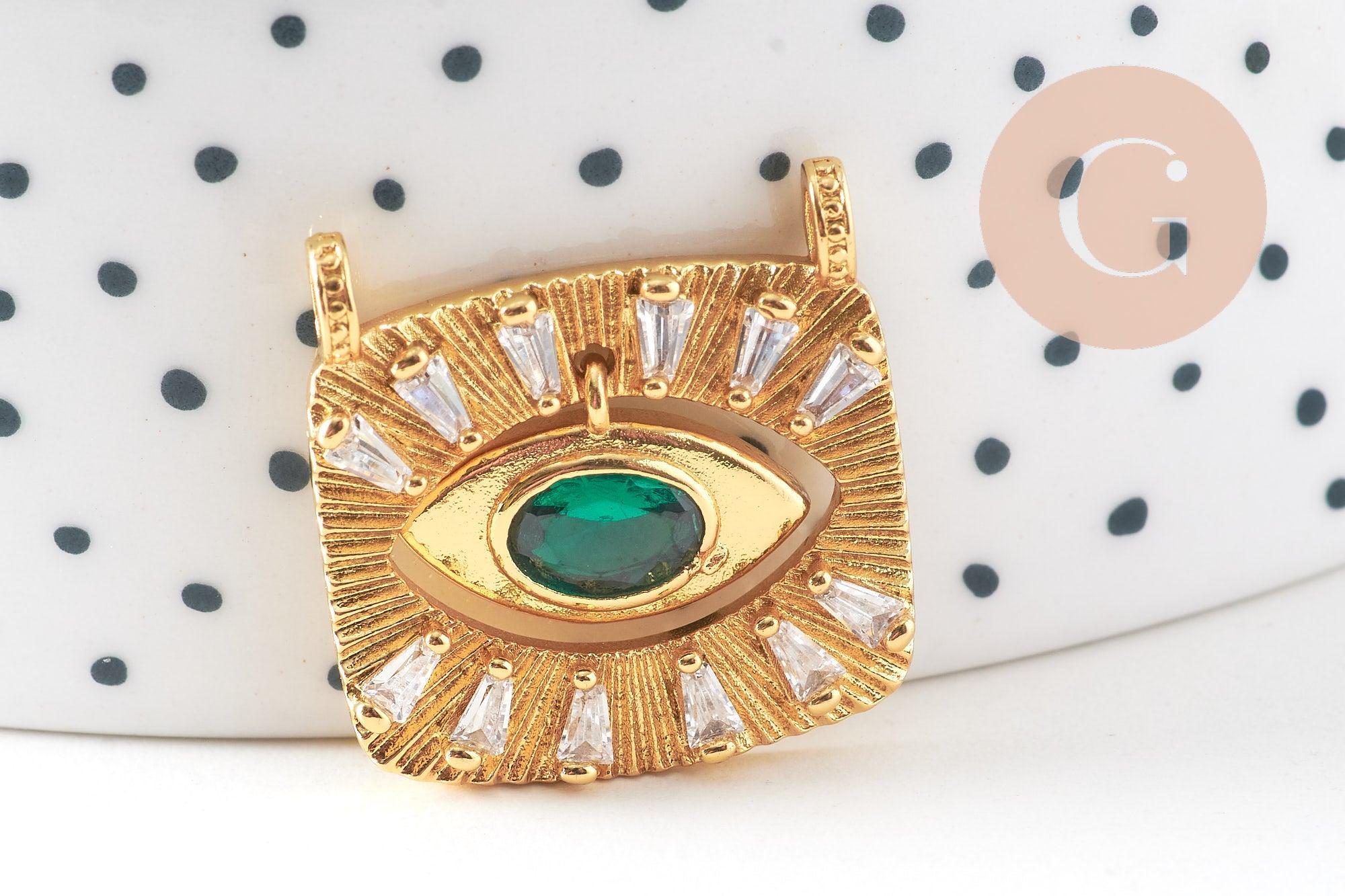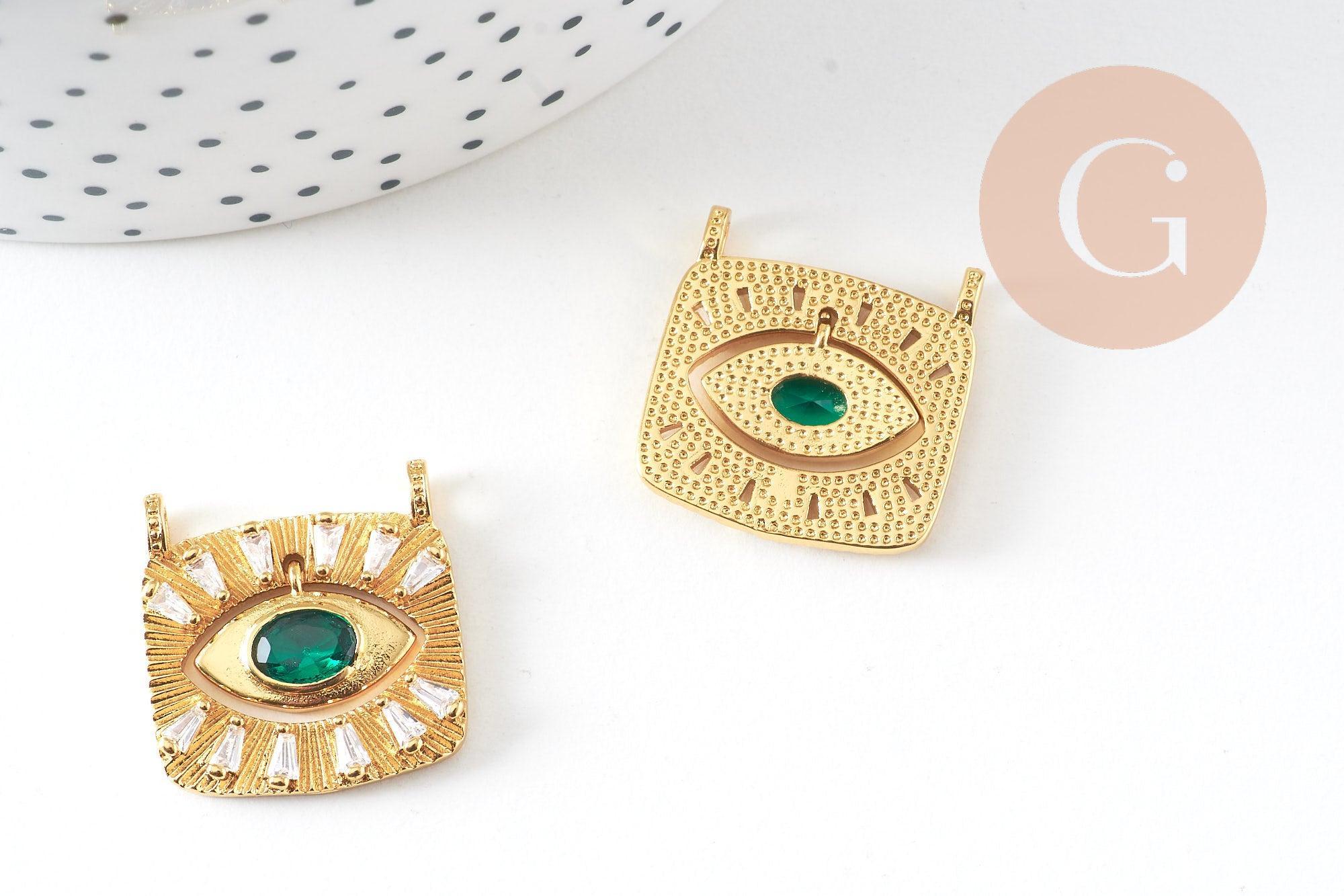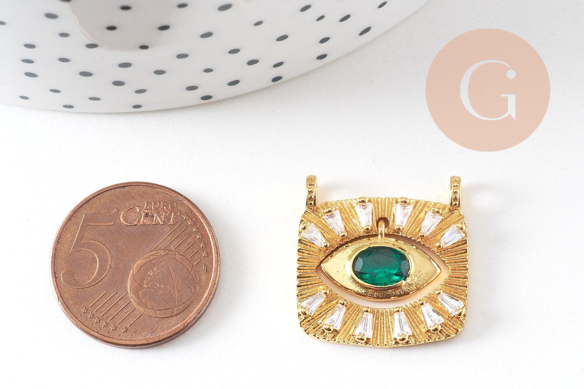 Un sublime colgante cuadrado en oro de 18 quilates, decorado con un ojo protector móvil en cristal verde.