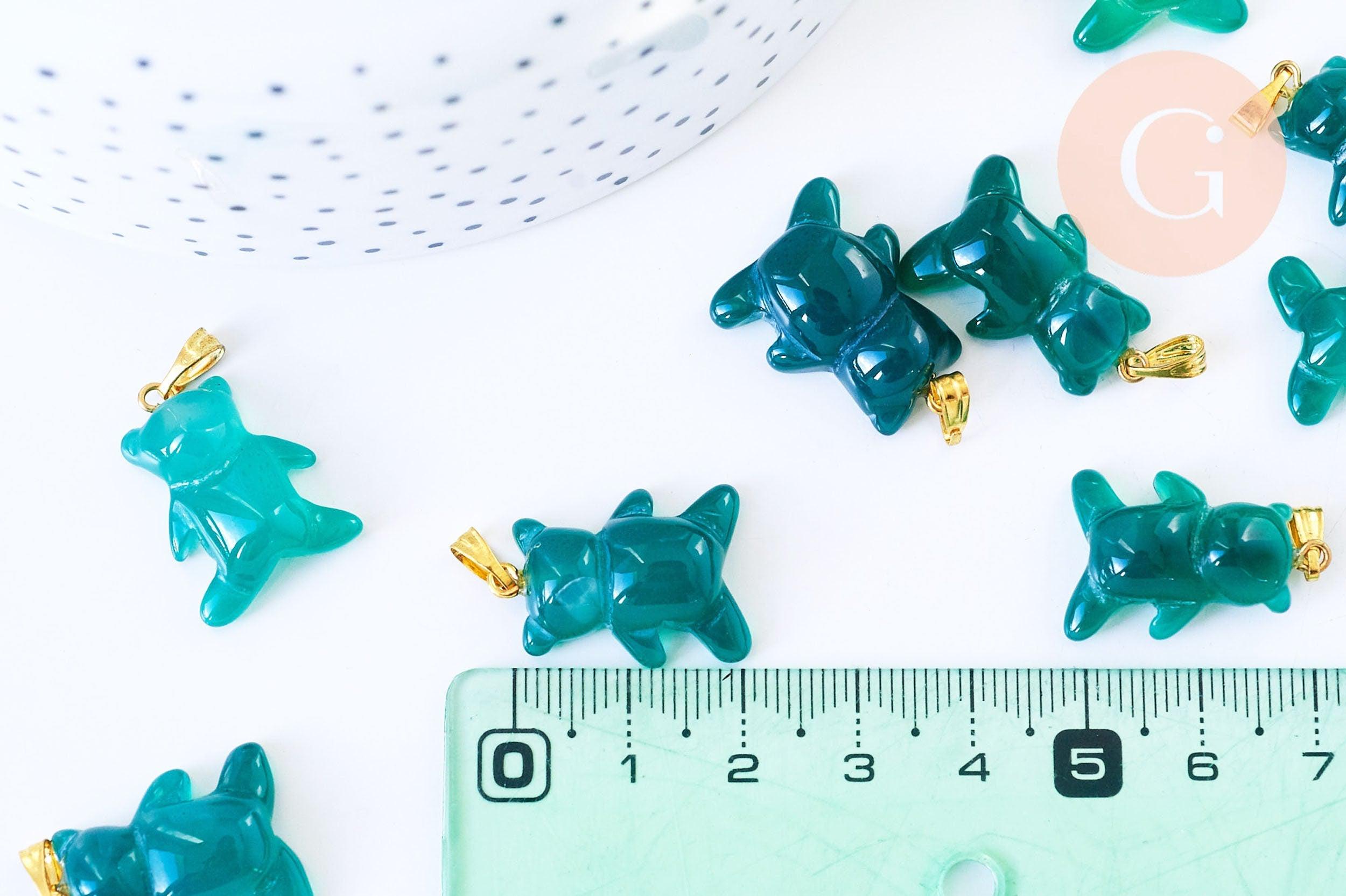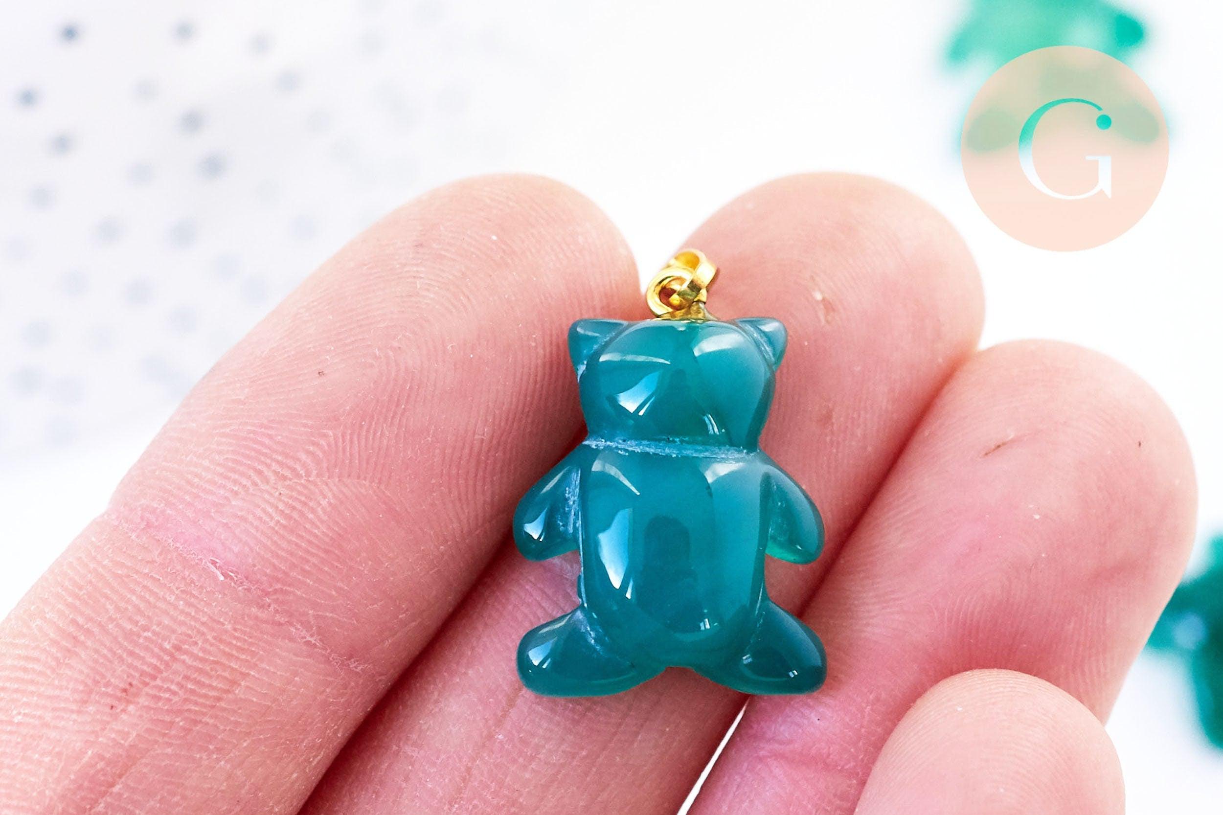Un adorable colgante de osito de peluche en ágata teñida de verde y soporte dorado para usar en todas tus creaciones.