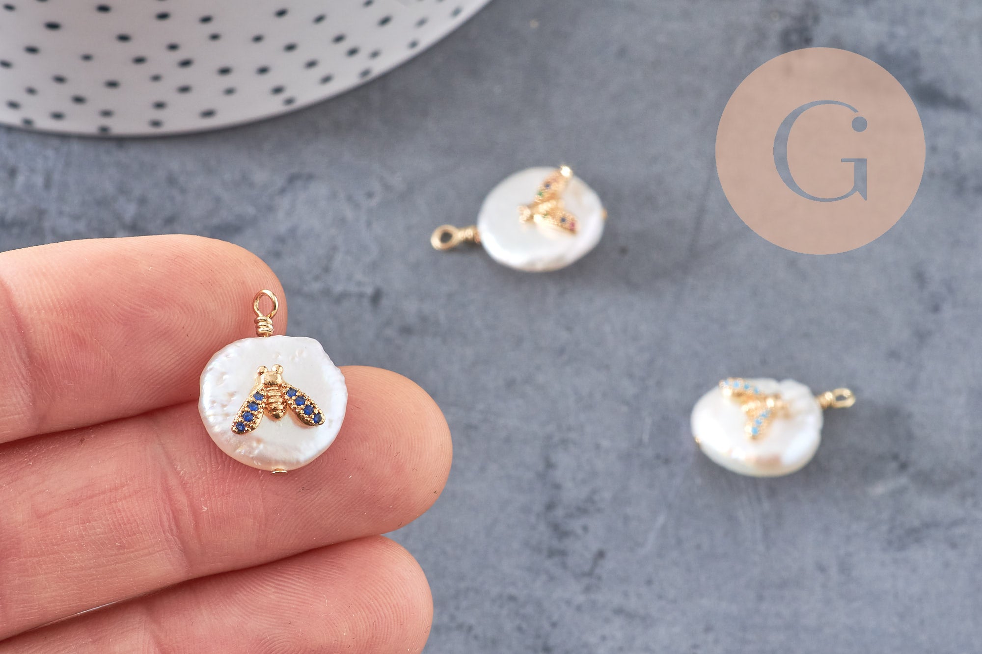 Perla Keshi natural y montura de latón chapado en oro, decorada con una pequeña abeja adornada con circonitas.
