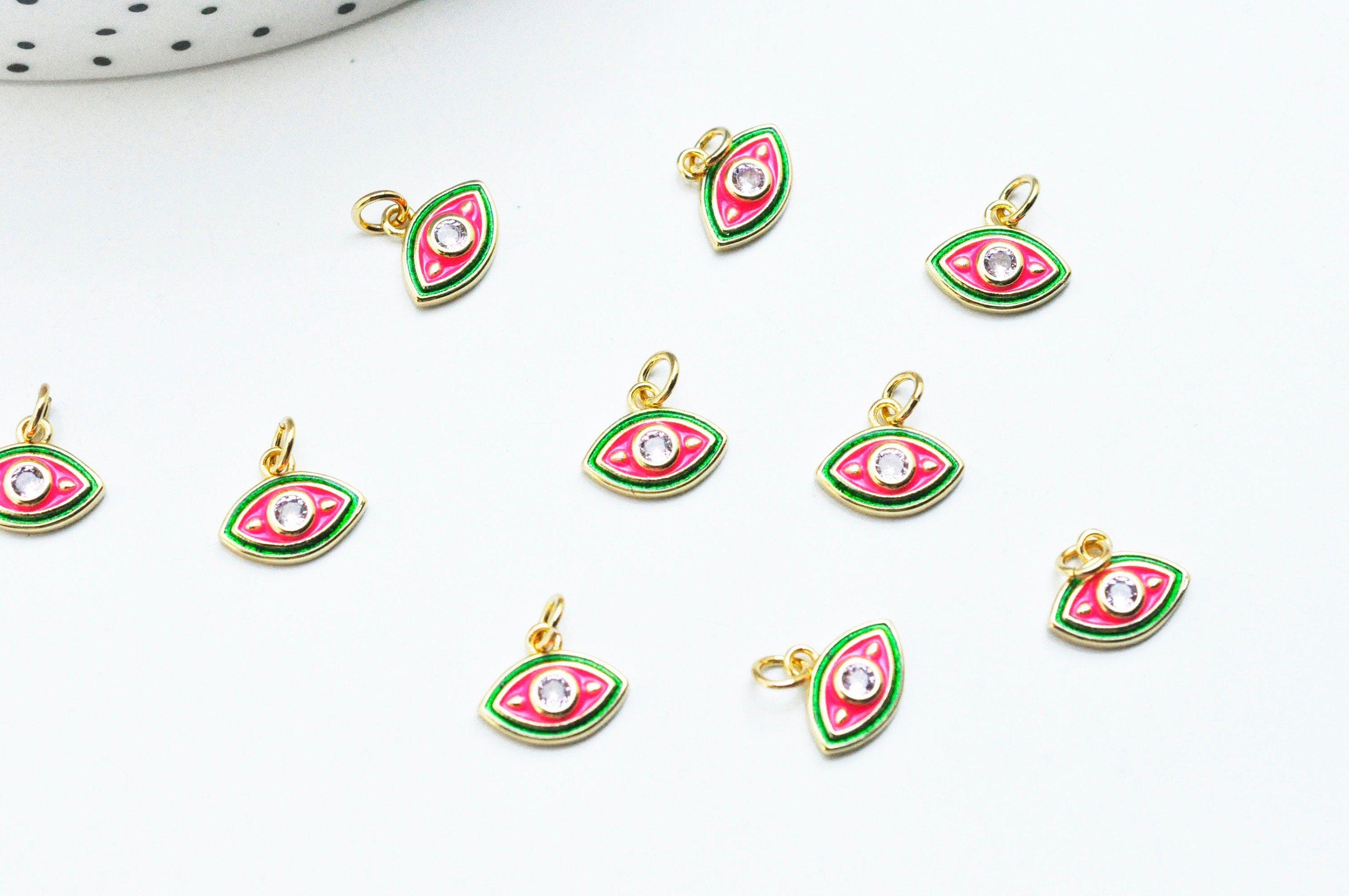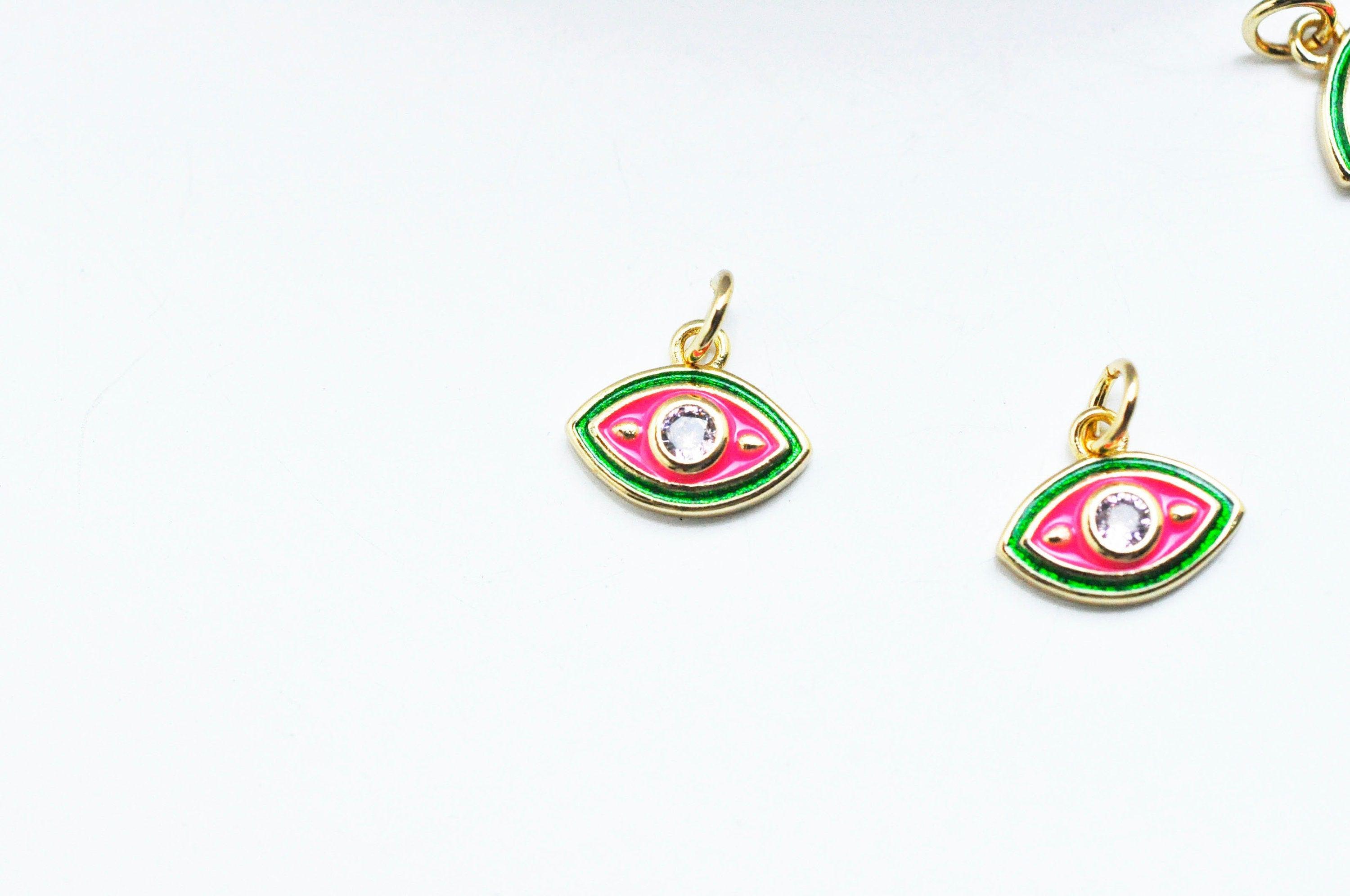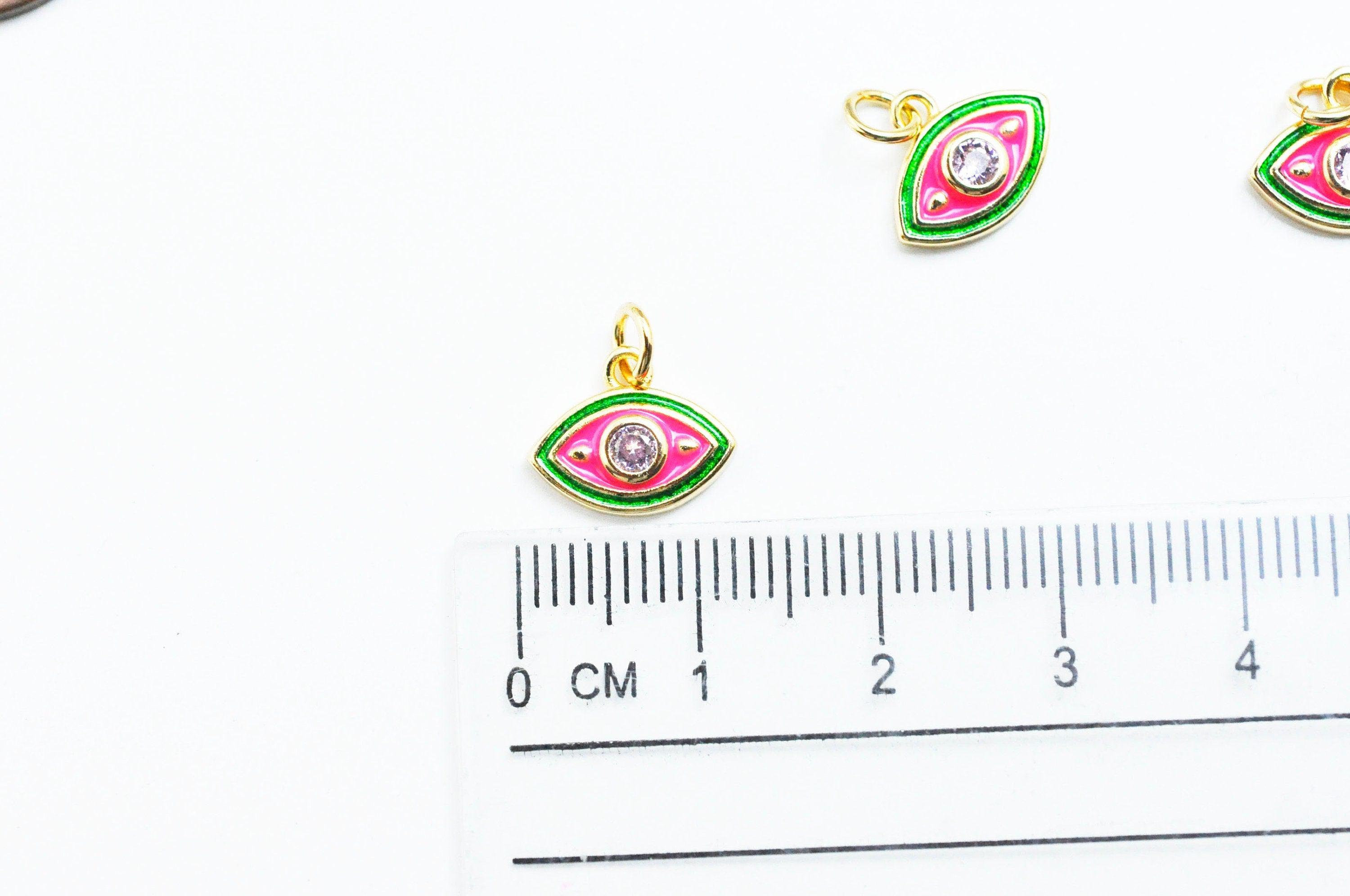 Pequeño colgante de ojo de esmalte verde y rojo con circonita bañada en oro de 18 quilates, colgante de latón bañado en oro para la buena suerte contra el mal de ojo, 13 mm, cada uno Un colgante de conector...