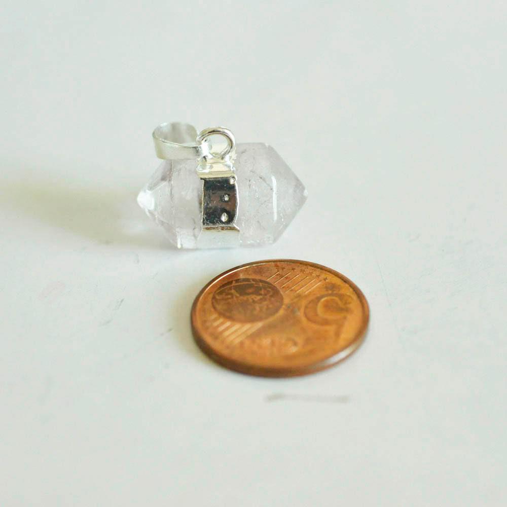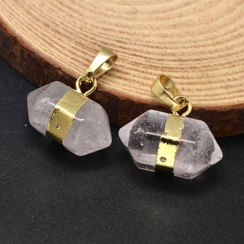 Colgante de doble punta en cristal en bruto con engaste de cuarzo rosa en oro o plata.