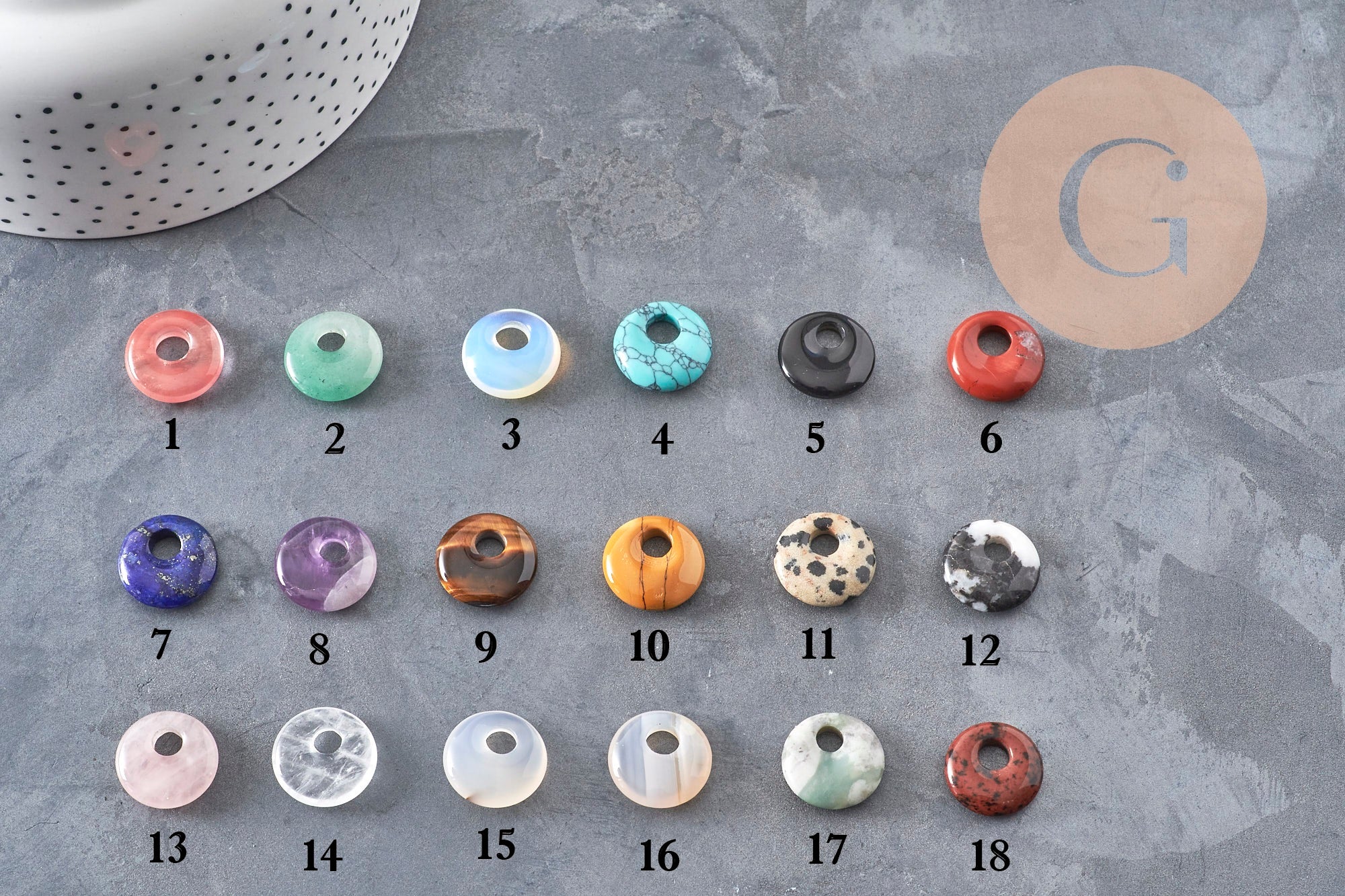 Colgante de piedra natural redondo de 18mm con agujero central, ideal para crear fácilmente joyas DIY bohemias y minimalistas.