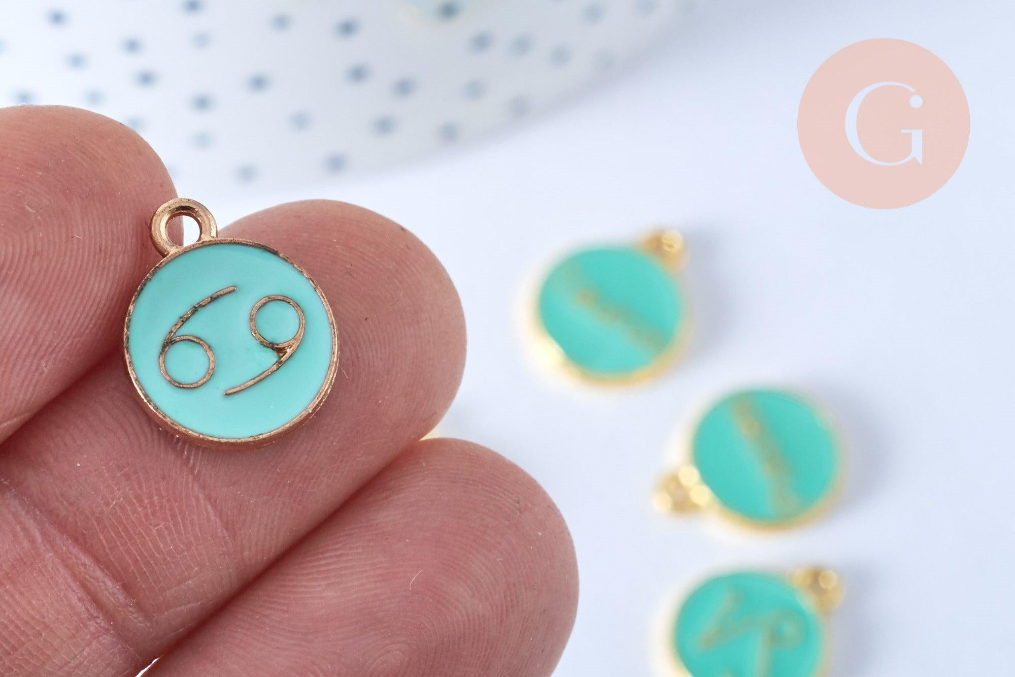 Para crear magníficos collares, pendientes y pulseras, adopta este lindo colgante redondo esmaltado en zamak verde claro y dorado, con el símbolo de tu signo astrológico.