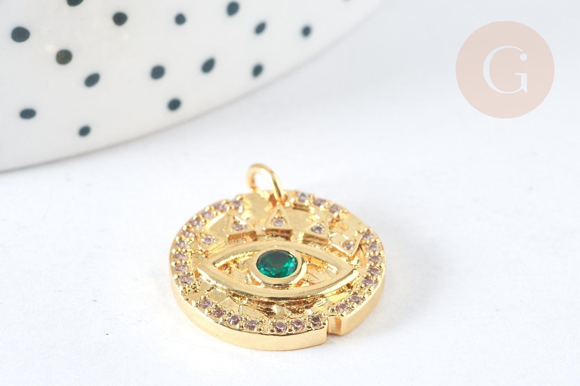 Este colgante redondo en El latón bañado en oro está decorado con un ojo malvado con un circón verde y espolvoreado con circonita cúbica blanca. Este te permitirá crear increíbles Bisutería DIY sobre el tema de Joyas místicas .
