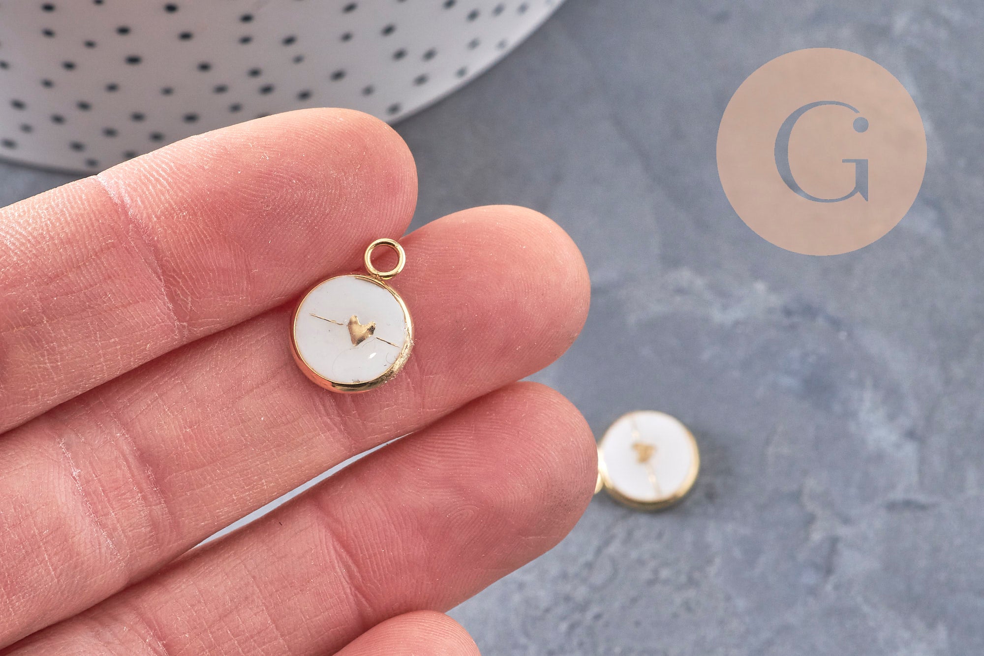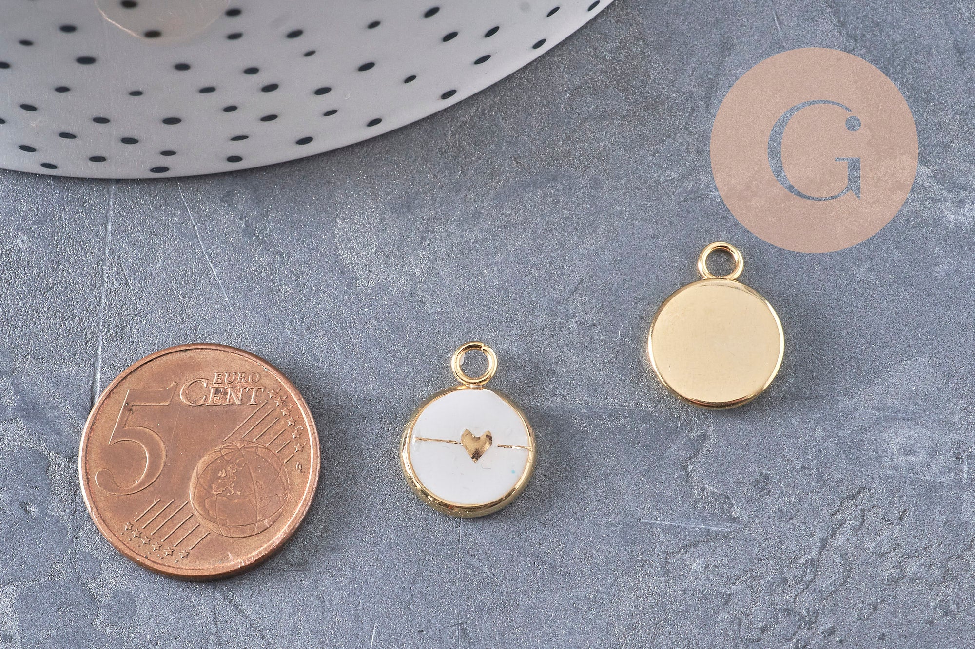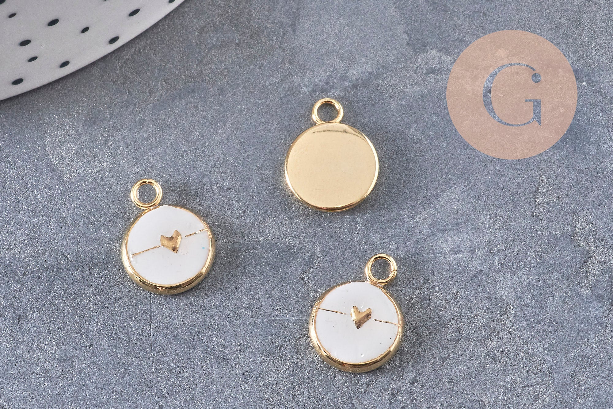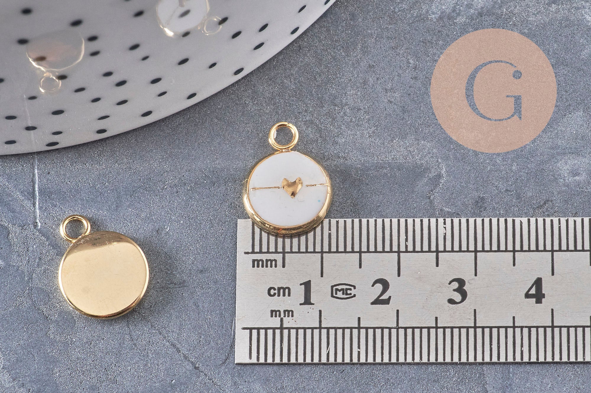 • Diseño: pequeño corazón dorado sobre fondo blanco.