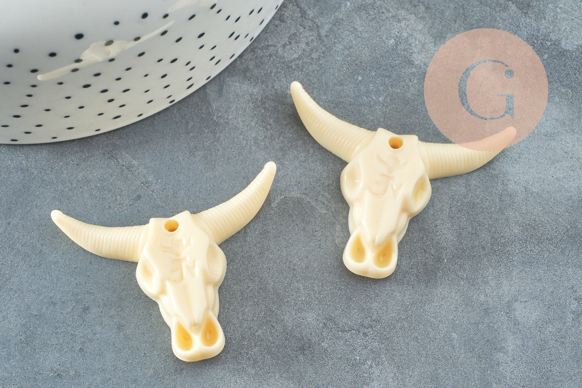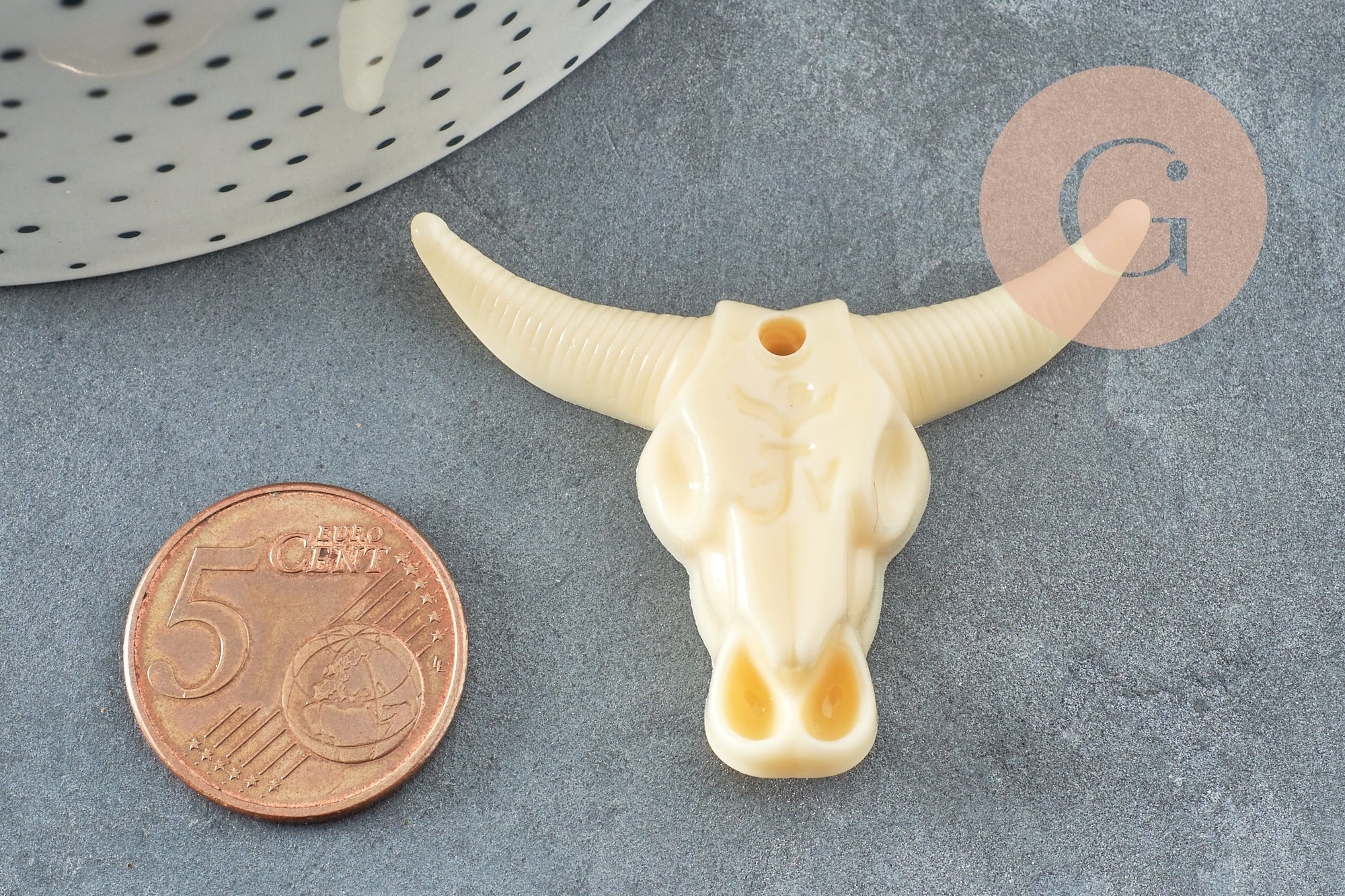 colgante de imitación de cuerno (resina) teñido de blanco sobre el tema del salvaje oeste, que representa una calavera con cabeza de vaca