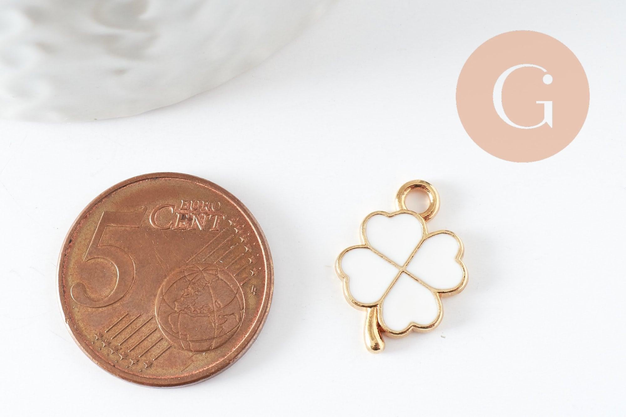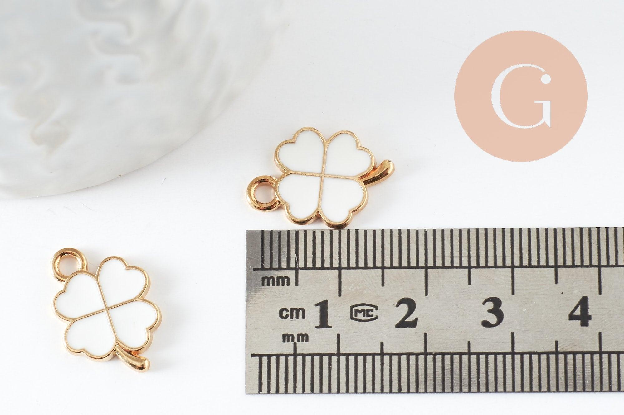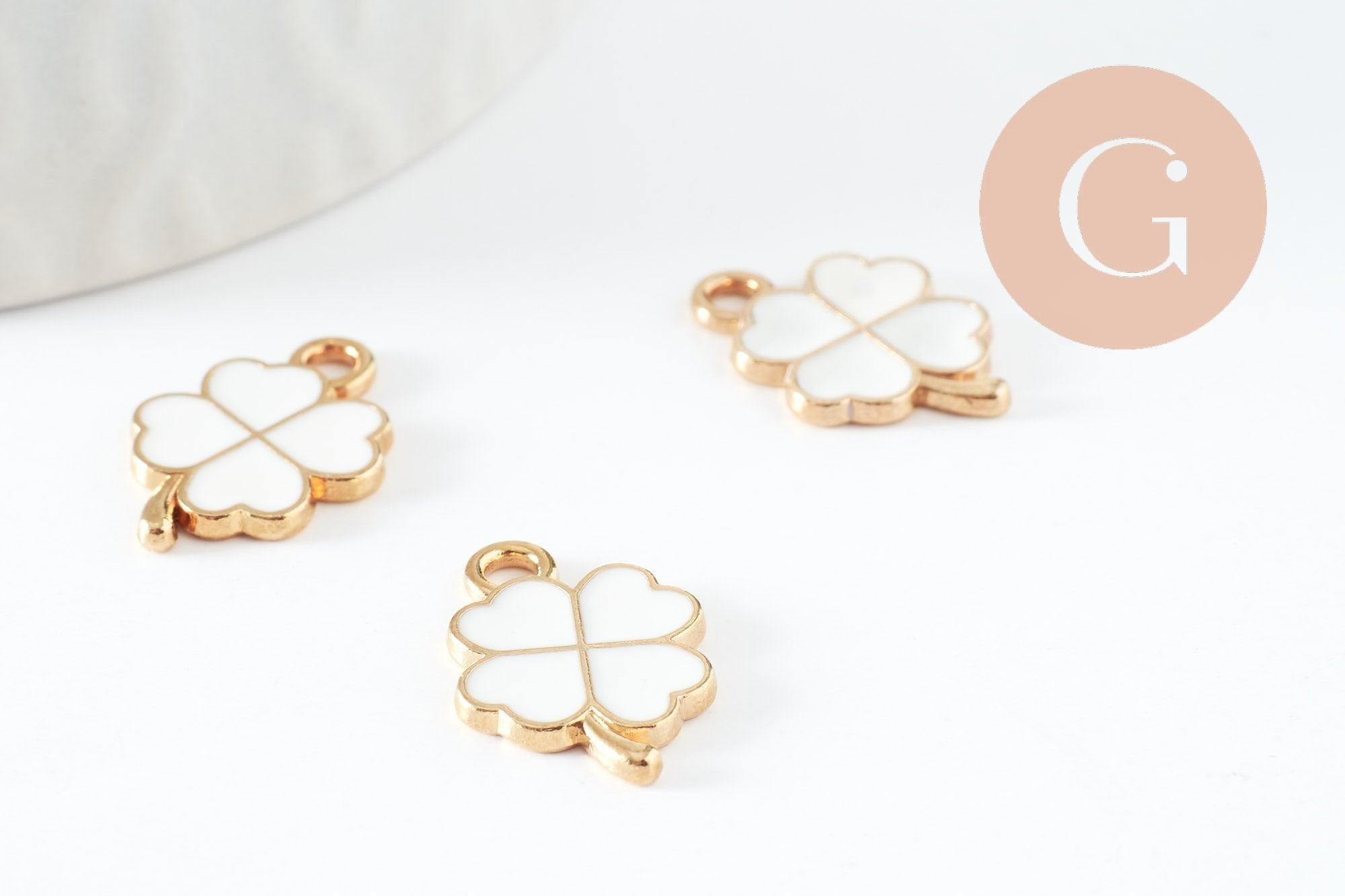Colgante de trébol de 4 hojas en zamac dorado con esmalte blanco, 18 mm, x2 (G5497)