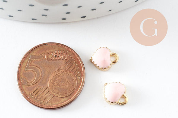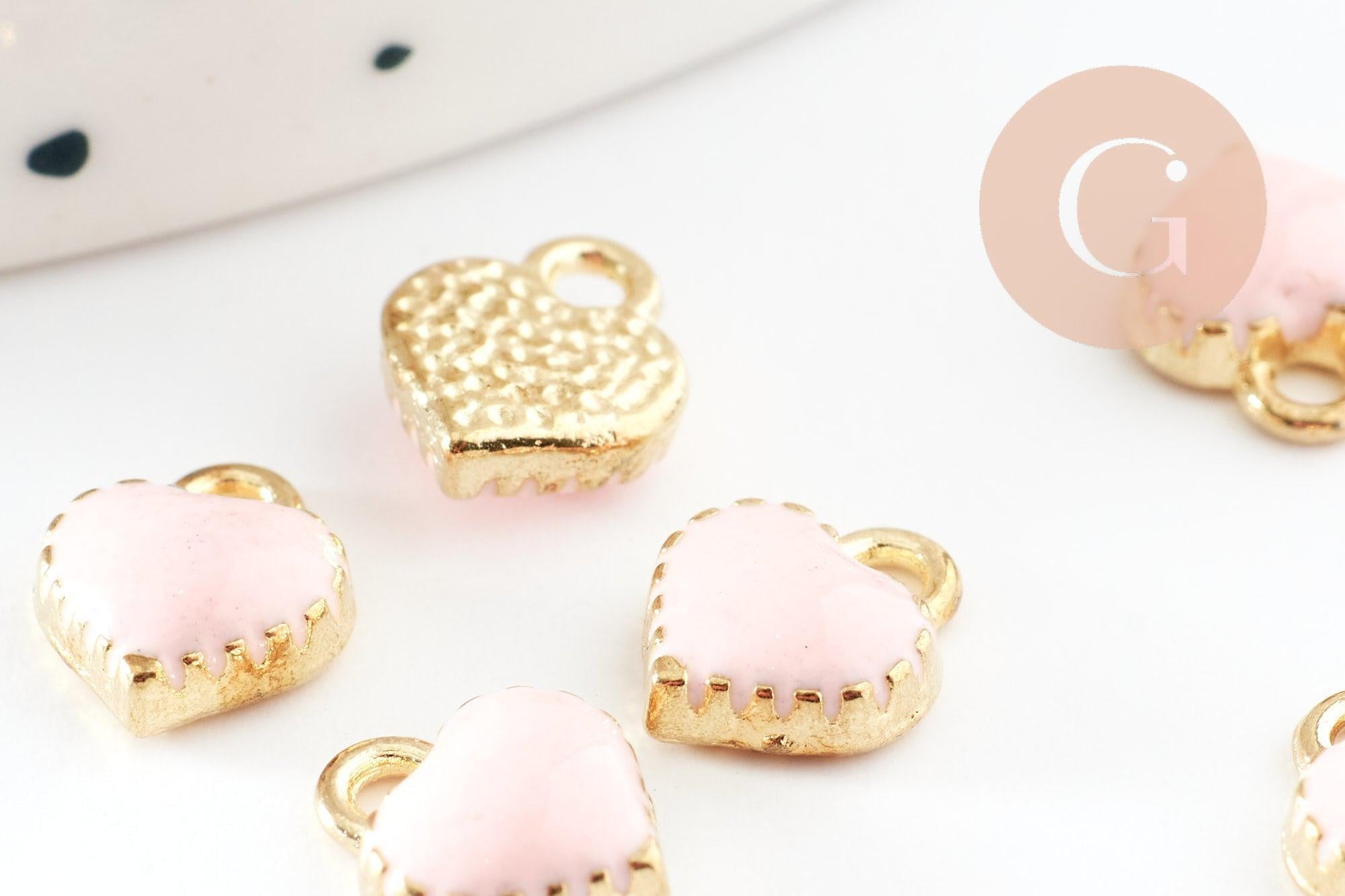 Un conjunto de 10 colgantes de corazón en zamac dorado y esmalte rosa.