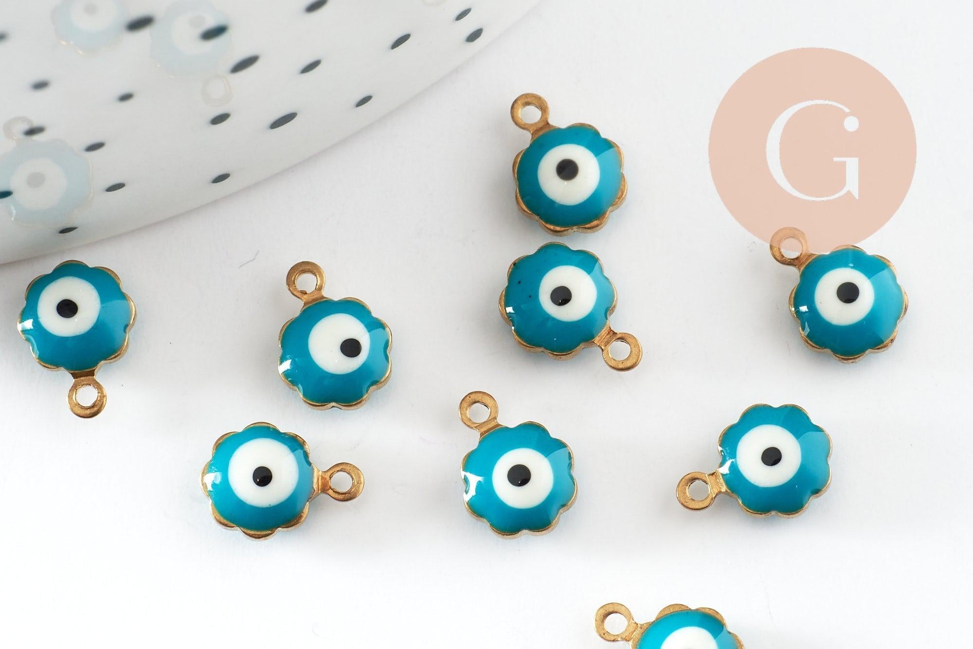 Colgantes dorados Flor de esmalte azul, mal de ojo, suministros creativos, latón dorado, colgante de la suerte, creación de joyas, 9 mm, juego de 10