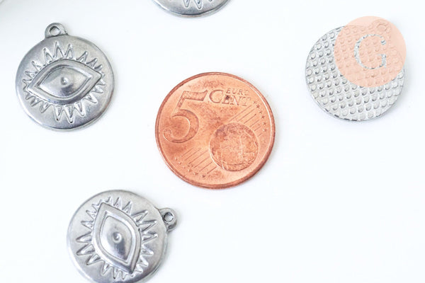 Pendentif rond oeil protecteur acier 304 inoxydable argenté 19.5mm,pendentif acier inoxydable sans nickel, x1 G6034