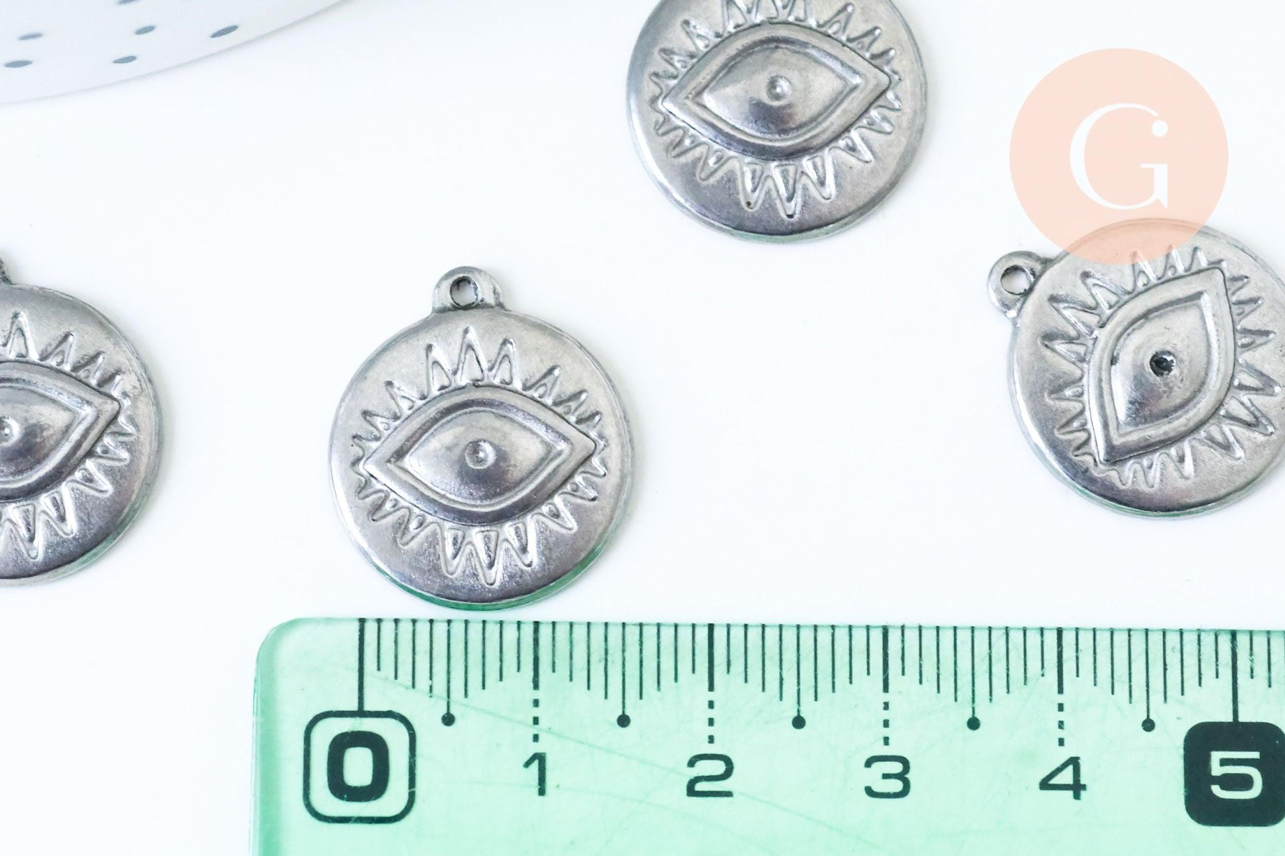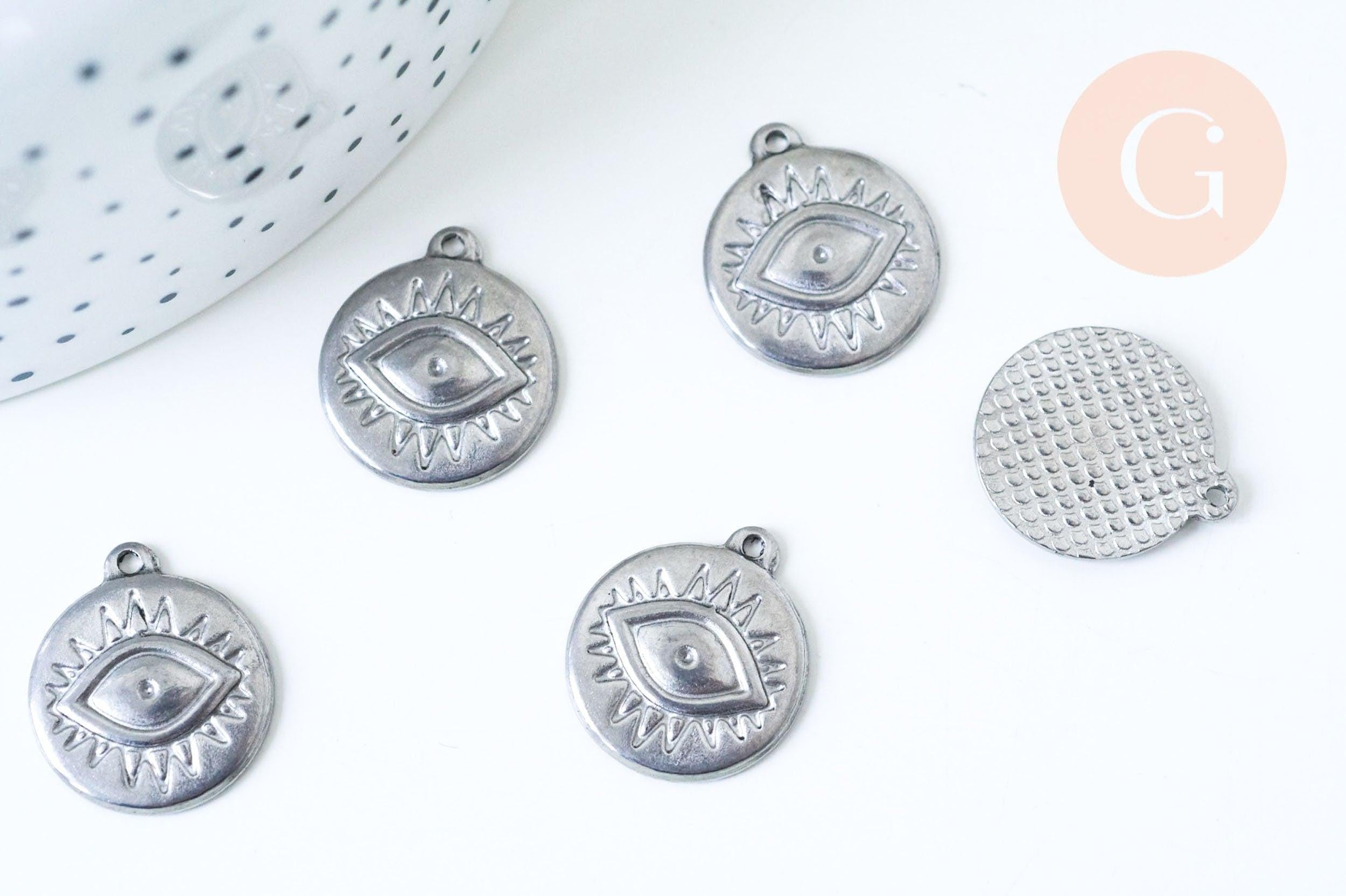 Utilice este colgante de ojo redondo protector contra el mal de ojo, en acero inoxidable plateado, para sus creaciones de joyería DIY.
