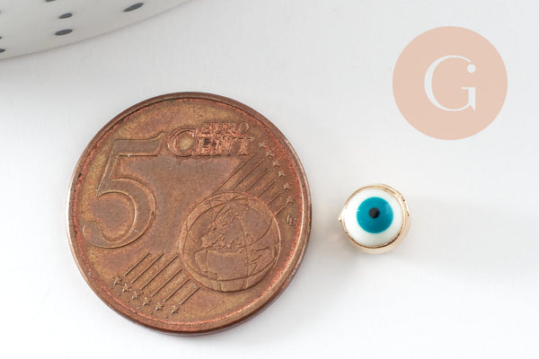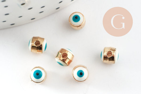 Perla de ojo malvado, esmalte blanco dorado, latón dorado, 5,5 mm, x10 (G7119)