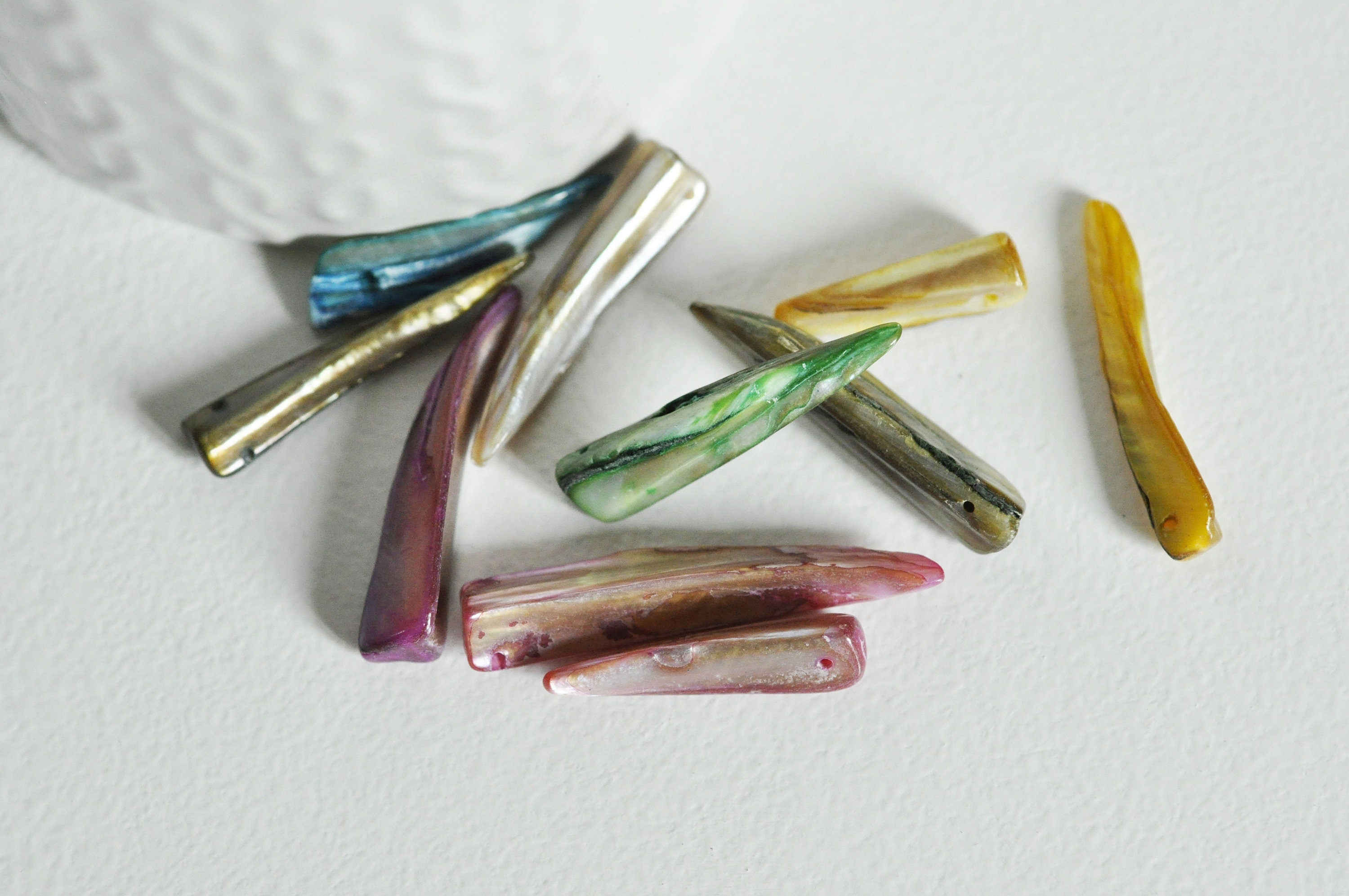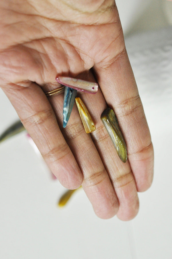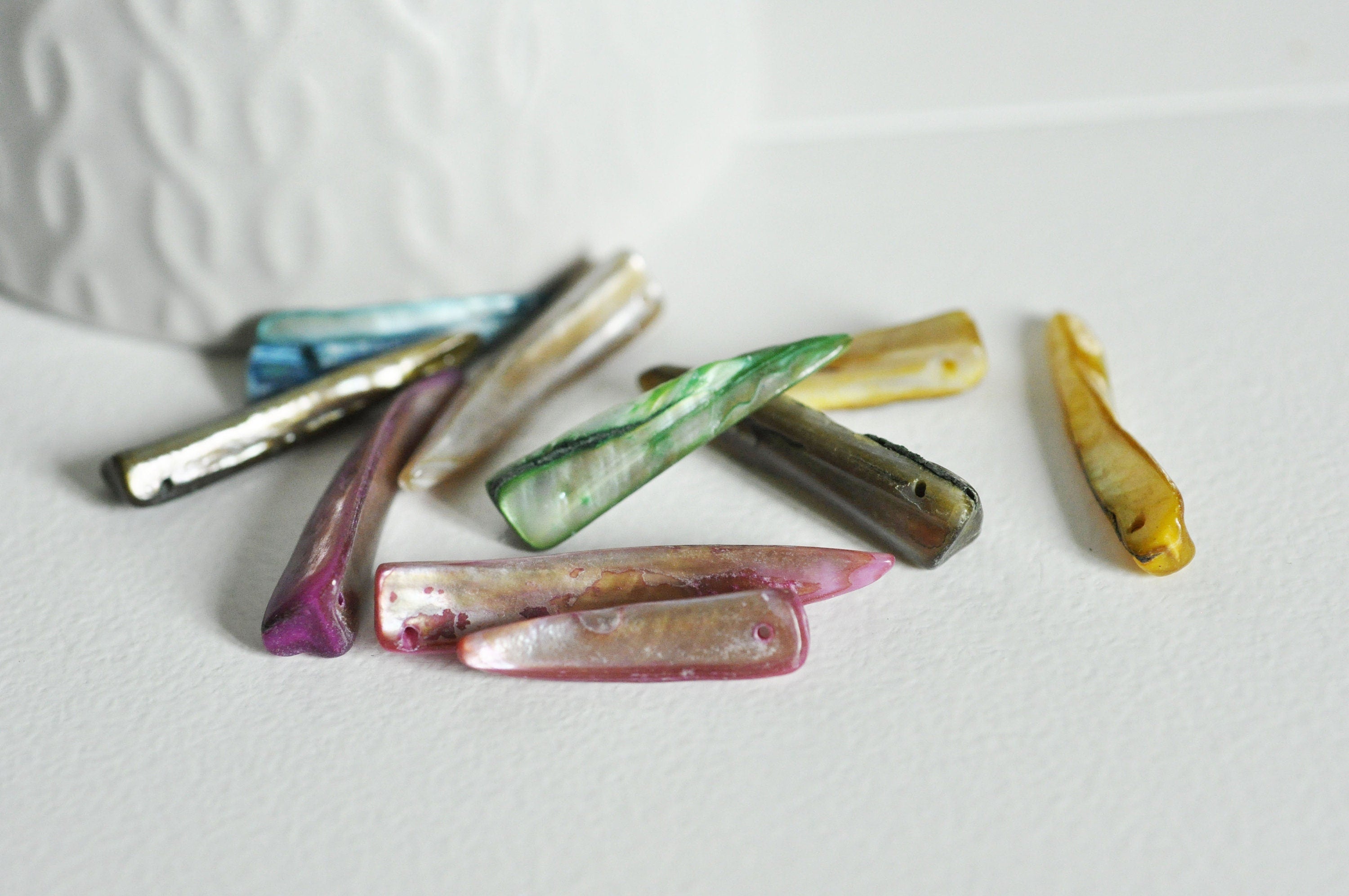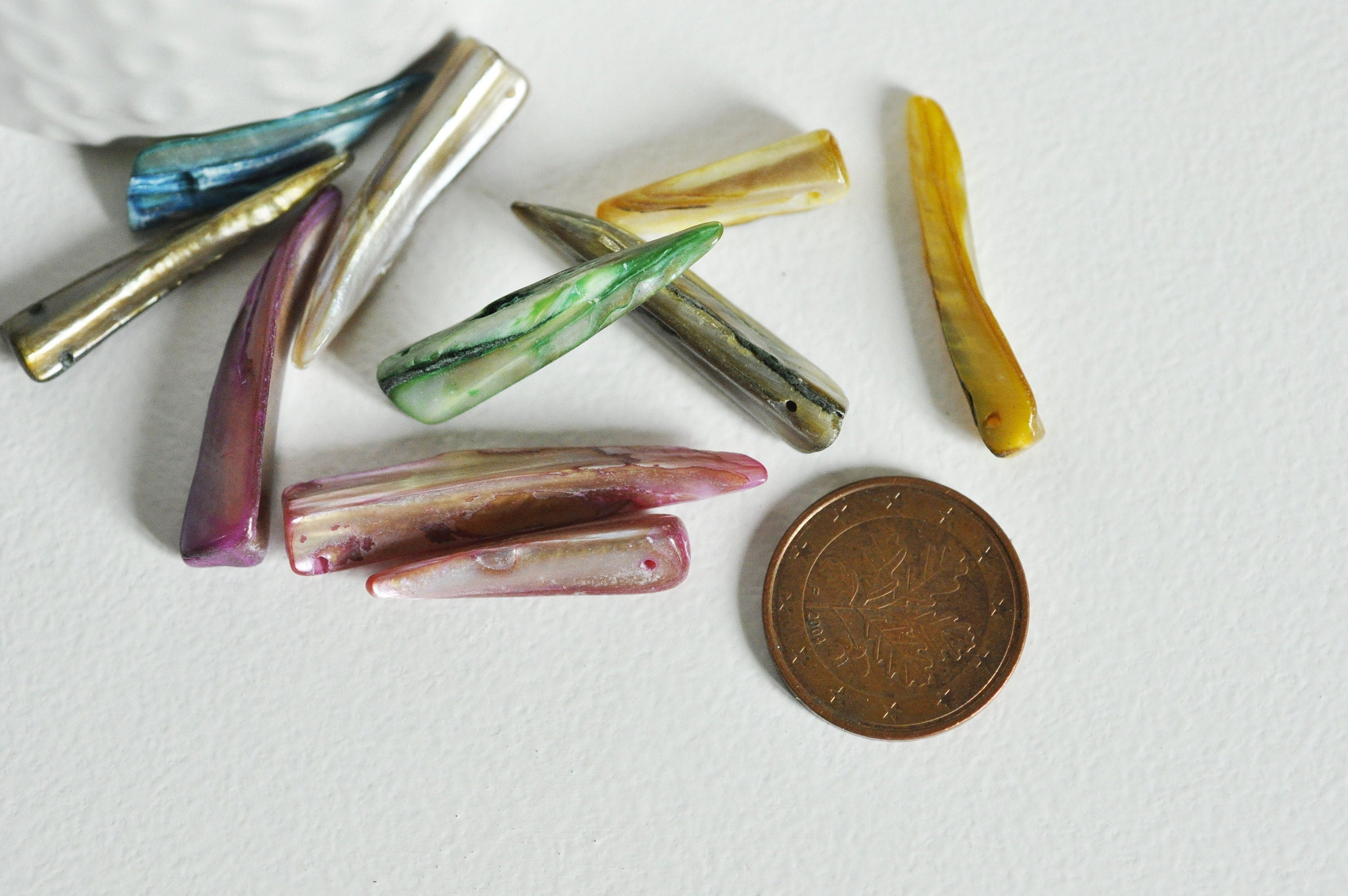 Este juego de 20 cuentas de diente de nácar natural teñidas ofrece una gama de colores vibrantes y formas orgánicas únicas. Su acabado perlado les otorga un brillo sutil, perfecto para crear joyas de moda con un refinado aspecto mineral.
