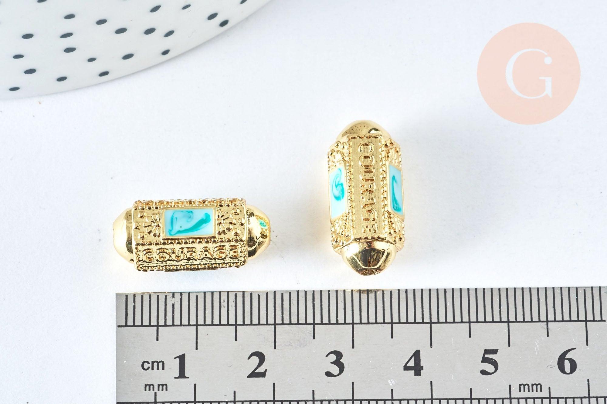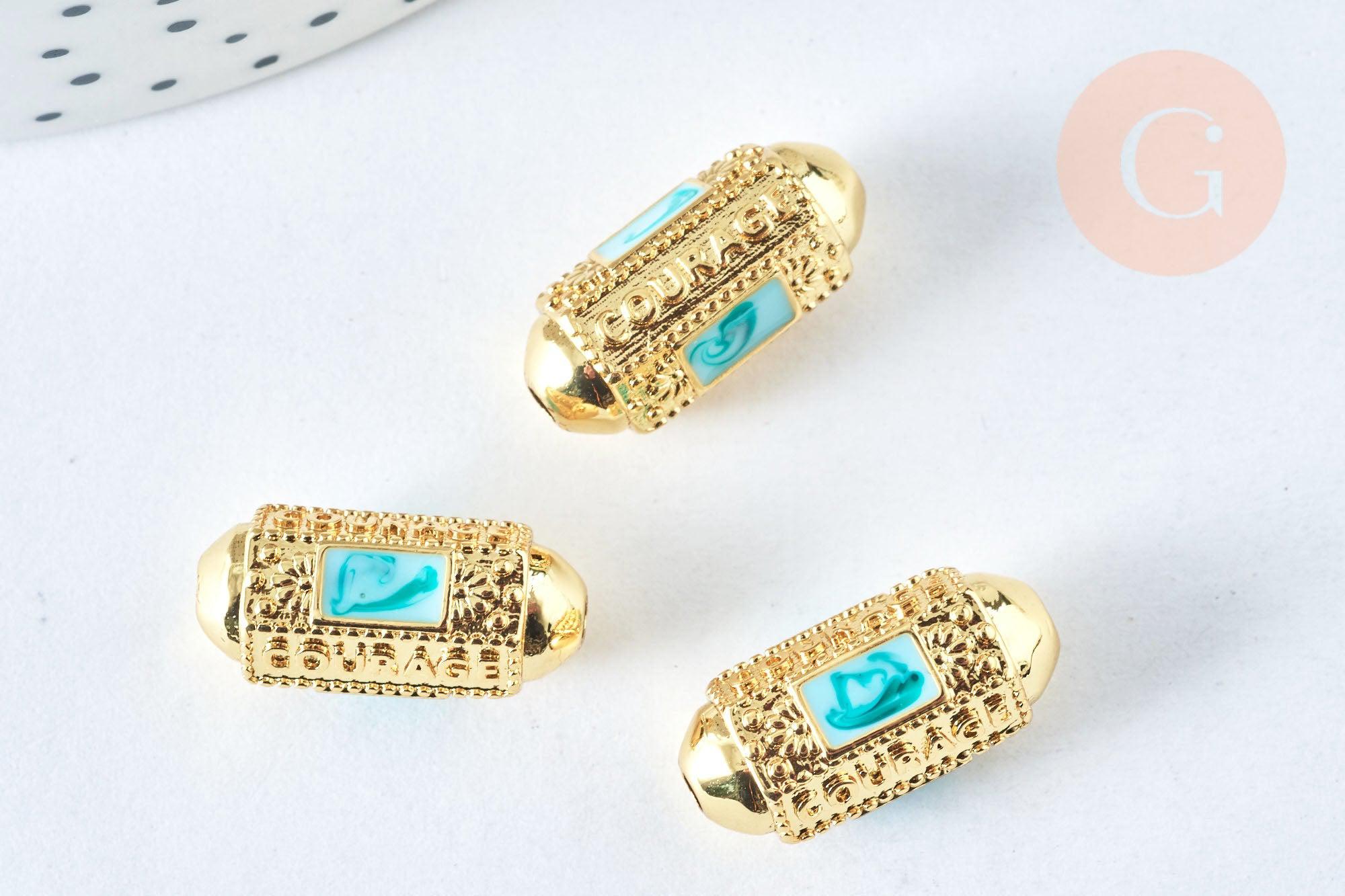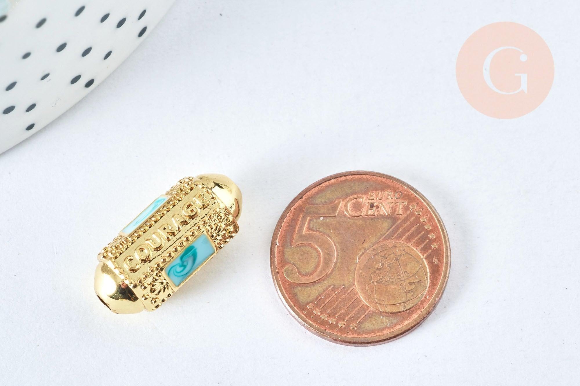 Cuenta talismán ovalada mensaje "coraje" esmalte oro azul 18k 20 mm, cuenta dorada con mensaje para creación de joyas, x1 G6993