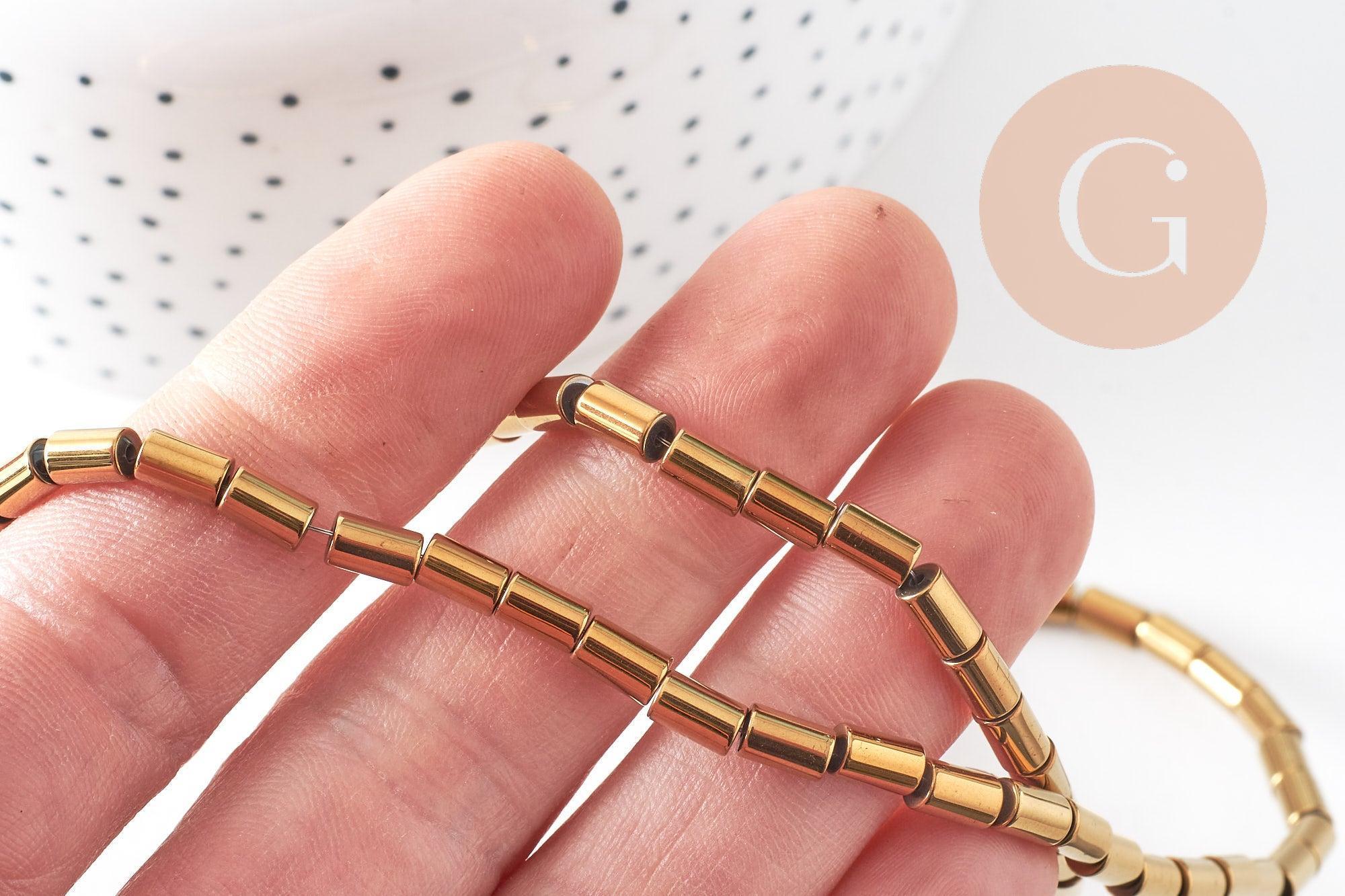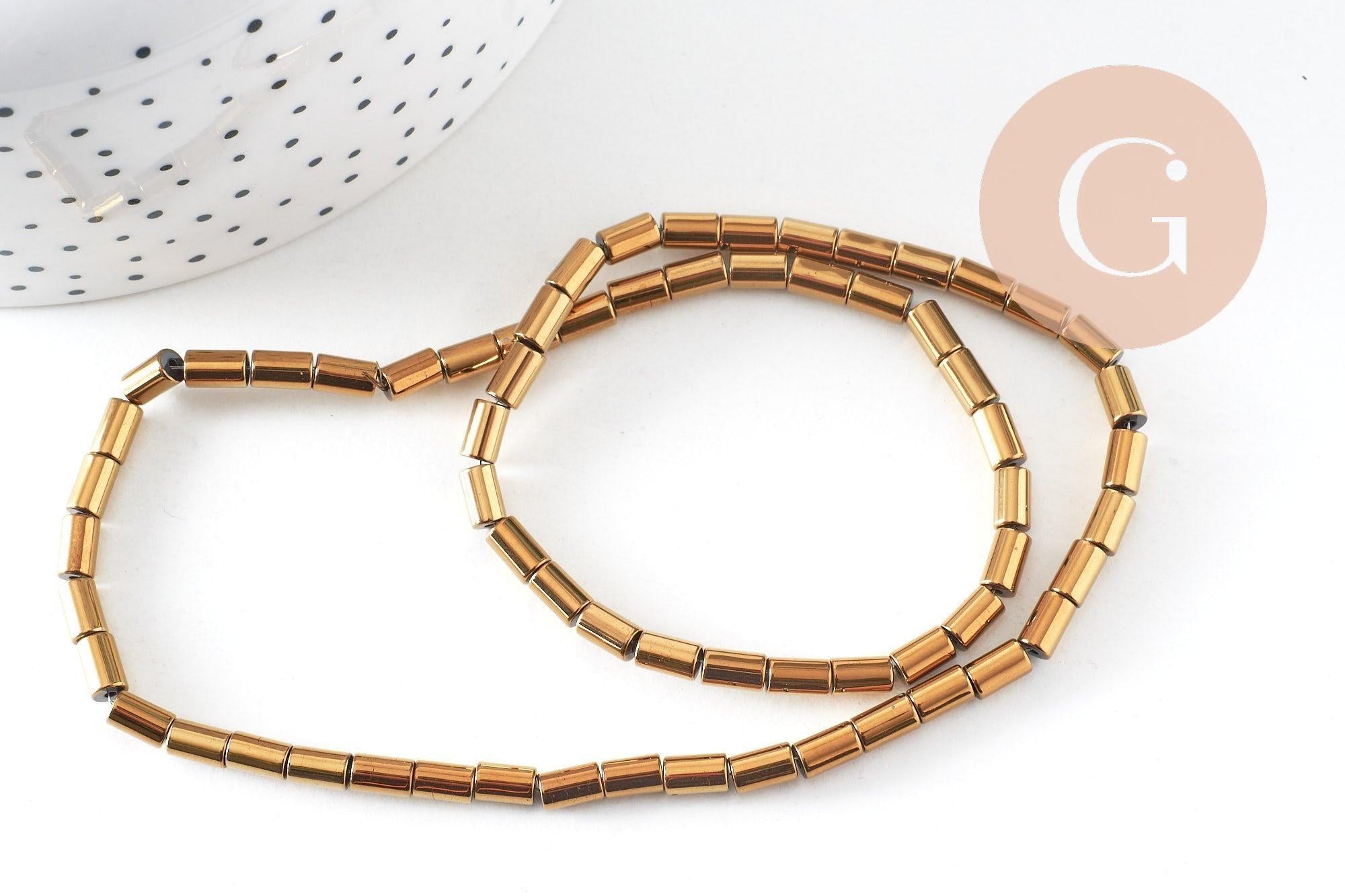Déjate seducir por estas cuentas de tubo de hematita sintética dorada, una piedra fina con un gran efecto.