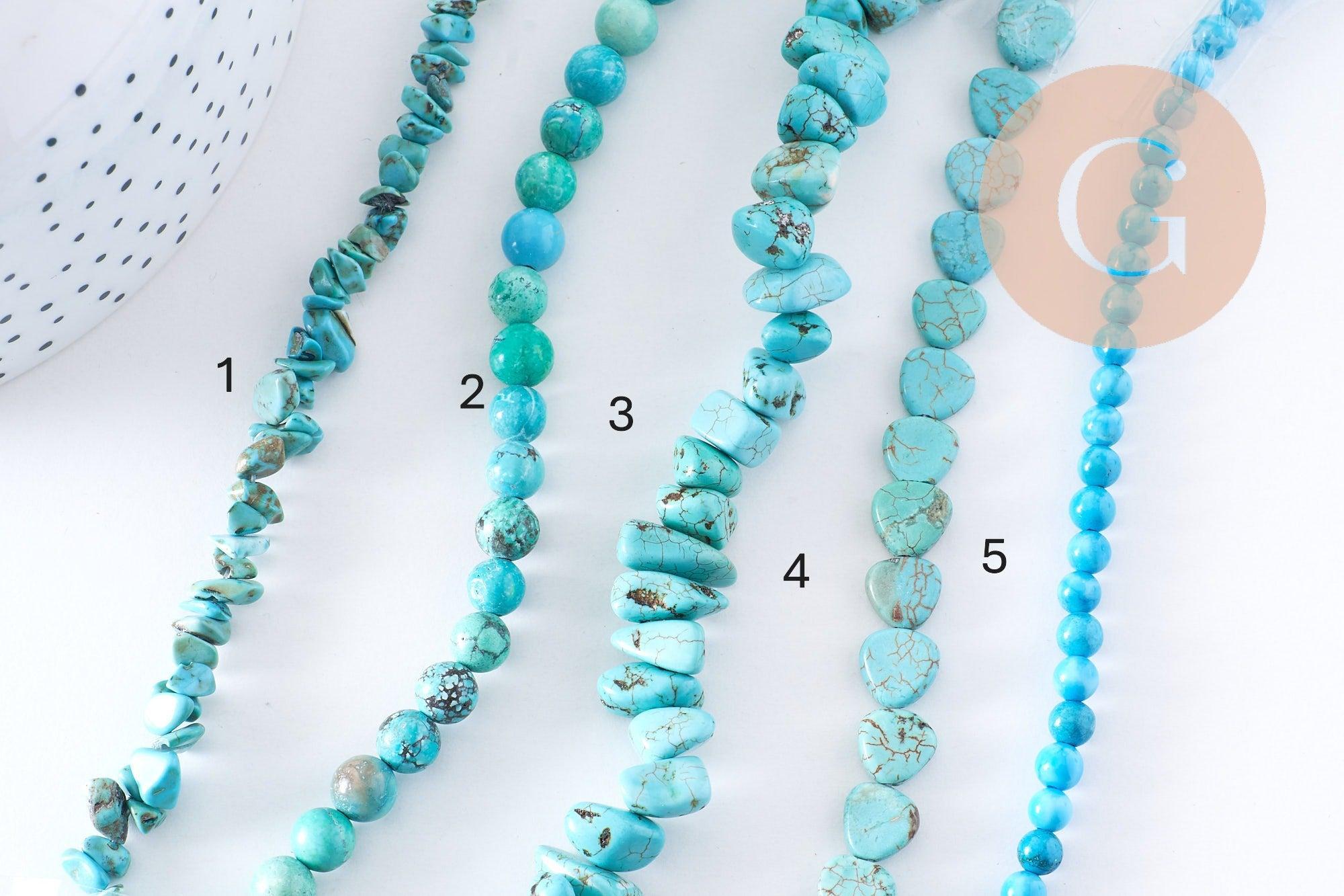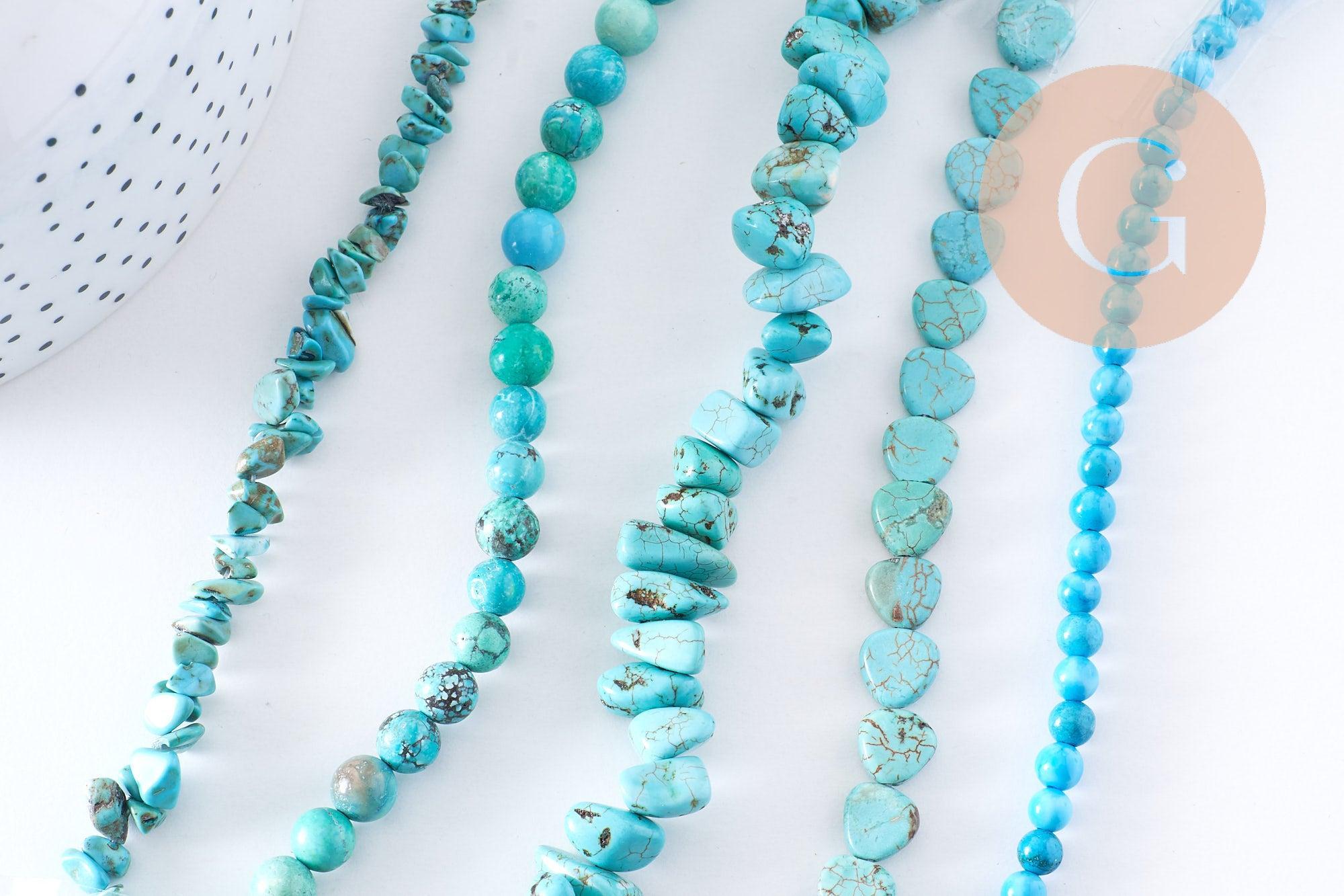 Dale un toque bohemio a tus creaciones con estas cuentas de howlita con tonos turquesa natural . Talladas en una piedra natural con vetas características, aportarán autenticidad y color a tus collares, pulseras o pendientes.