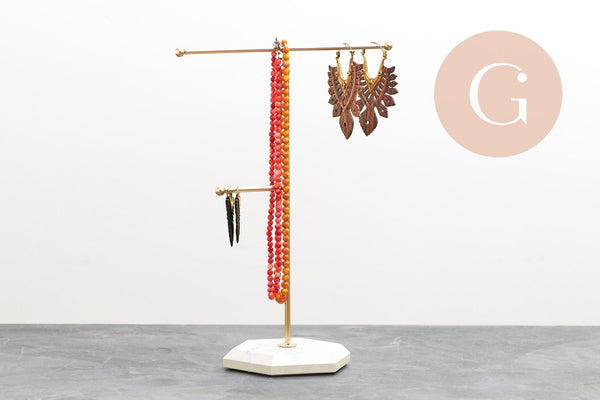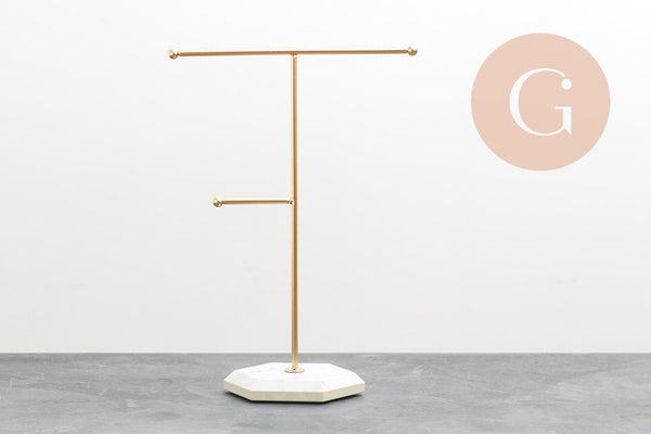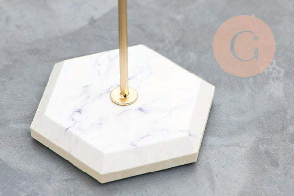 Mejora el estilo de tus aretes con este exhibidor de metal en tono dorado de 2 barras . Su diseño refinado y moderno con pie marmolado asegura una presentación elegante y estable.