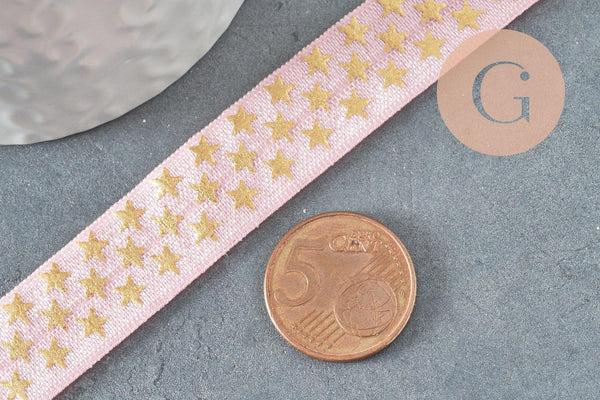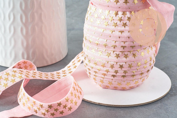 Te encantará esta cinta elástica ancha con estampado dorado sobre fondo rosa.