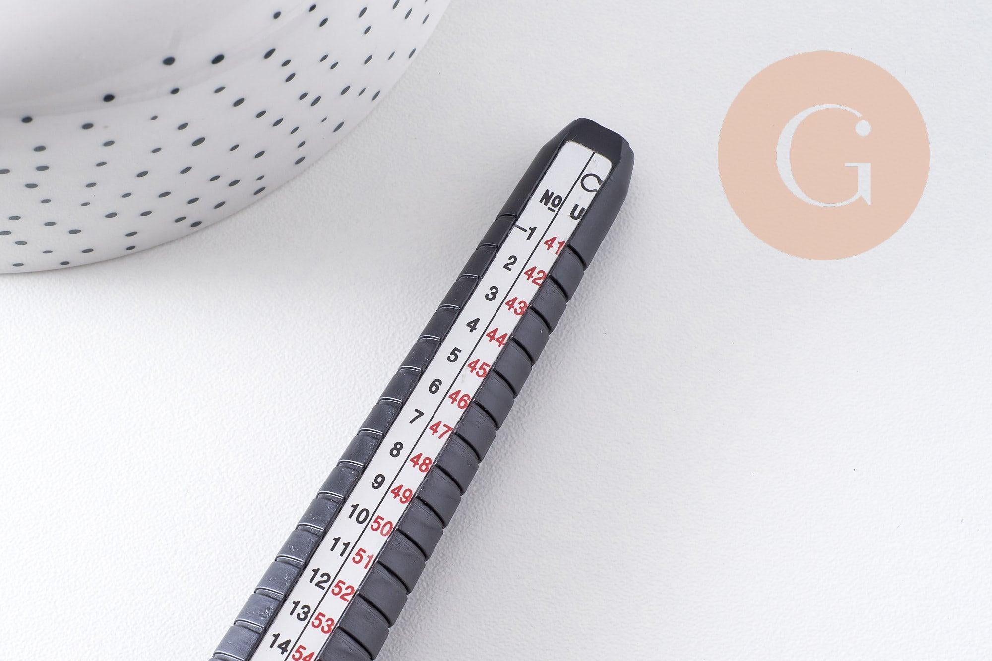 Gracias a su marcado doble (tallas UK y US ) o cuádruple (tallas US, Europeas, Japonesas y Hong Kong ), es perfecto para medir o comprobar el diámetro interior de tus anillos.