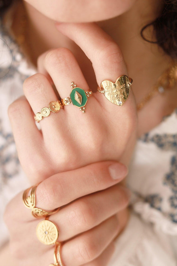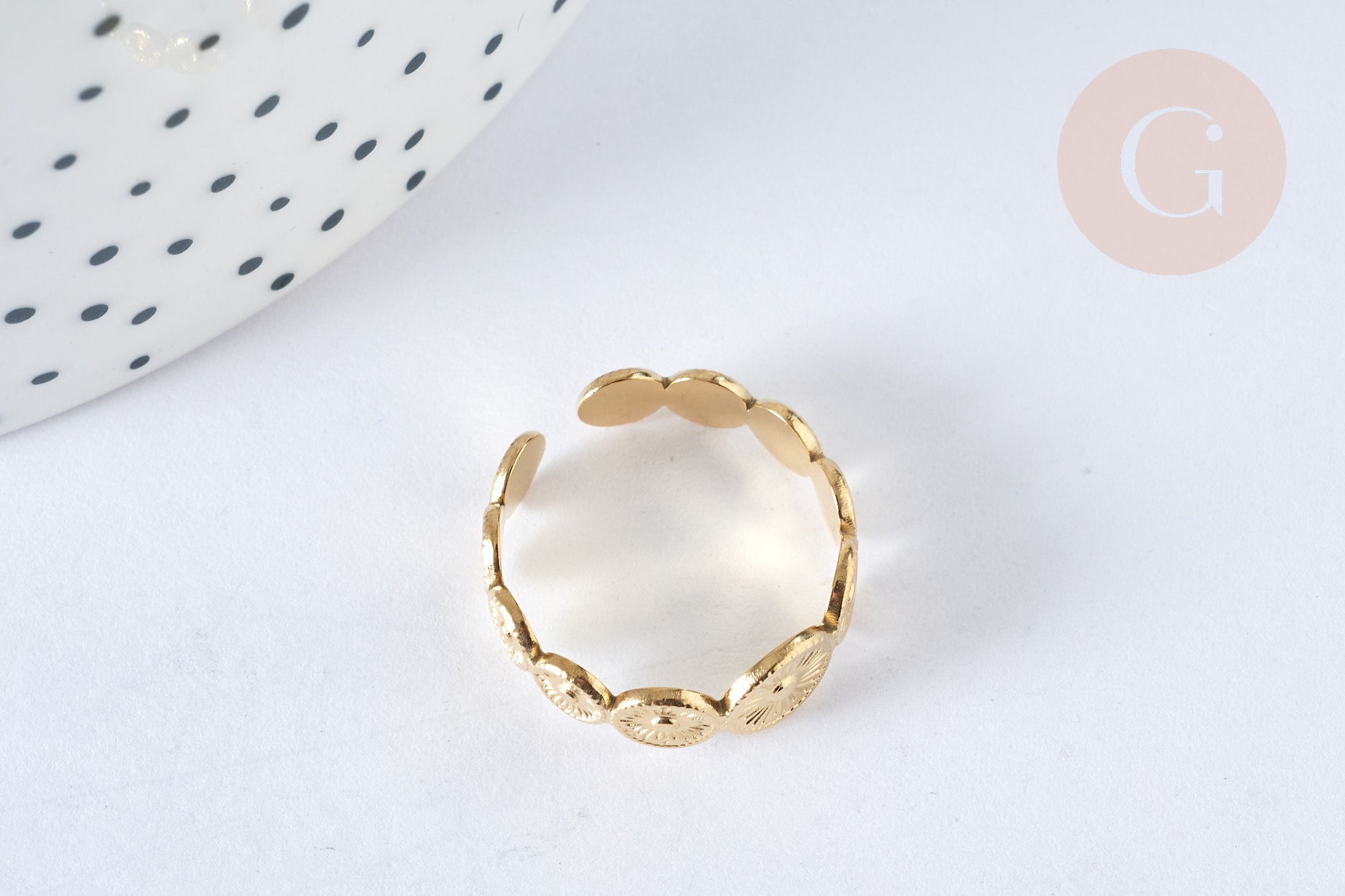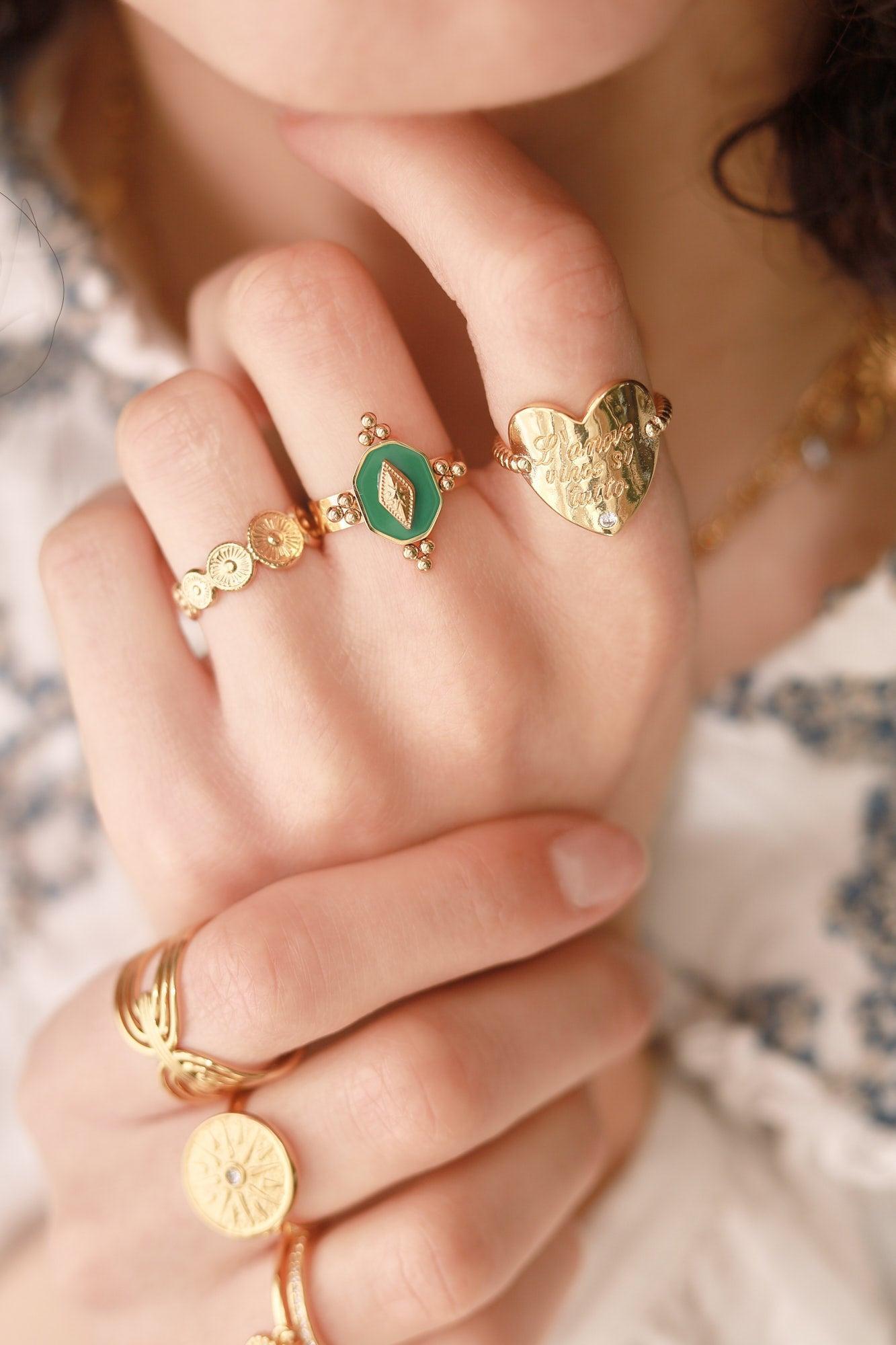 An adjustable stainless steel ring made up of textured circles . A timeless piece of jewelry with vintage charm, which will accompany you every day.