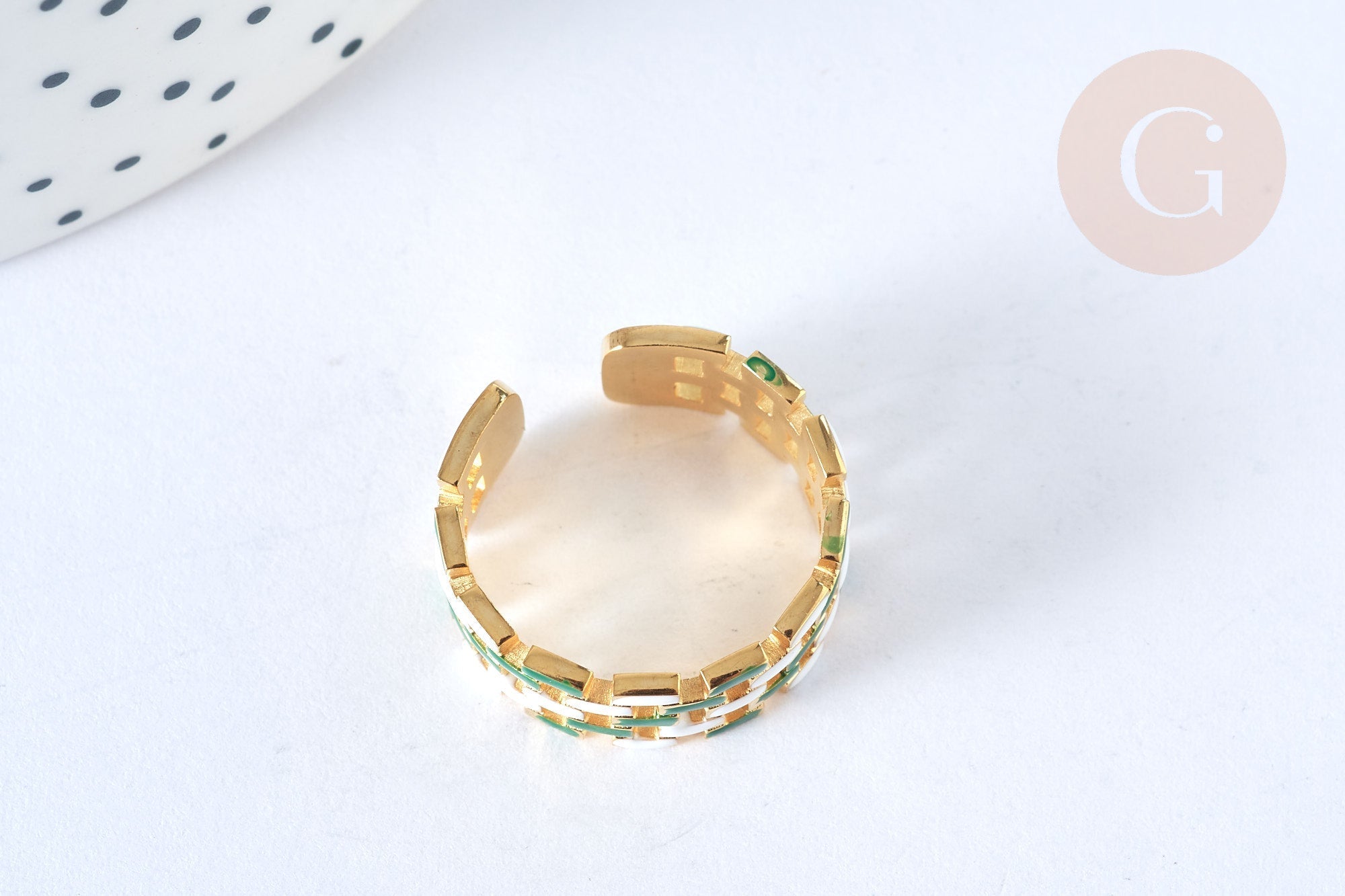EP-Adjustable ring with crossed mesh, gold-plated stainless steel, white and green enamel, size 54, x1 (G7001)