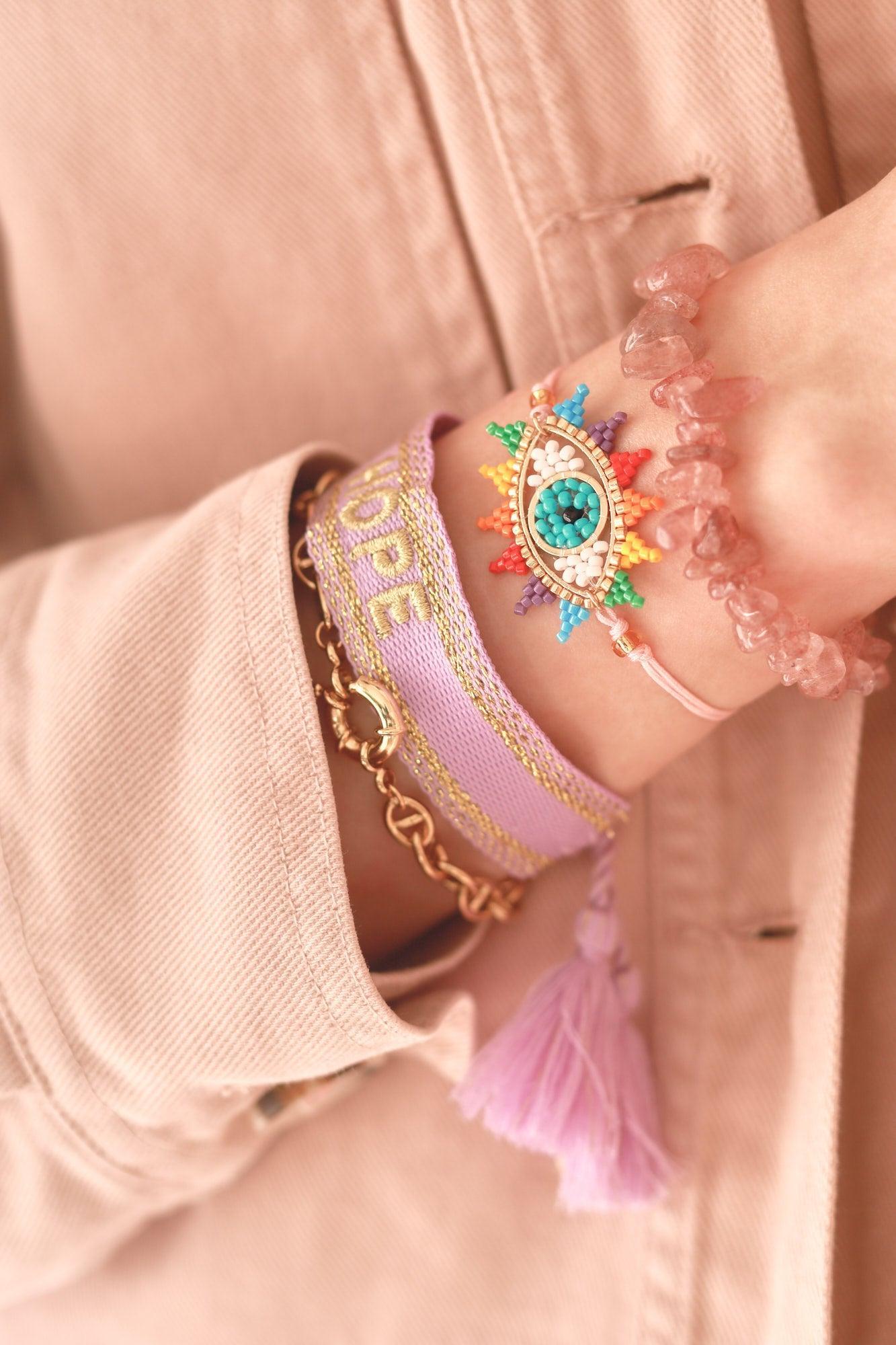 The HOPE or J'ADORE signature is embroidered on the front of the bracelet, adding a touch of charm to this accessory. The sliding tassel closure allows for easy and comfortable adjustment for all wrist sizes.