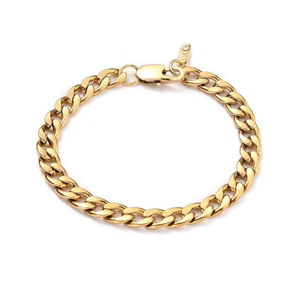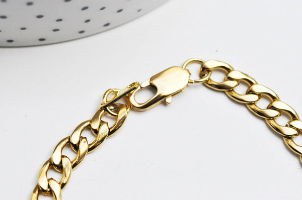 A unisex bracelet in 14k gold-plated steel, made from large stainless steel gold-plated mesh, finished with a lobster clasp and a small medal.