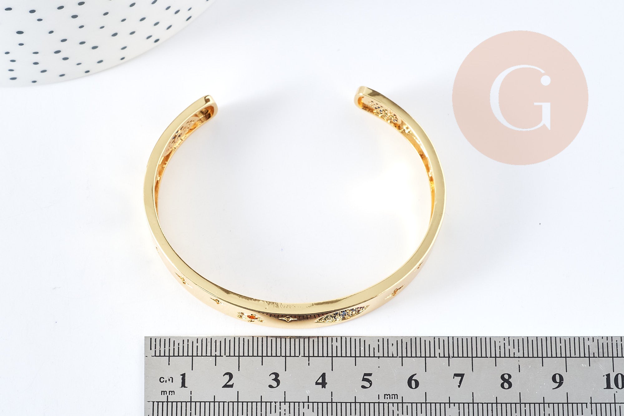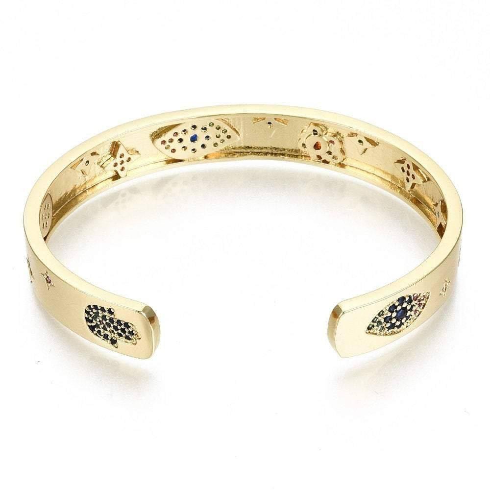 Crafted from high quality gold-plated brass, this bangle bracelet is adorned with sparkling colored zircons arranged in a protective eye pattern . The zircons add a touch of shine and sophistication to the bracelet, making it perfect for special occasions or to add a touch of sparkle to your everyday outfit.