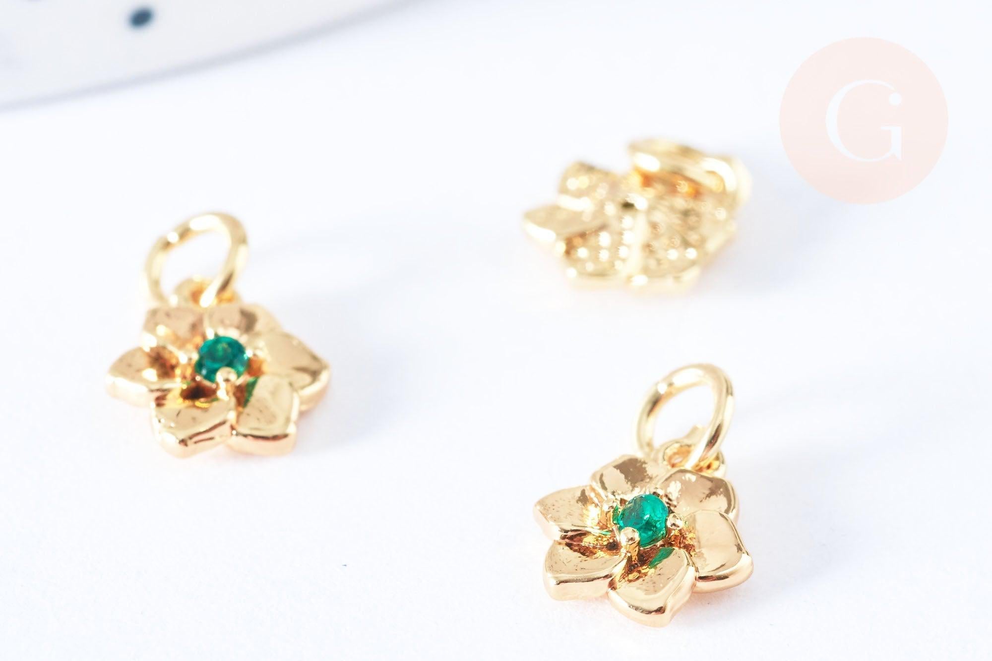 Breloque fleur laiton doré 18k zircon vert 9.5mm, pendentif création bijoux doré, x1 G6944