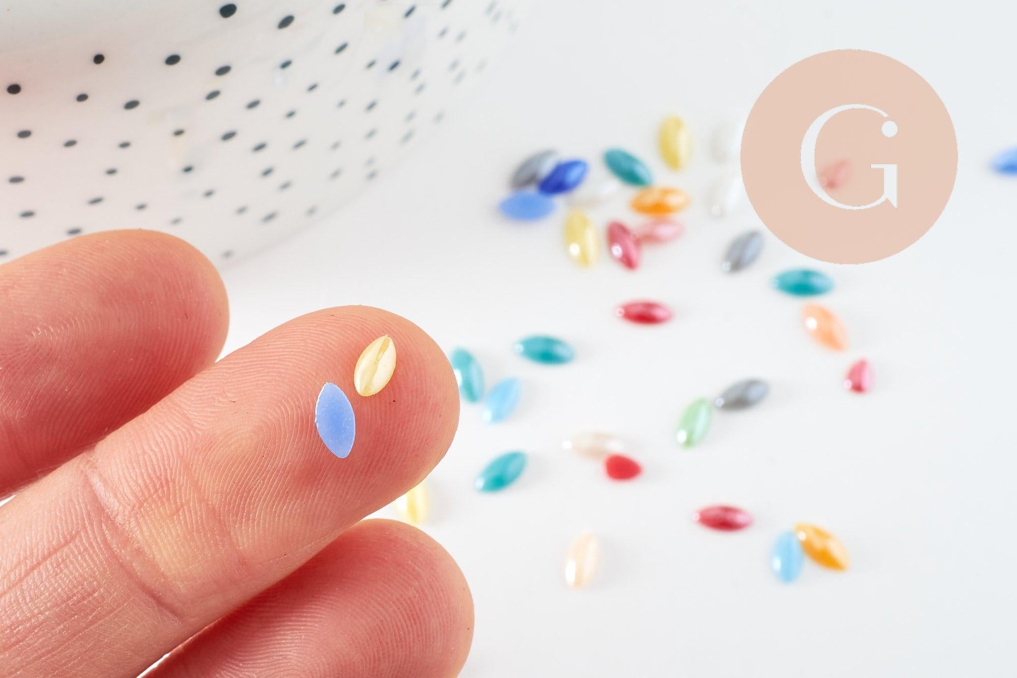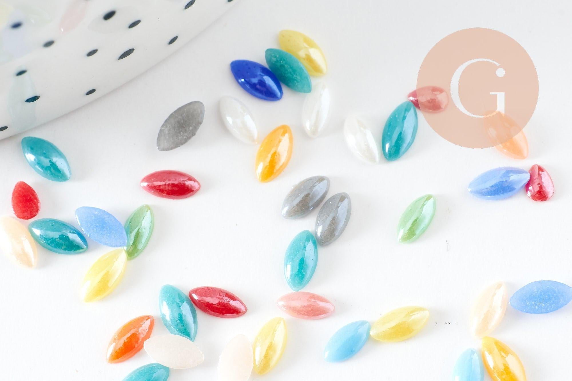These handmade, marquise-shaped cabochons in iridescent glass, available in a variety of colors, are ideal for creating a wide range of costume jewelry. Add a touch of originality to your pieces by setting them on a ring, adding them to a bracelet, or incorporating them into cuffs. Sold in sets of 20.