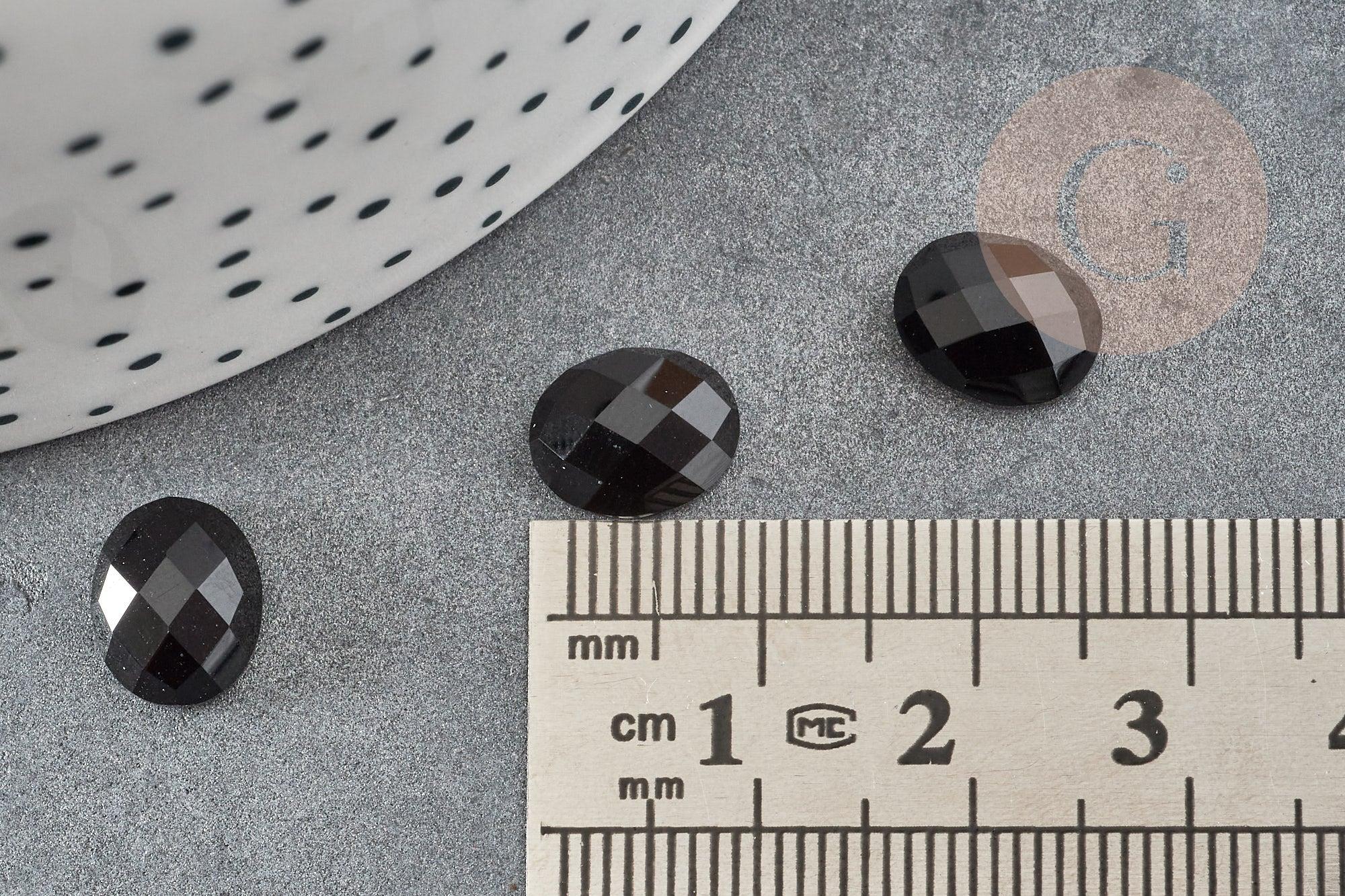 This natural black agate faceted oval cabochon measures 10x8mm and features an intense black color accompanied by a faceted finish that catches the light elegantly.