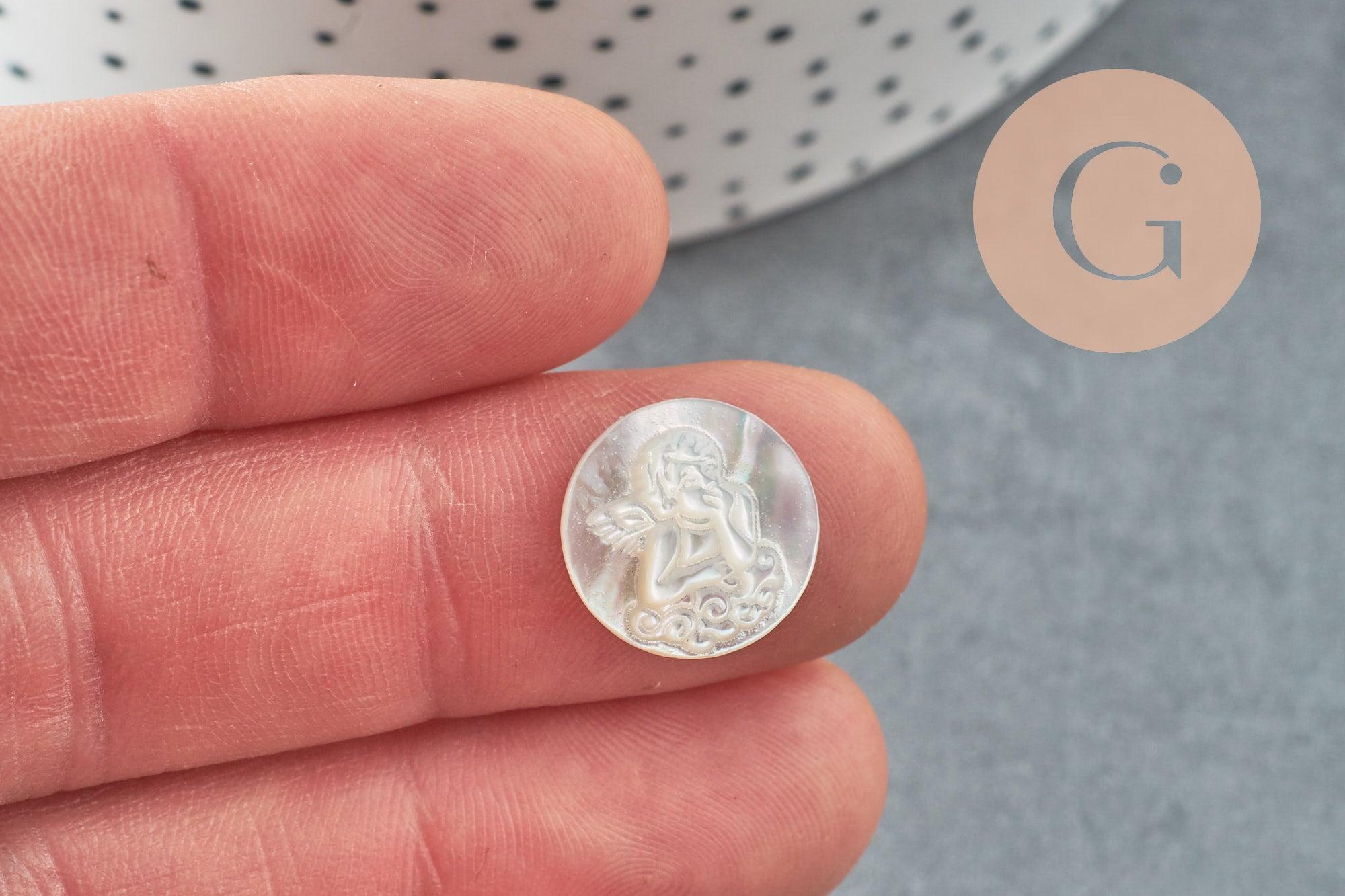 Add a delicate touch to your DIY costume jewelry creations with this natural white mother-of-pearl round cabochon engraved with an angel .