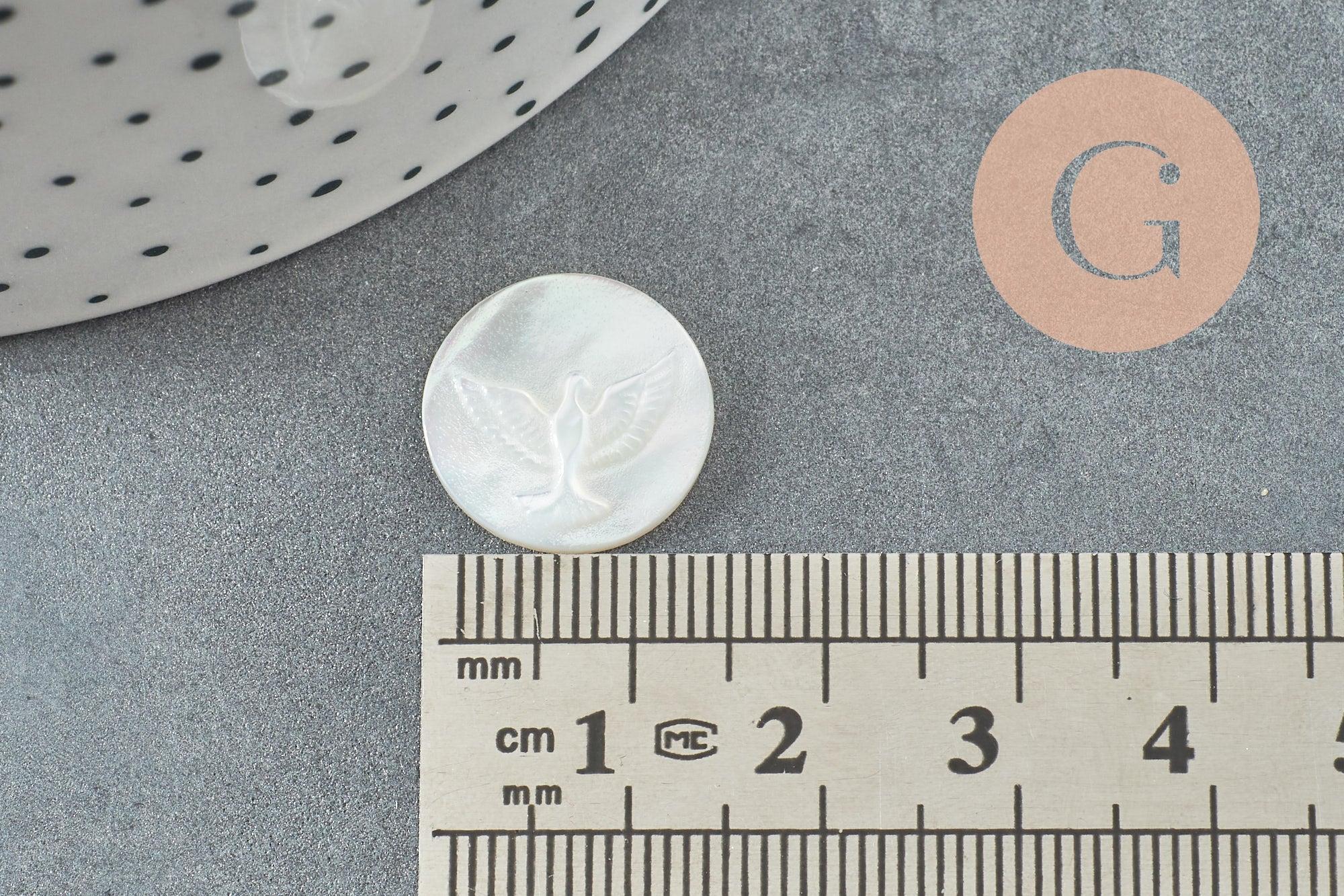 Fall for this round cabochon in natural white mother-of-pearl engraved with a dove