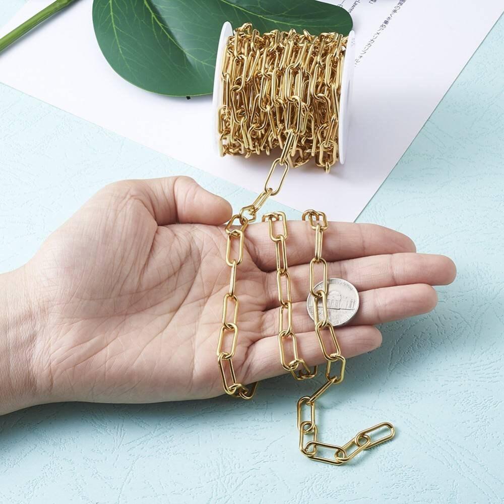 Gold-plated steel chain, rectangular mesh, necklace chain, jewelry creation, wide chain, 17x7mm, sold by the meter, G2408 To quickly make your jewelry, Gingerily offers you this golden rectangular chain in gold-plated brass. To make modern jewelry. Combine with large marine...