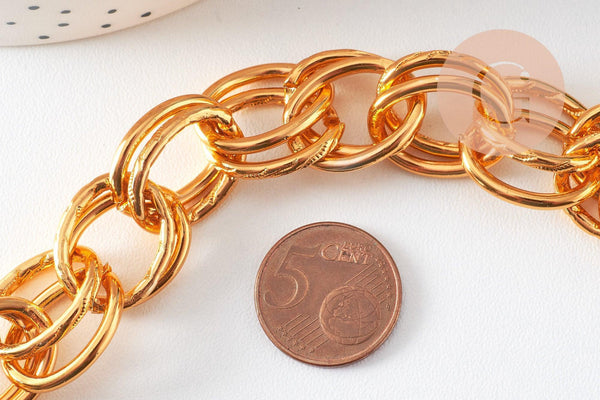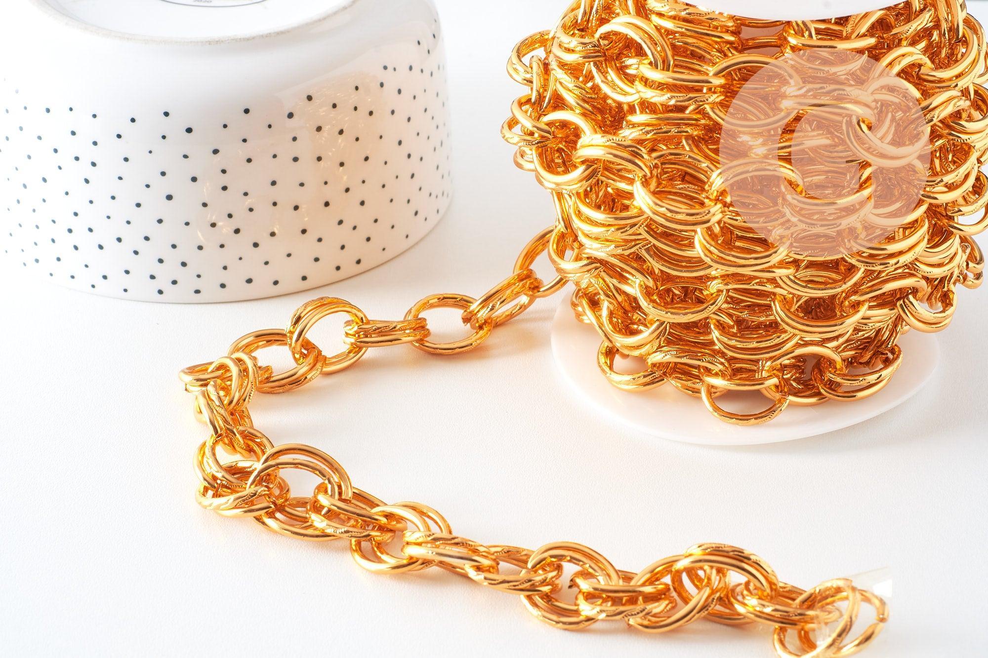 Make a statement with this textured double rollo link chain in gold aluminum , with a solid and elegant look . Its large, unwelded oval links , with a slightly hammered finish, make it an ideal base for creating statement jewelry or trendy fashion accessories .