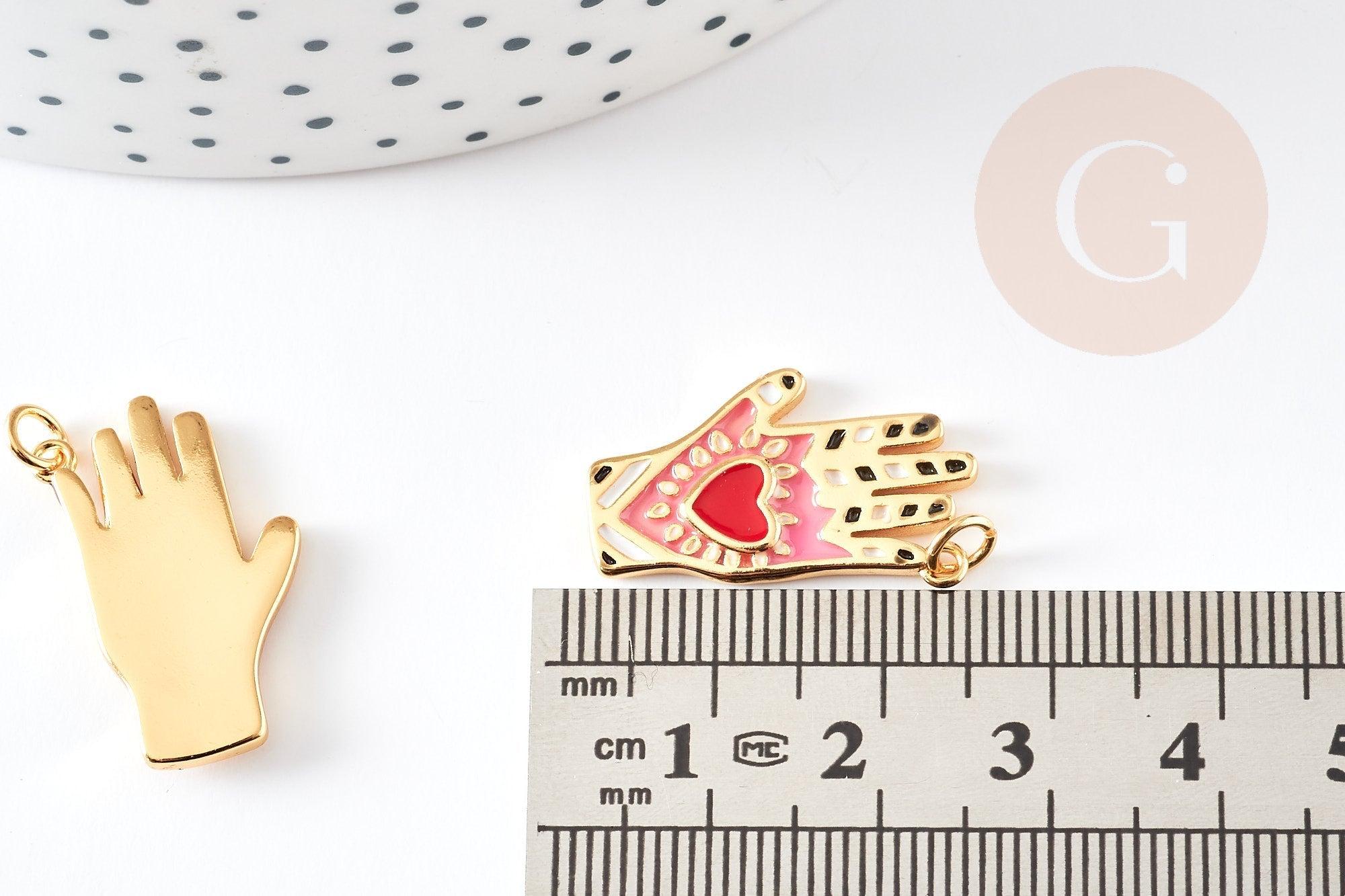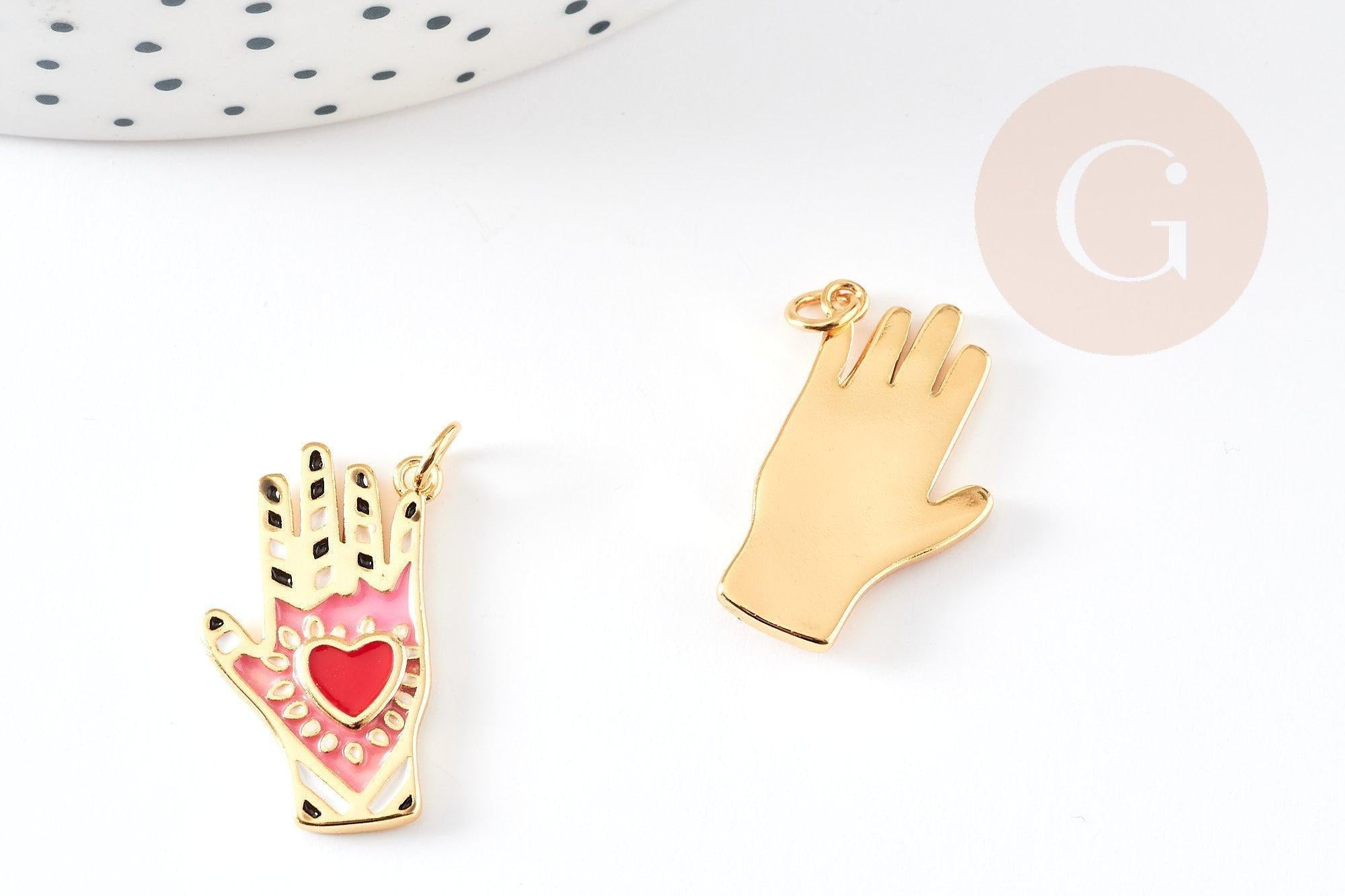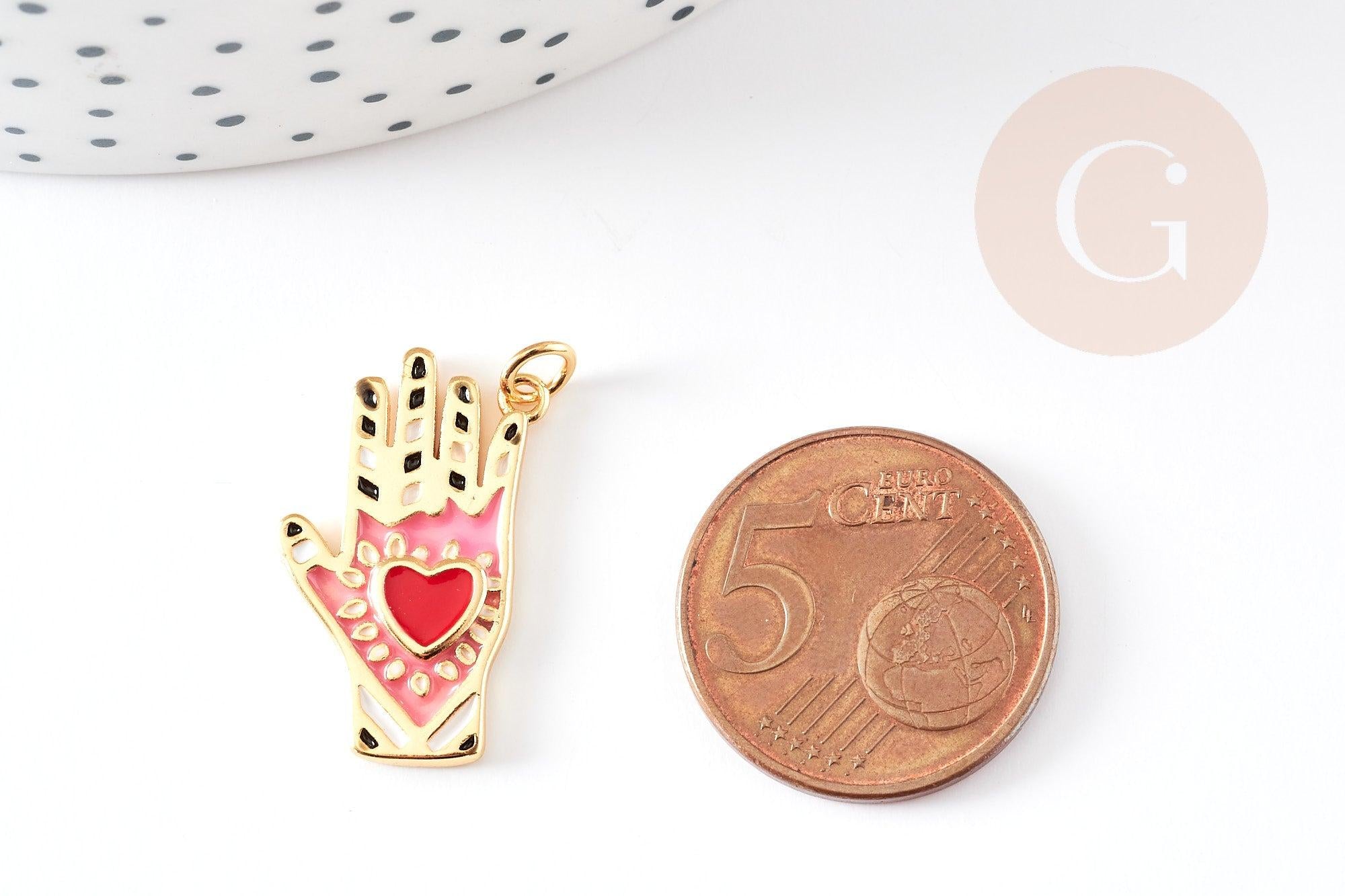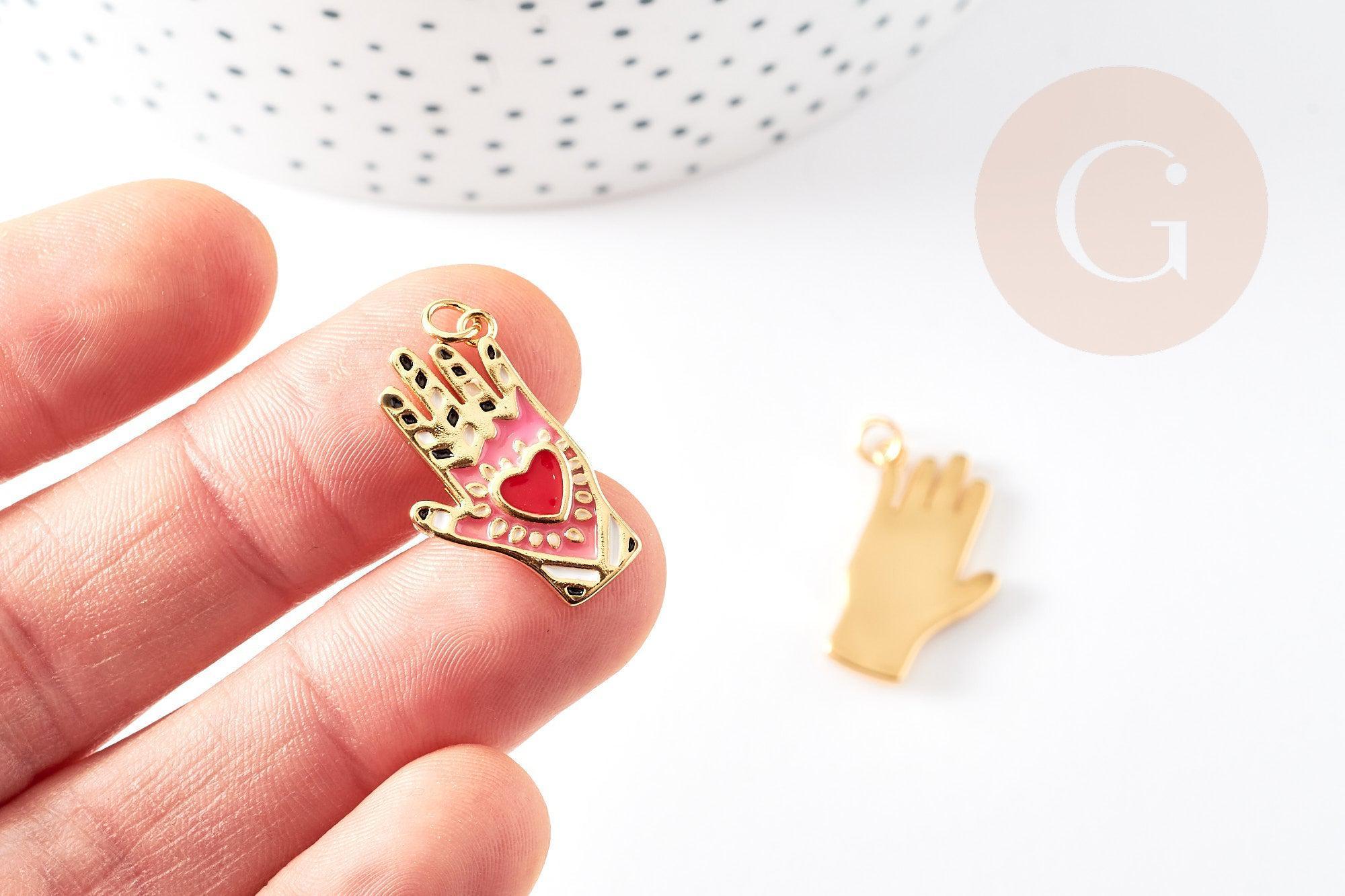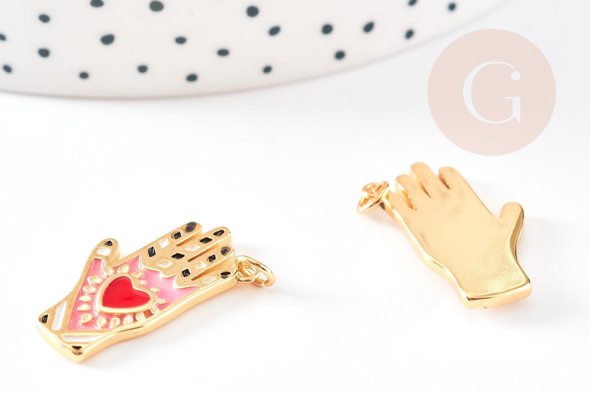 To create magnificent necklaces, earrings and bracelets, adopt this hand of fatma , a small religious pendant and a lucky charm in golden brass, decorated with a heart and enameled motifs.