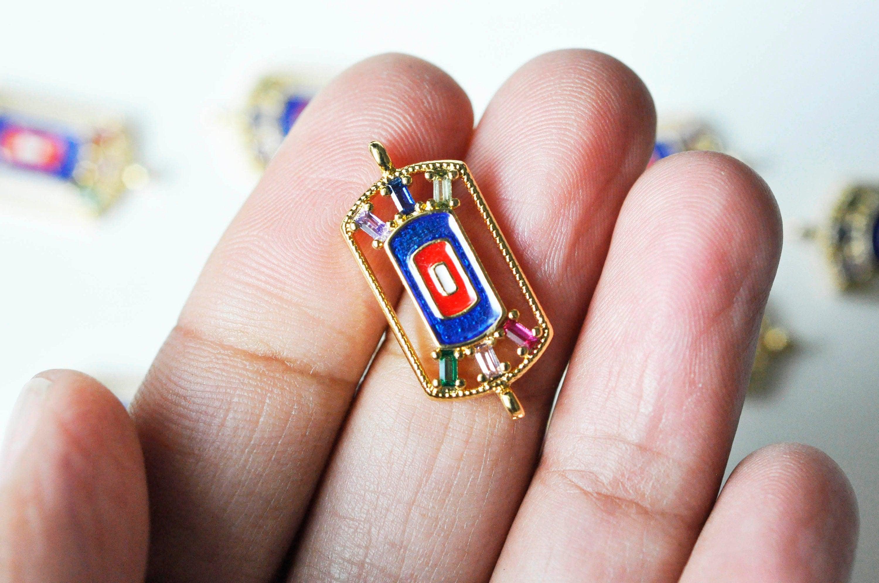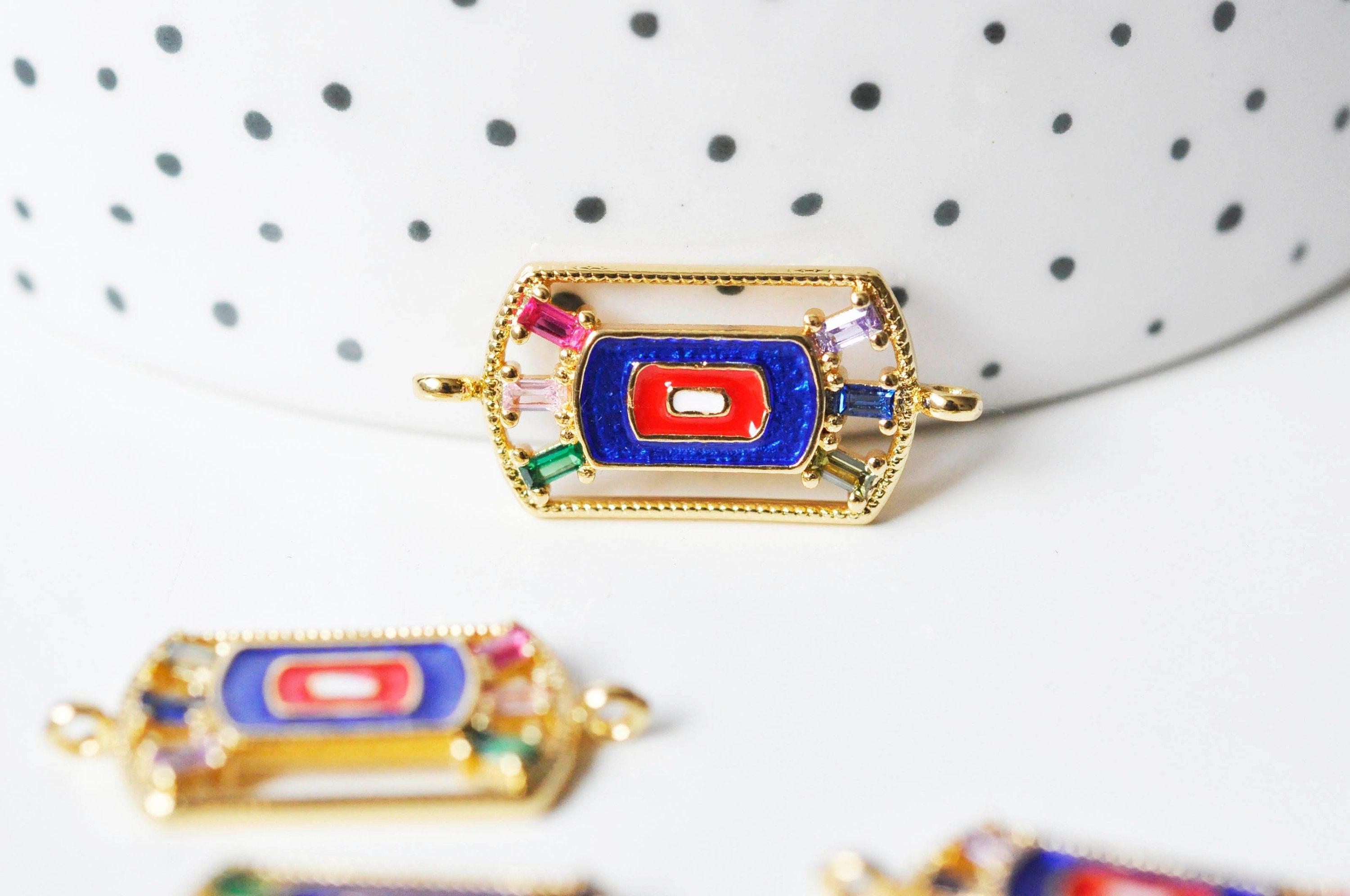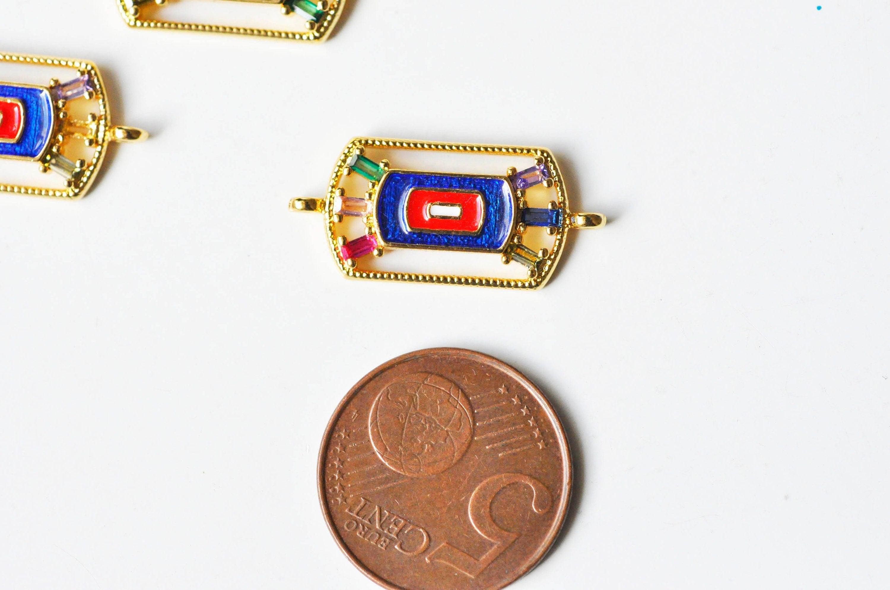 For your talisman bracelets, here are some magnificent rectangular connectors in gold-plated brass, enameled in red and blue and decorated with colored zircons. An original pendant that you can embellish with a stone or pearls. Dimensions: Length: 26.5mm Width: 12.5mm...