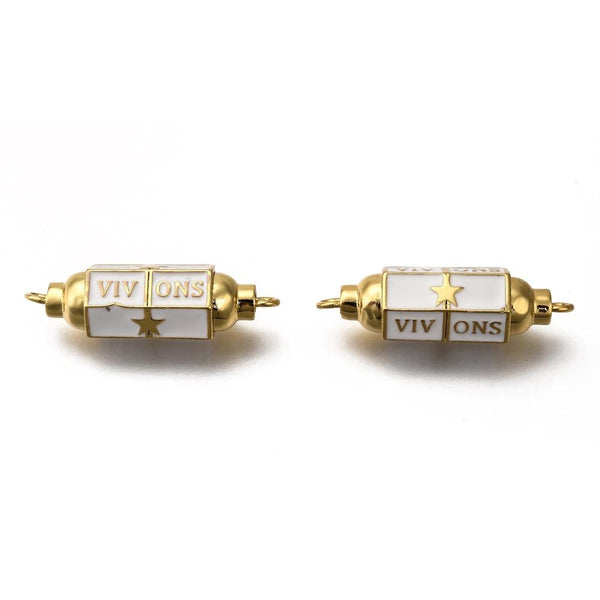 For your trendy talisman bracelets and necklaces, here is a magnificent tube connector in gold-plated brass, enameled in white and decorated with the word "VIVONS". An optimistic pendant that you can embellish with a stone, pearls on one of our...